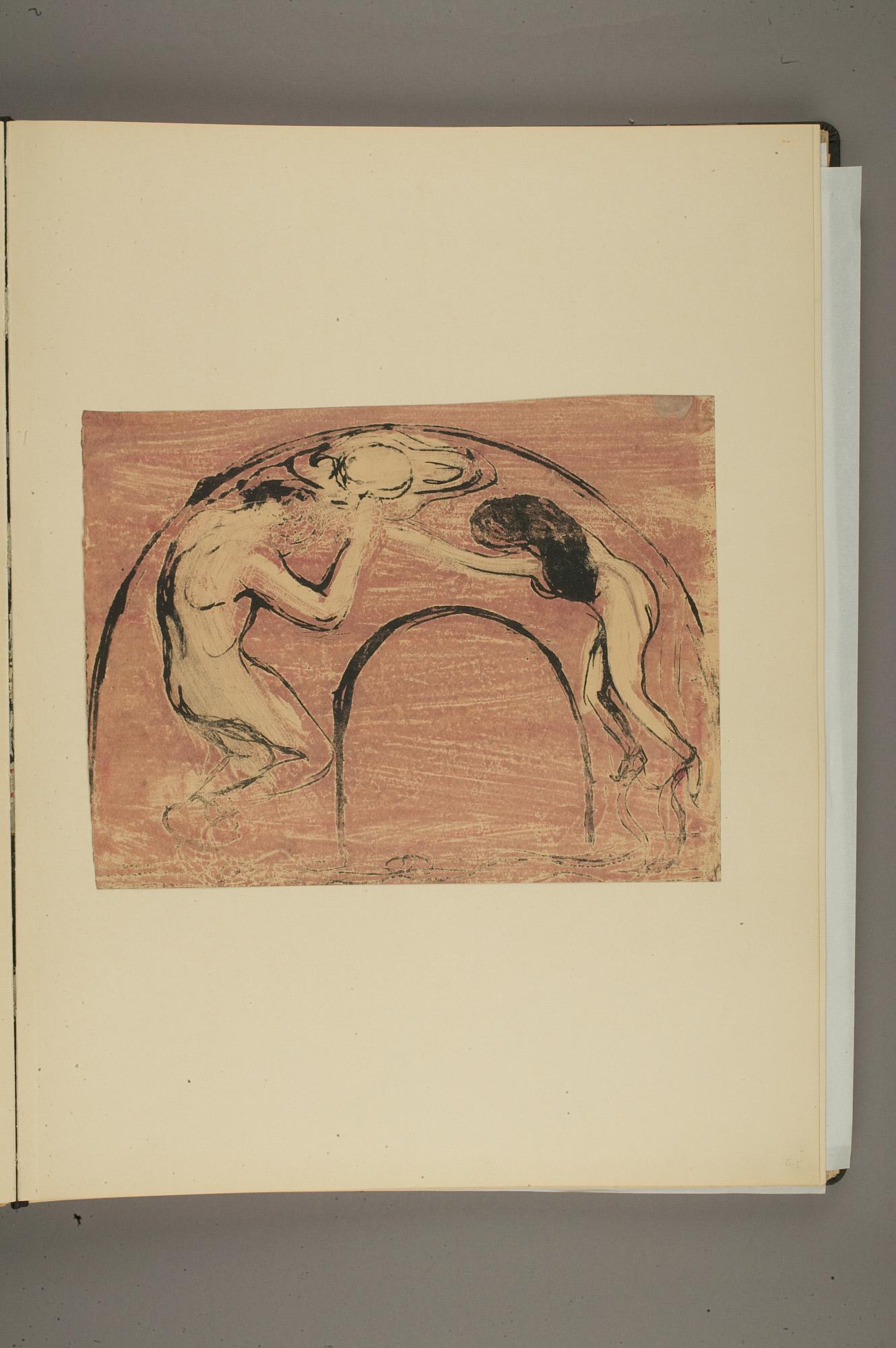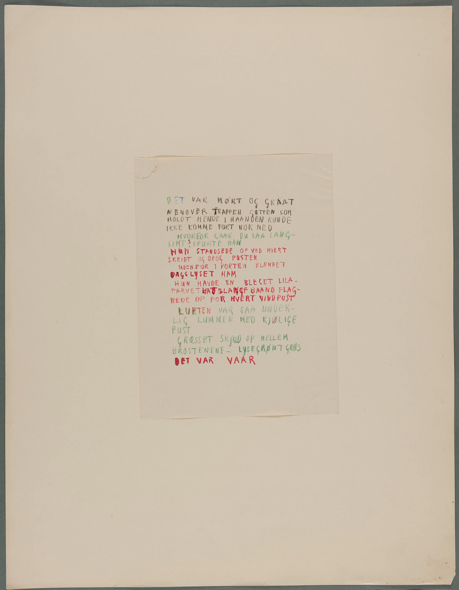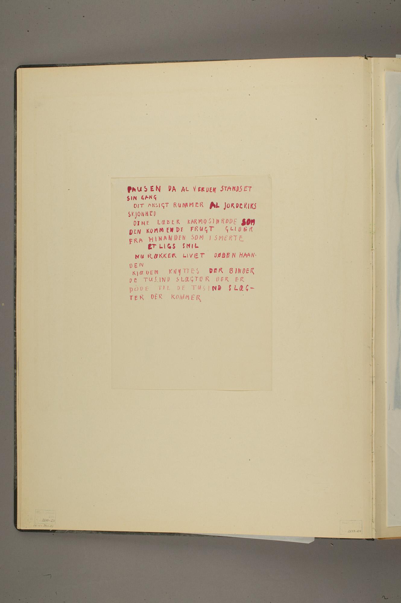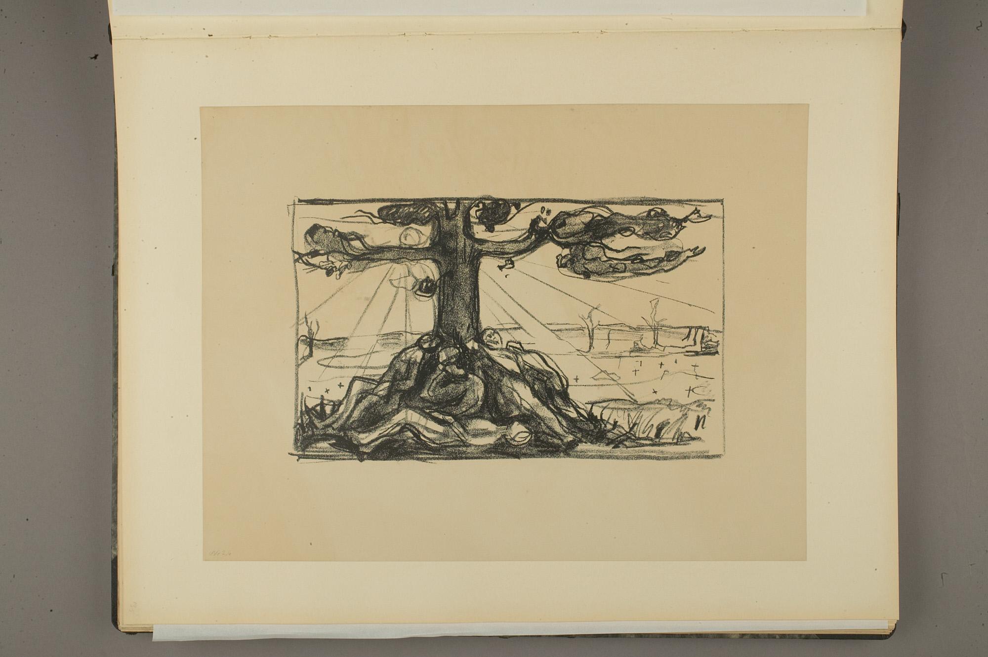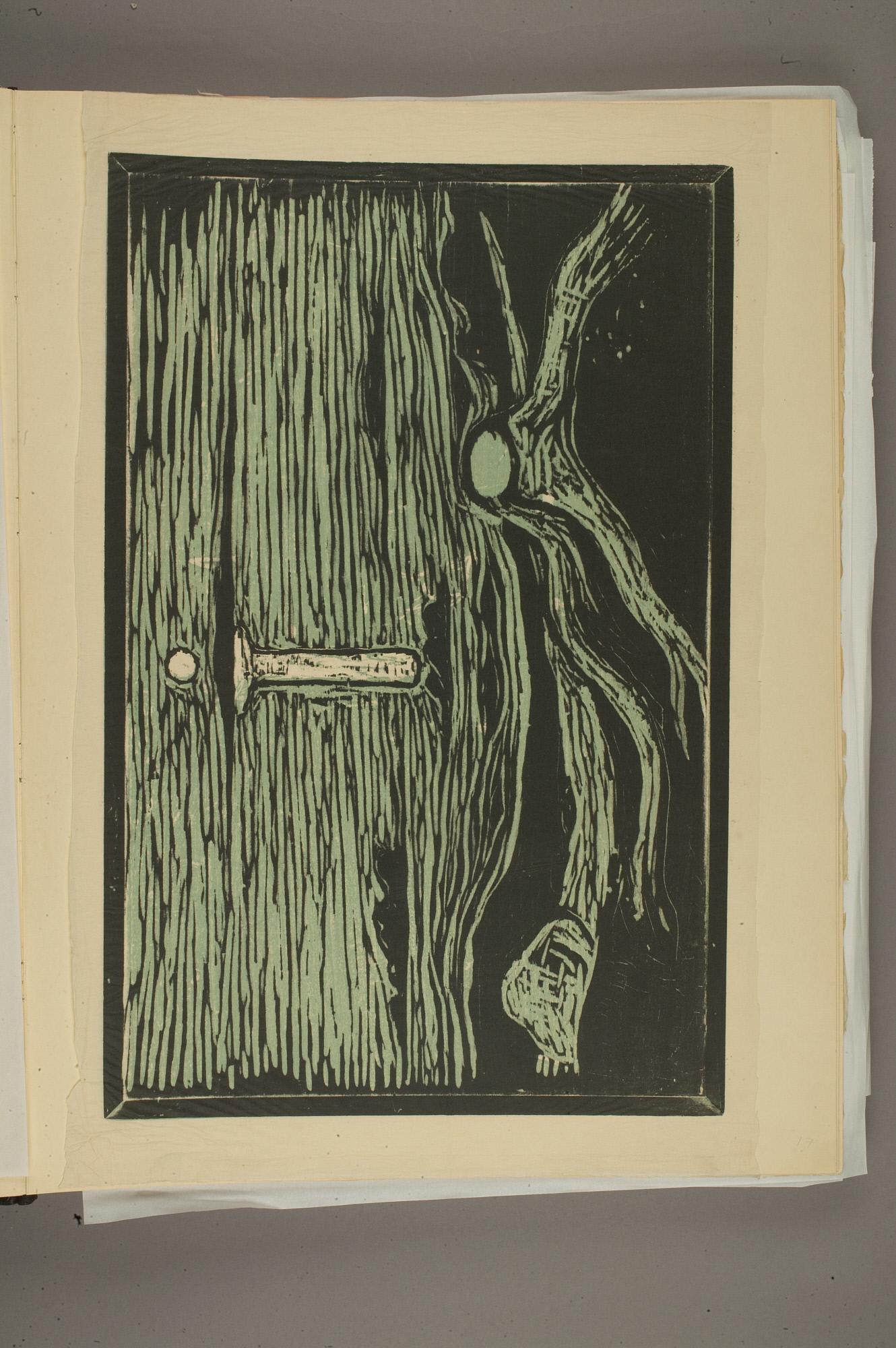 Comment:I Munchmuseet finnes det en tykk perm, der Munch har limt inn mange av de viktigste grafiske motivene, samt en del tegninger. I tillegg til 99 tykke innbundne kartongark, omfatter permen mer enn tyve løse ark, også de av kartong, som var stukket inn mellom de faste sidene, for det meste i permens første halvdel. På disse løse arkene har Munch skrevet en rekke tekster, oftest med mangefargede bokstaver og ikke sjelden illustrert med tegninger, som enten er fastlimt eller tegnet direkte på kartongen. Blant disse løse tekstsidene er det en tittelside der den bibelske teksten "KUNSKABENS TRÆ PAA GODT OG ONDT" er skrevet med grønn og rød fargestift (MM.T.02547-a03). Selv om det er lite som tyder på at de løse sidene og selve permen opprinnelig var planlagt som en enhet, har likevel hele boken blitt kjent som "Kunnskapen tre".