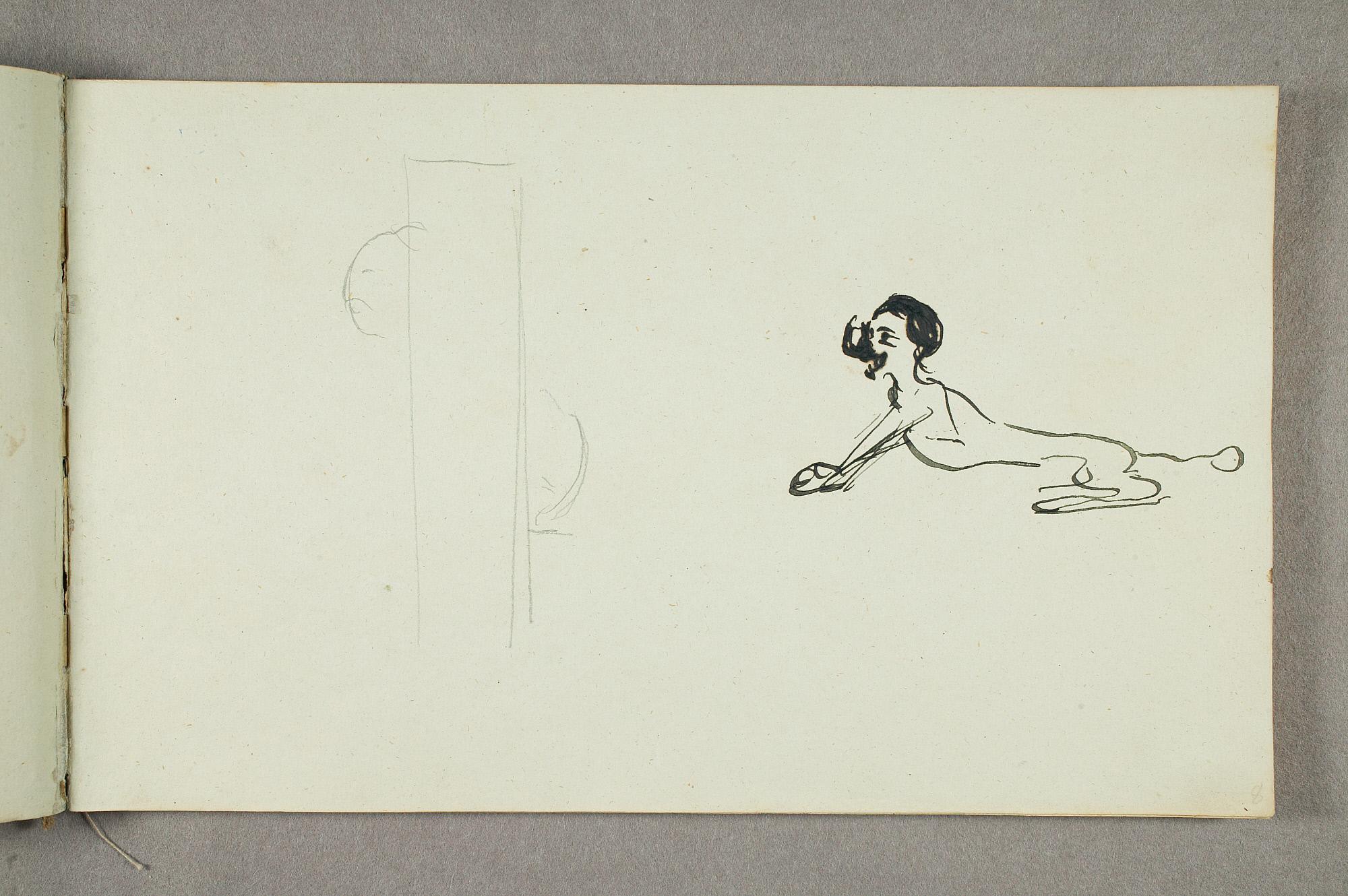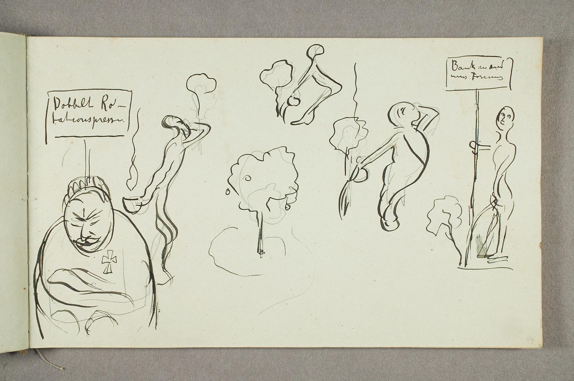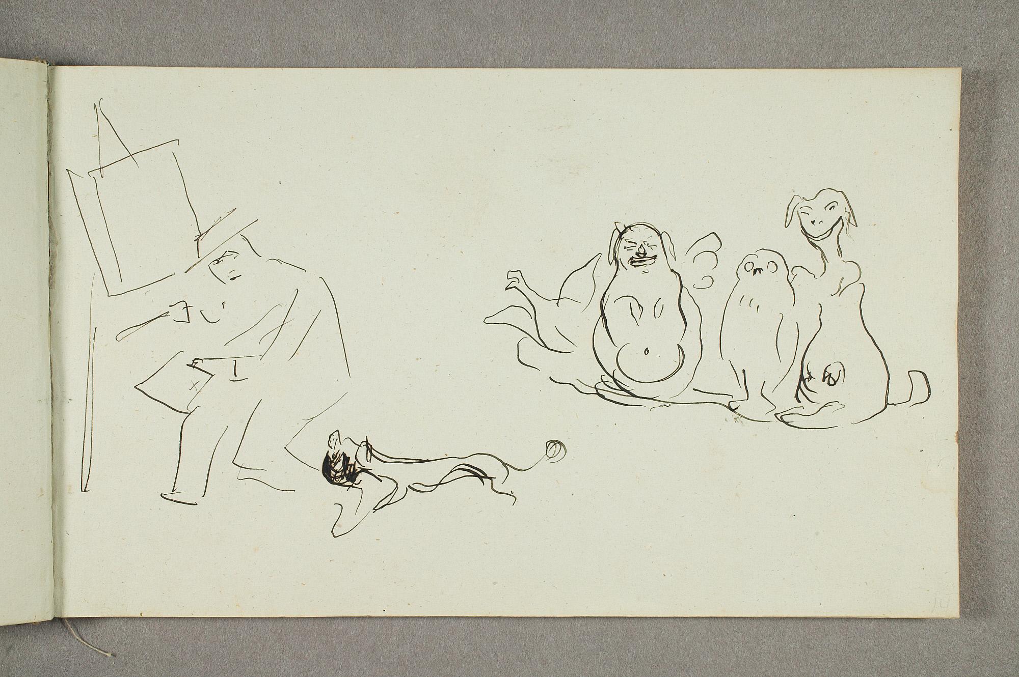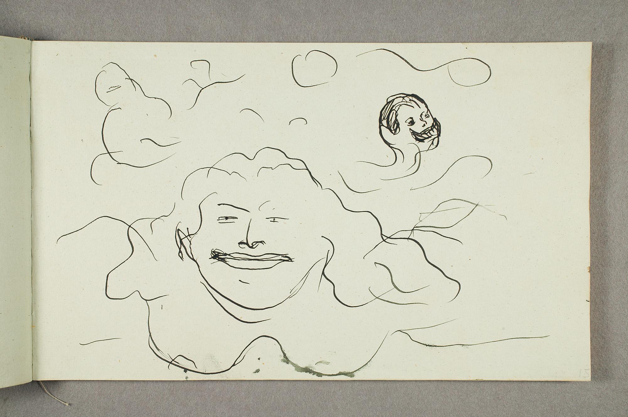 Comment:De fleste tegningene i denne skisseboken er karikaturer, der særlig Gunnar Heiberg og Sigurd Bødker får gjennomgå. Munch mente de hadde tatt Tullas parti etter bruddet i 1902, og produserte i flere år adskillige ondsinnede karikaturer av dem. Heiberg fremstilles gjerne som "paddegris", mens Bødker tildeles rollen som puddel. Flere av tegningene i denne boken ble også utført som litografier, datert til 1903. I siste del av boken er det en del landskapsskisser, som er vanskelig å plassere. Muligens kan de være fra Thüringen, og de gis derfor den litt videre dateringen 1903–05. (MB)