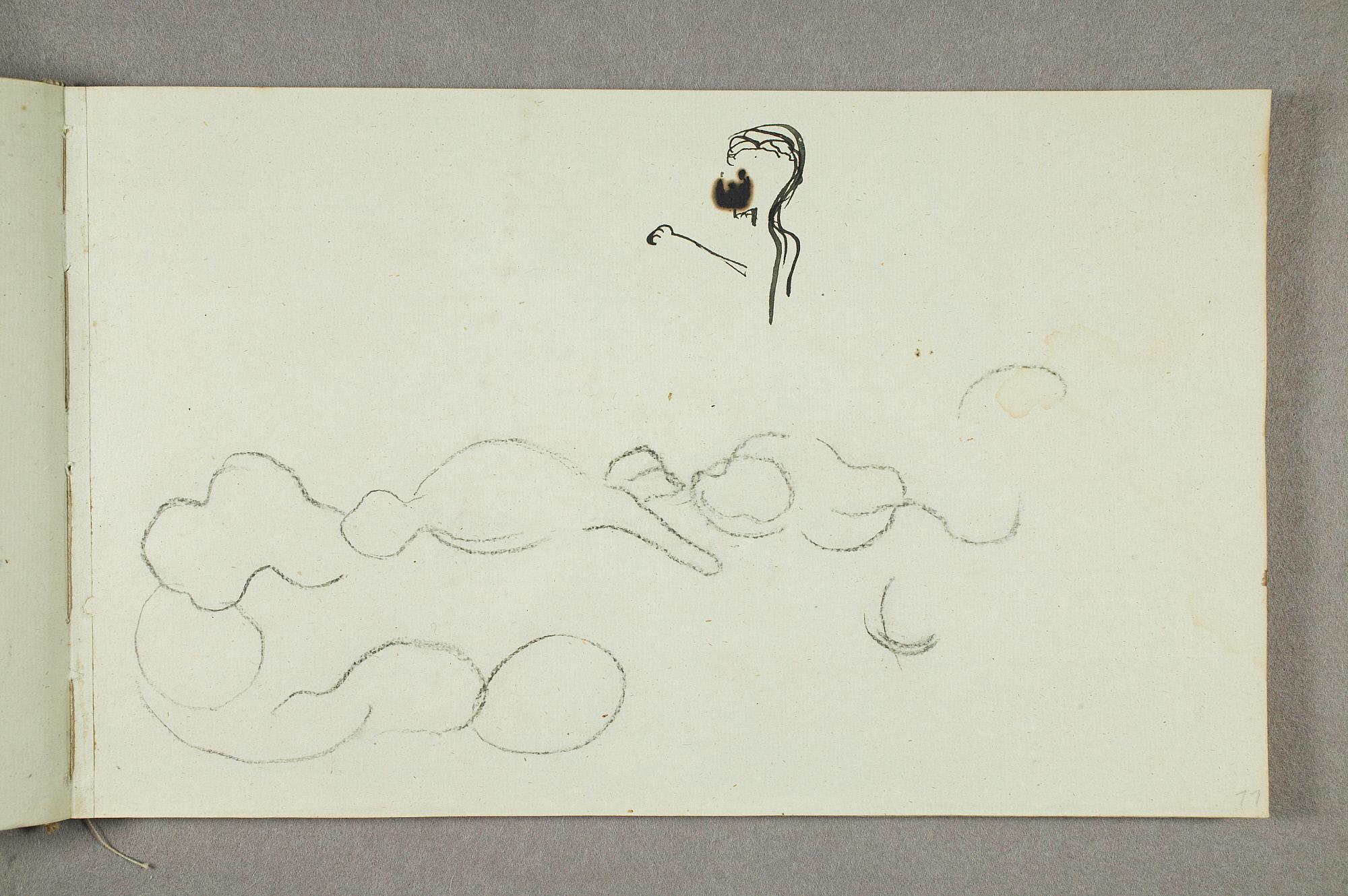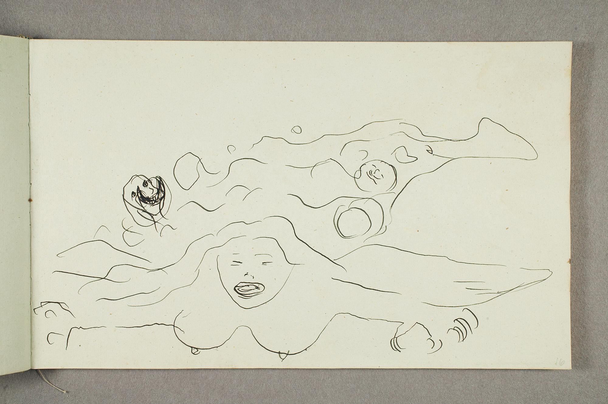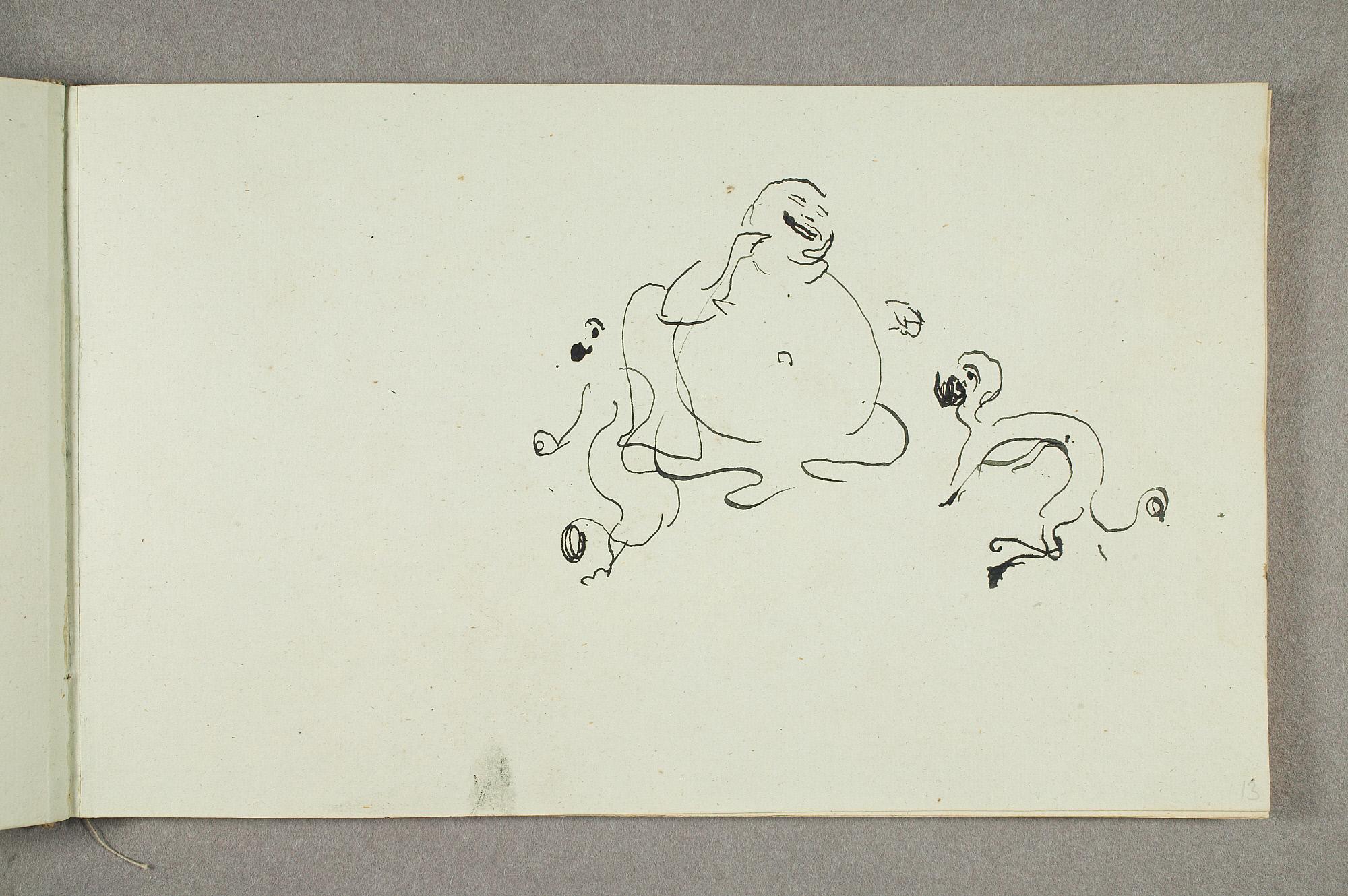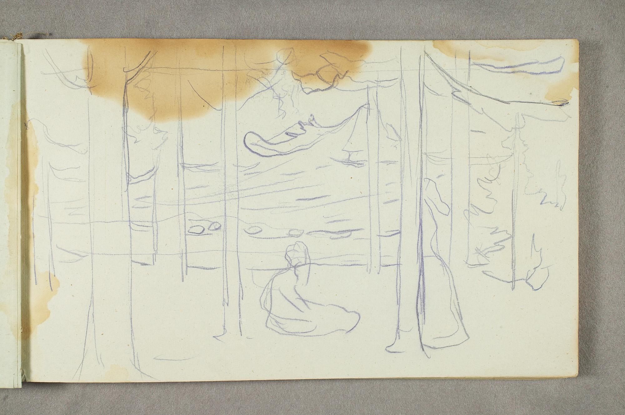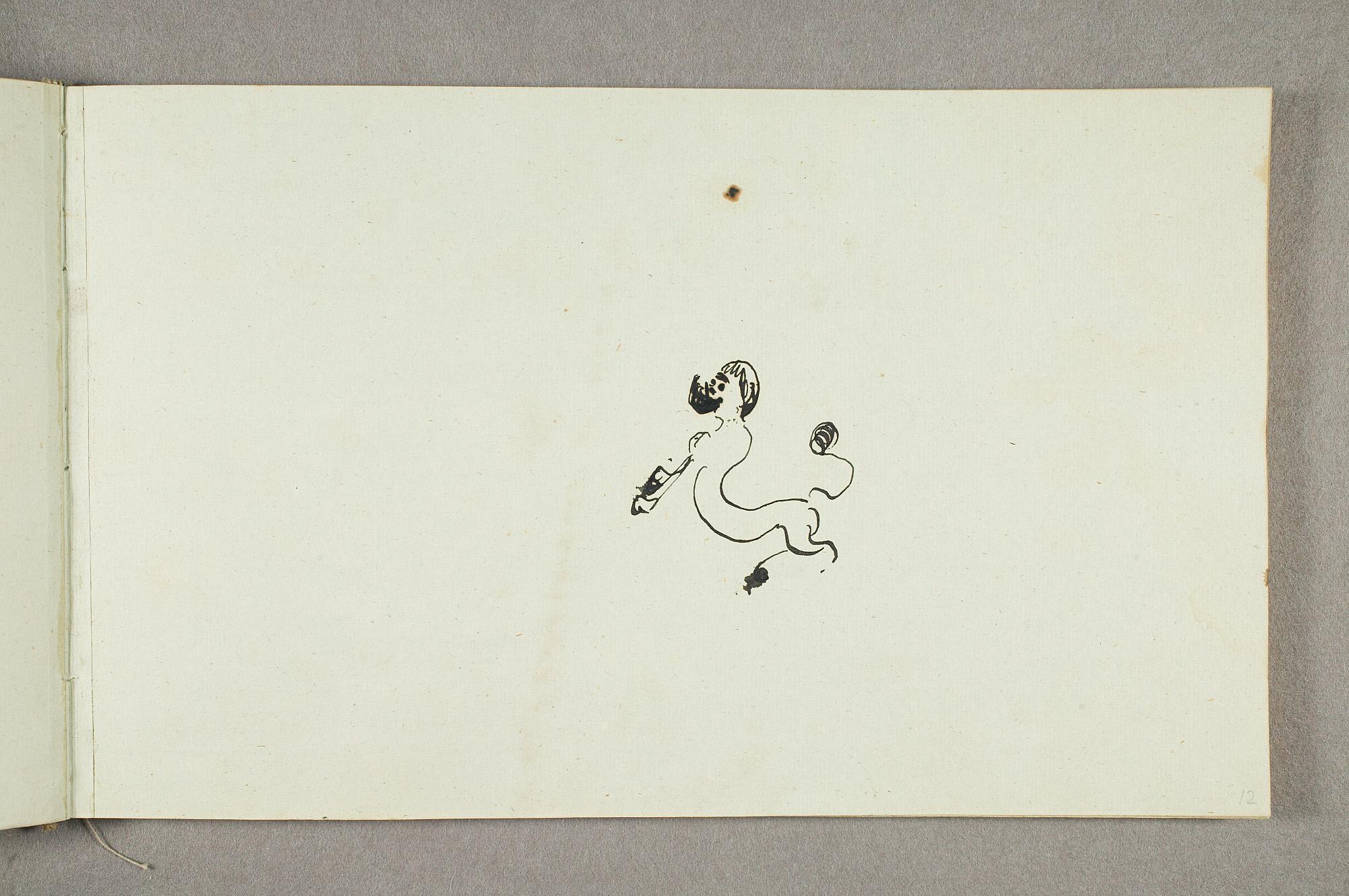 Comment:De fleste tegningene i denne skisseboken er karikaturer, der særlig Gunnar Heiberg og Sigurd Bødker får gjennomgå. Munch mente de hadde tatt Tullas parti etter bruddet i 1902, og produserte i flere år adskillige ondsinnede karikaturer av dem. Heiberg fremstilles gjerne som "paddegris", mens Bødker tildeles rollen som puddel. Flere av tegningene i denne boken ble også utført som litografier, datert til 1903. I siste del av boken er det en del landskapsskisser, som er vanskelig å plassere. Muligens kan de være fra Thüringen, og de gis derfor den litt videre dateringen 1903–05. (MB)