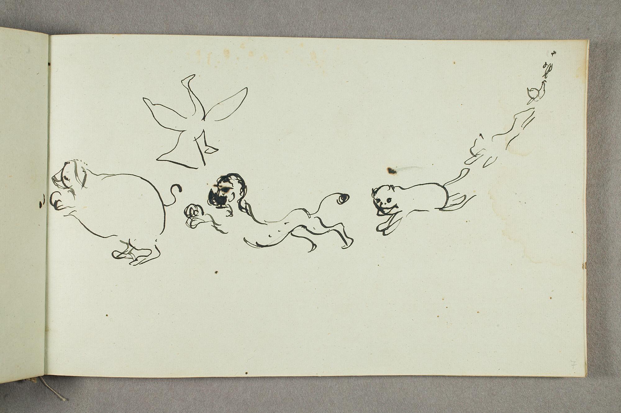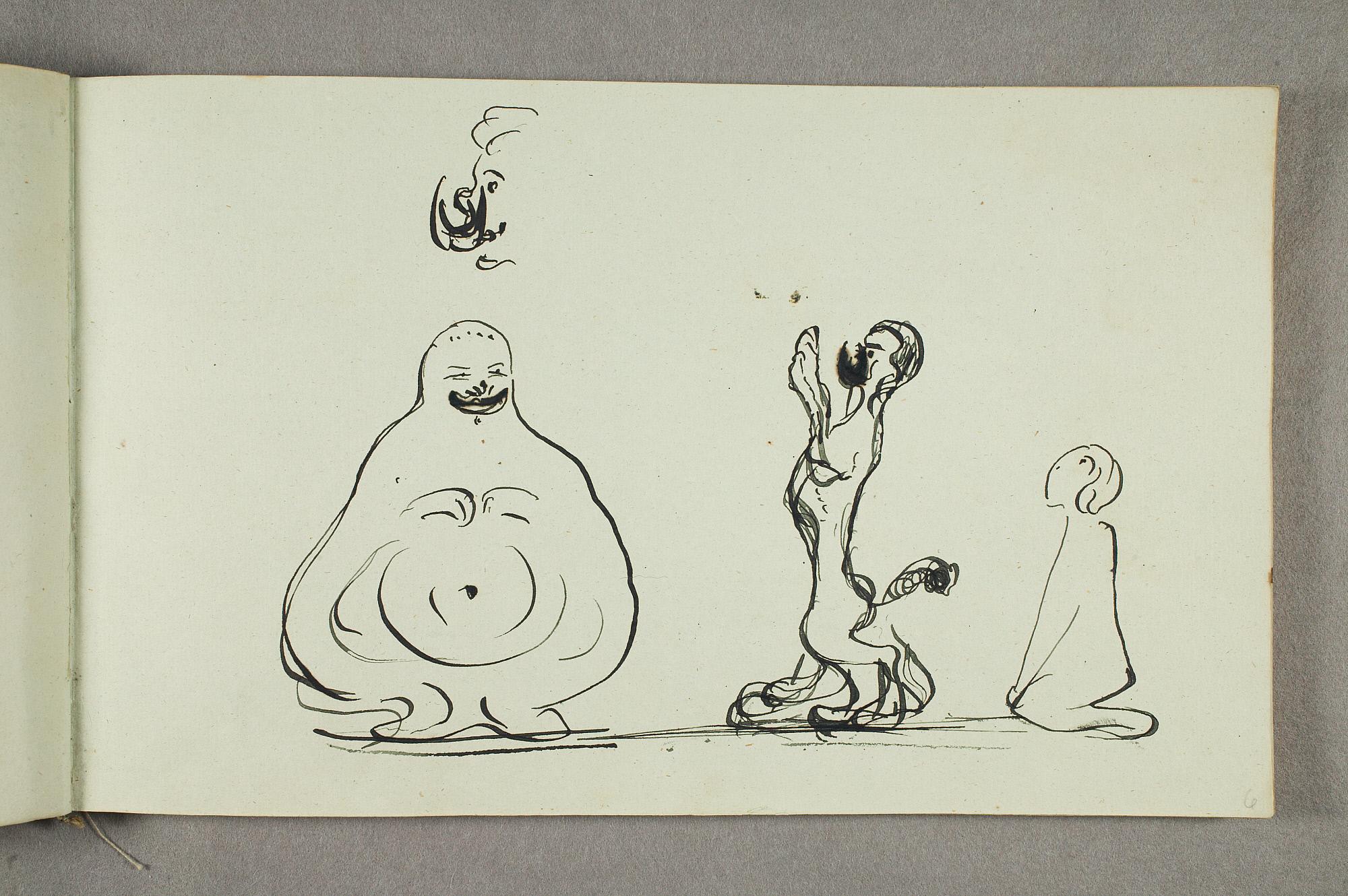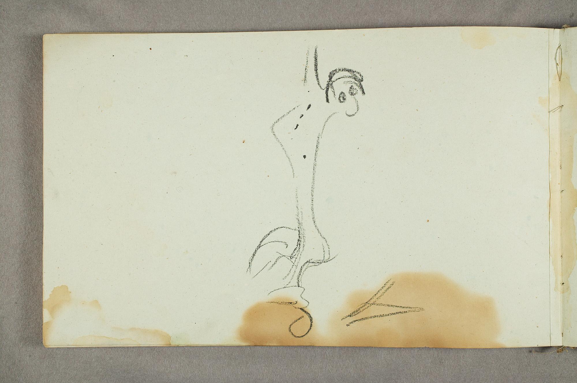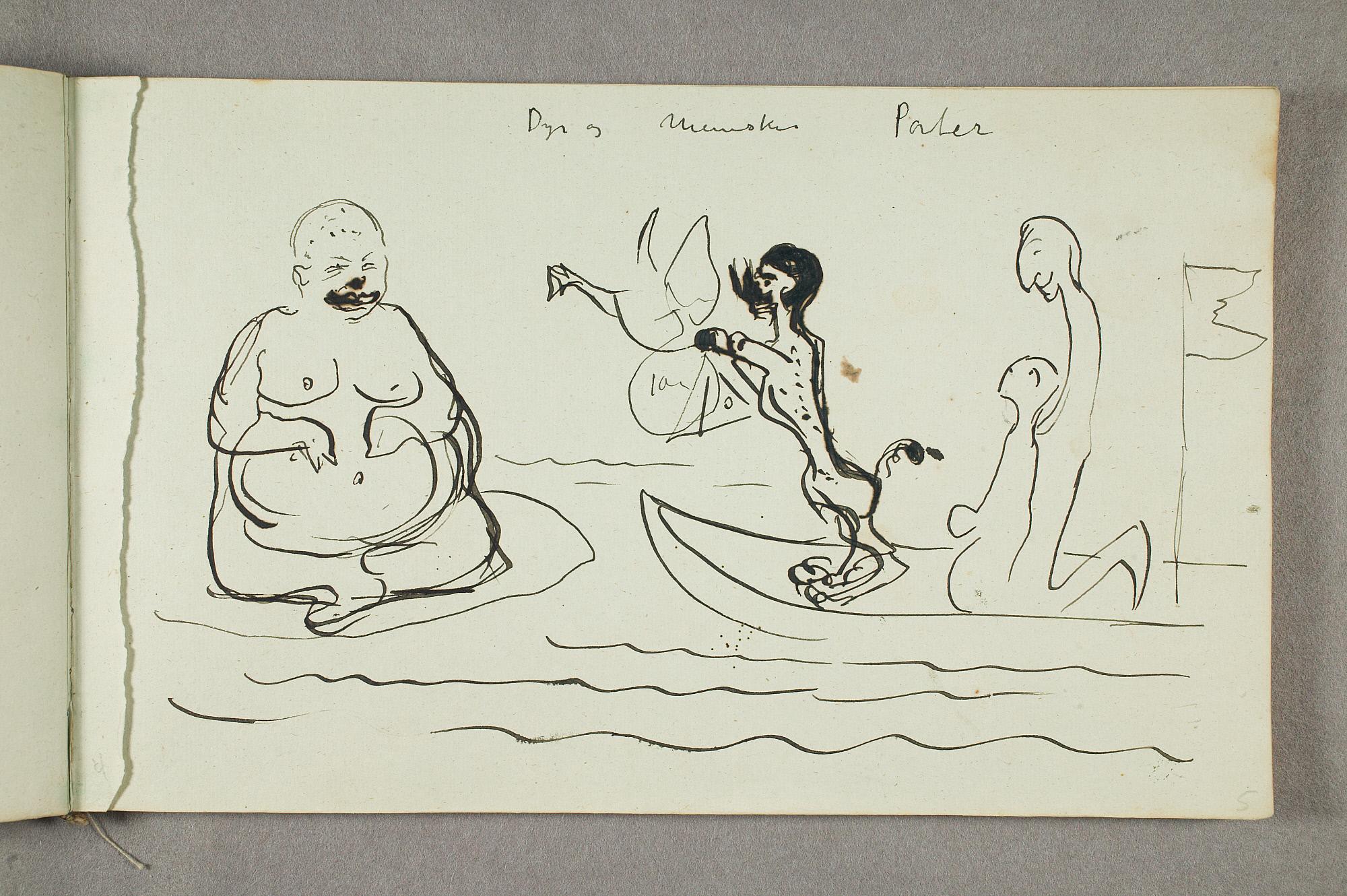 Comment:De fleste tegningene i denne skisseboken er karikaturer, der særlig Gunnar Heiberg og Sigurd Bødker får gjennomgå. Munch mente de hadde tatt Tullas parti etter bruddet i 1902, og produserte i flere år adskillige ondsinnede karikaturer av dem. Heiberg fremstilles gjerne som "paddegris", mens Bødker tildeles rollen som puddel. Flere av tegningene i denne boken ble også utført som litografier, datert til 1903. I siste del av boken er det en del landskapsskisser, som er vanskelig å plassere. Muligens kan de være fra Thüringen, og de gis derfor den litt videre dateringen 1903–05. (MB)