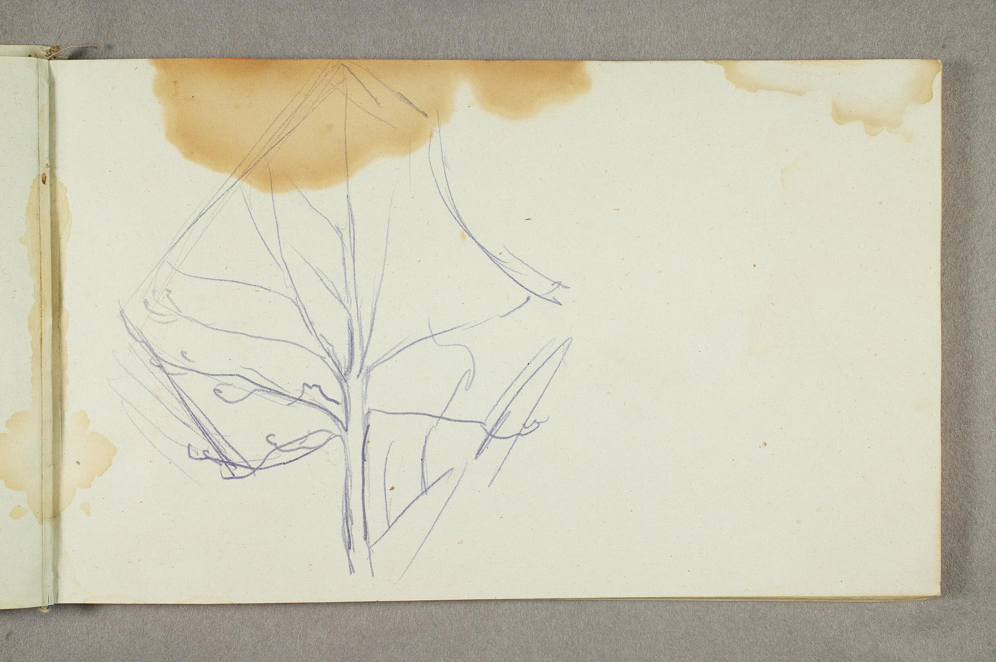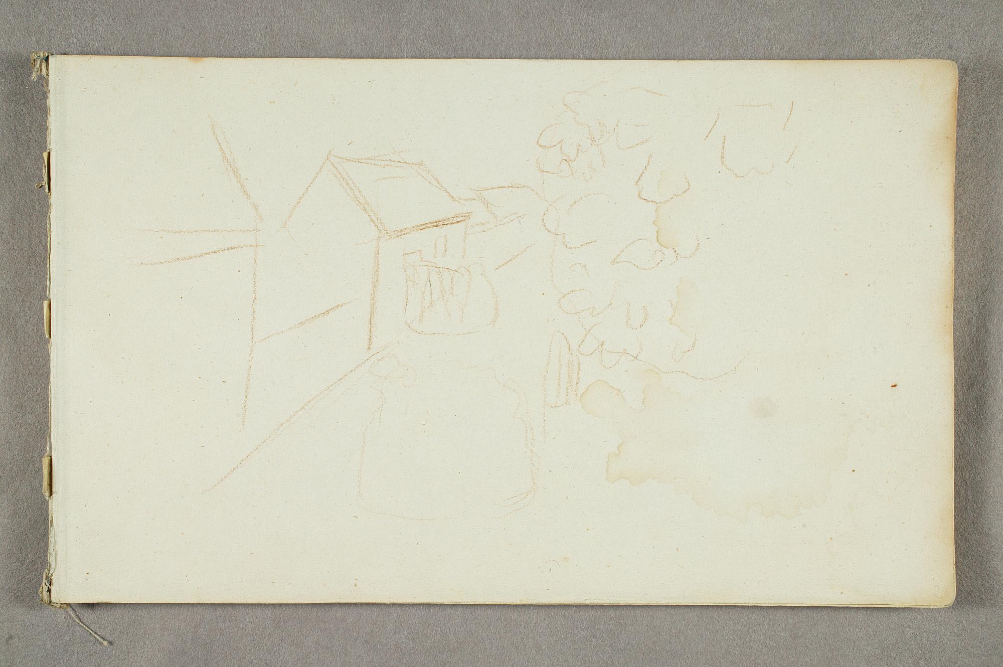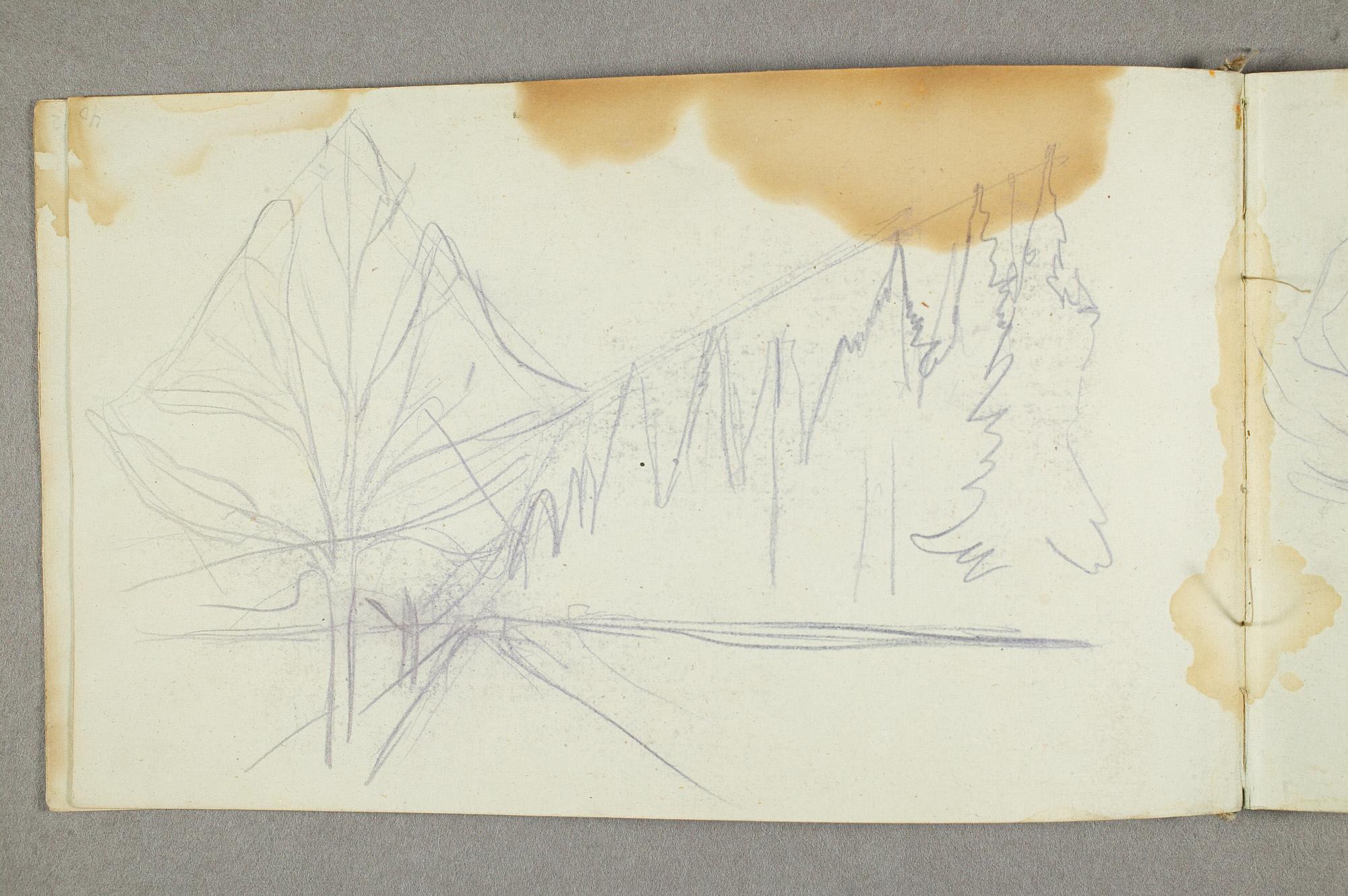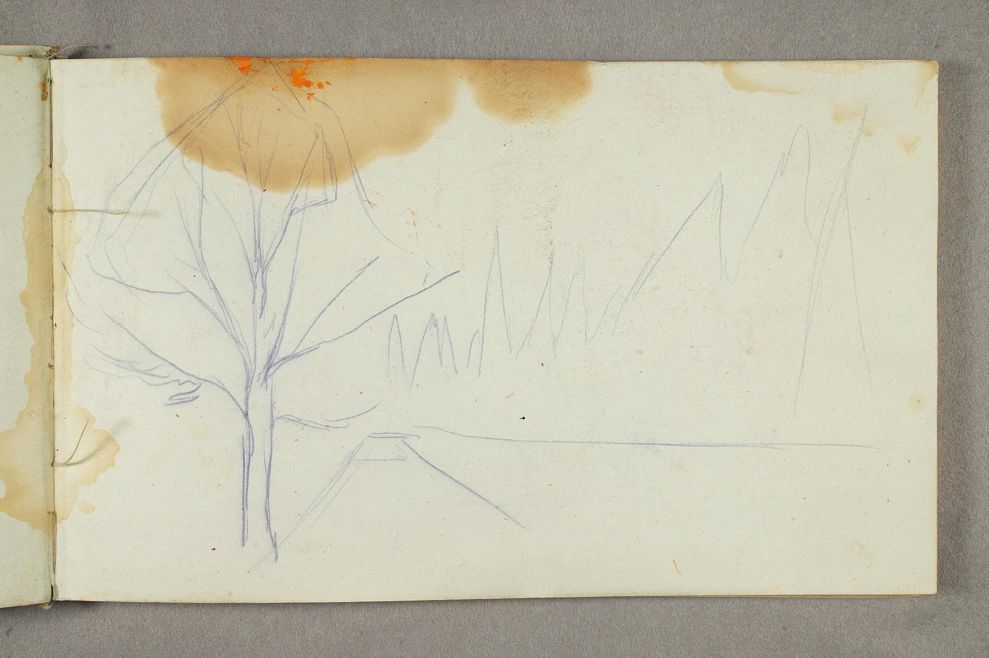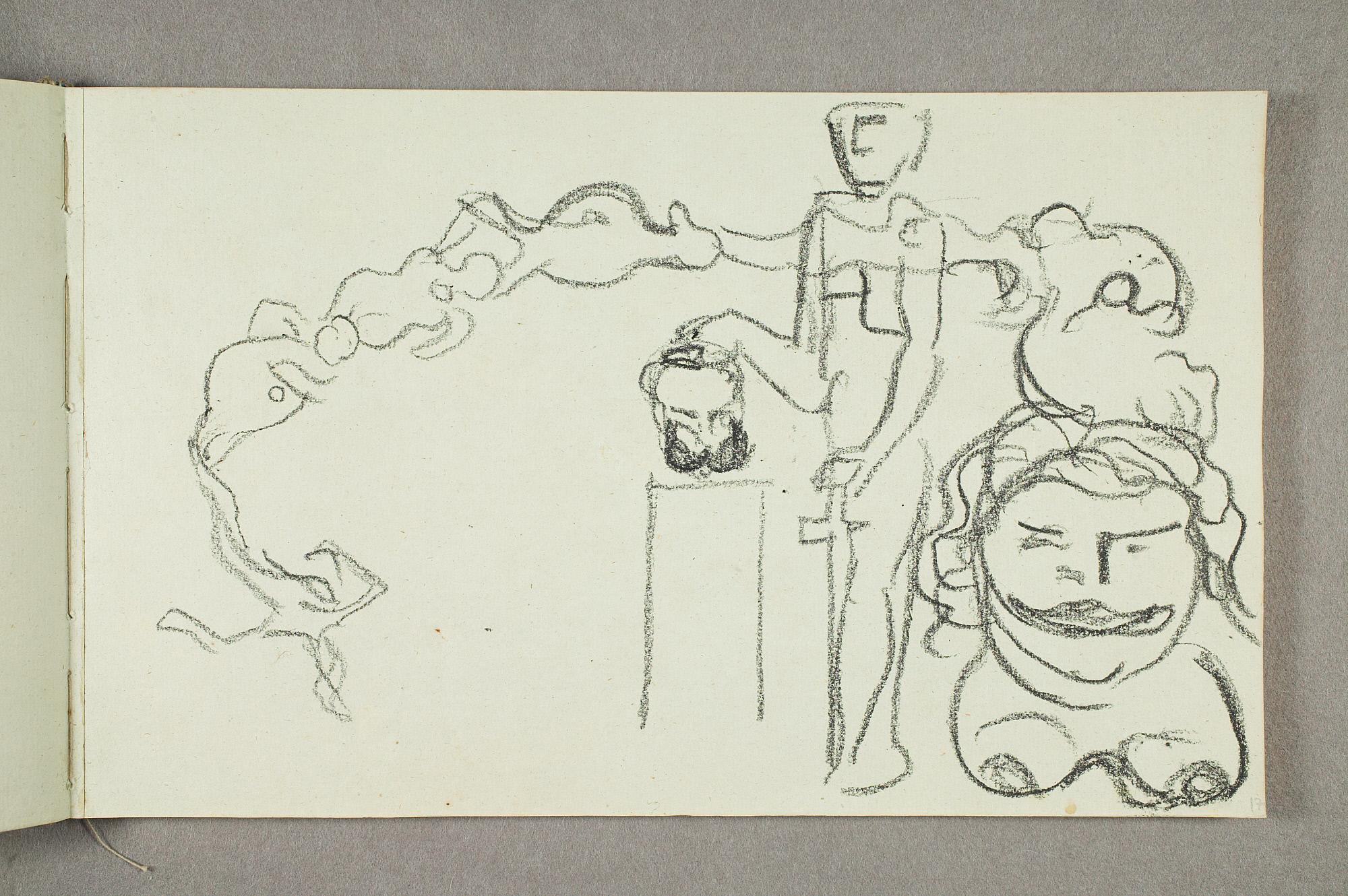 Comment:De fleste tegningene i denne skisseboken er karikaturer, der særlig Gunnar Heiberg og Sigurd Bødker får gjennomgå. Munch mente de hadde tatt Tullas parti etter bruddet i 1902, og produserte i flere år adskillige ondsinnede karikaturer av dem. Heiberg fremstilles gjerne som "paddegris", mens Bødker tildeles rollen som puddel. Flere av tegningene i denne boken ble også utført som litografier, datert til 1903. I siste del av boken er det en del landskapsskisser, som er vanskelig å plassere. Muligens kan de være fra Thüringen, og de gis derfor den litt videre dateringen 1903–05. (MB)