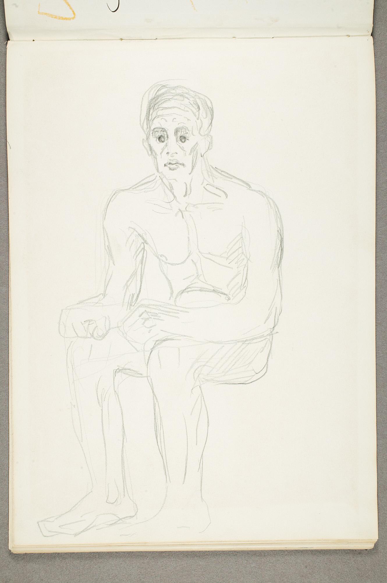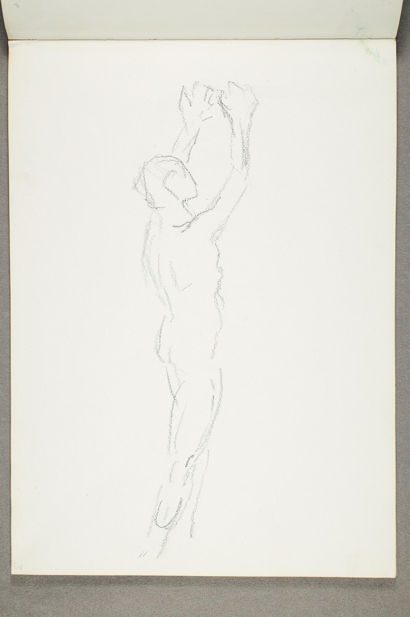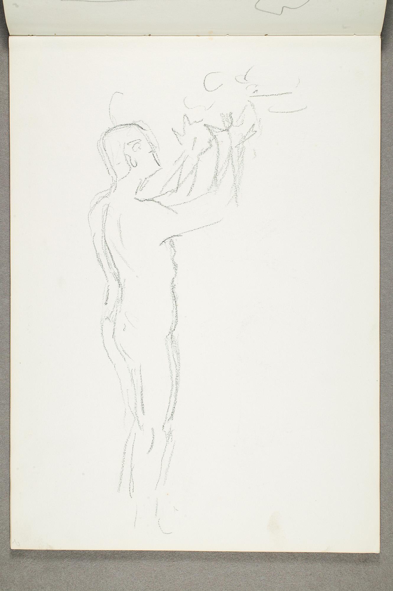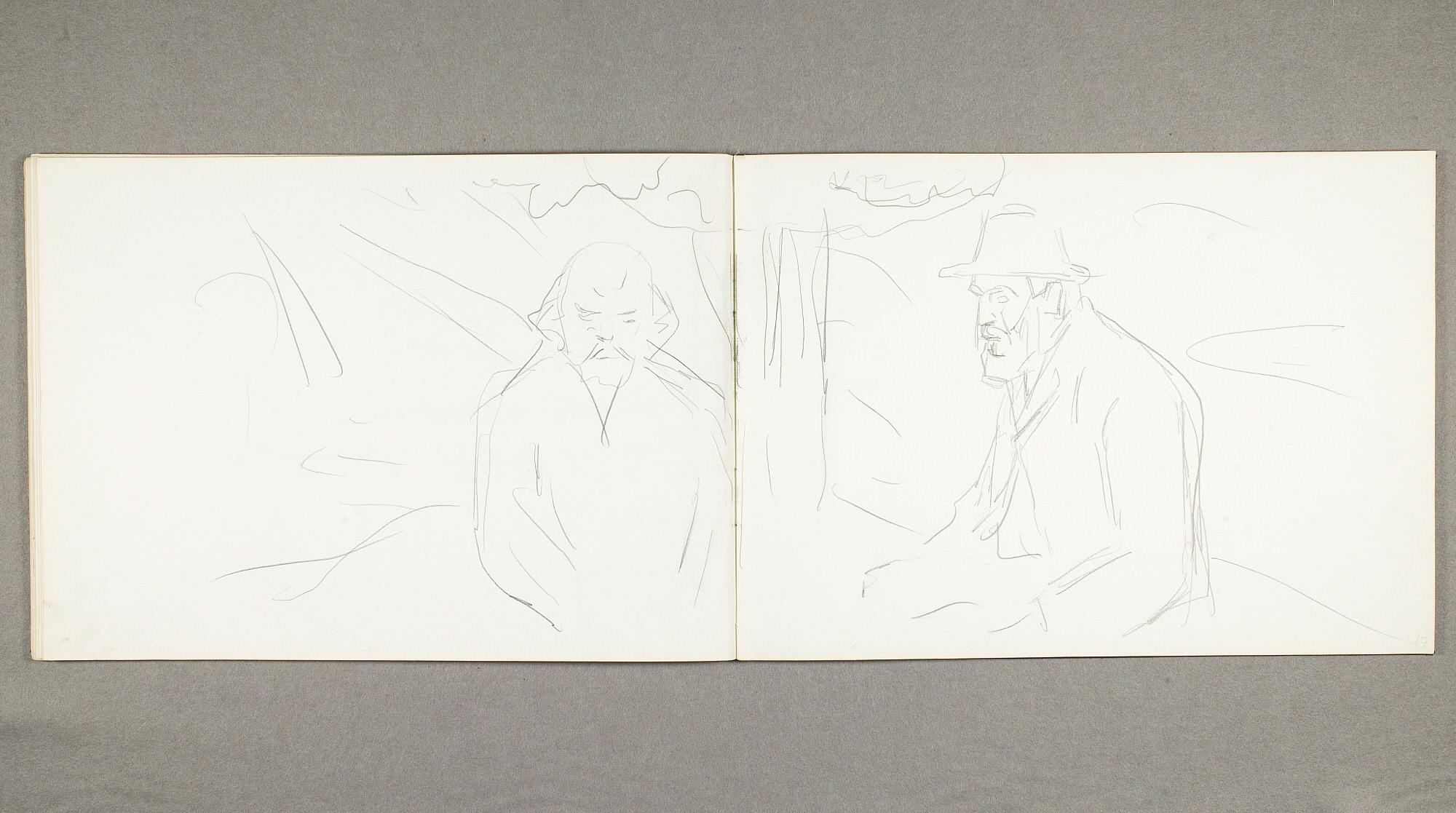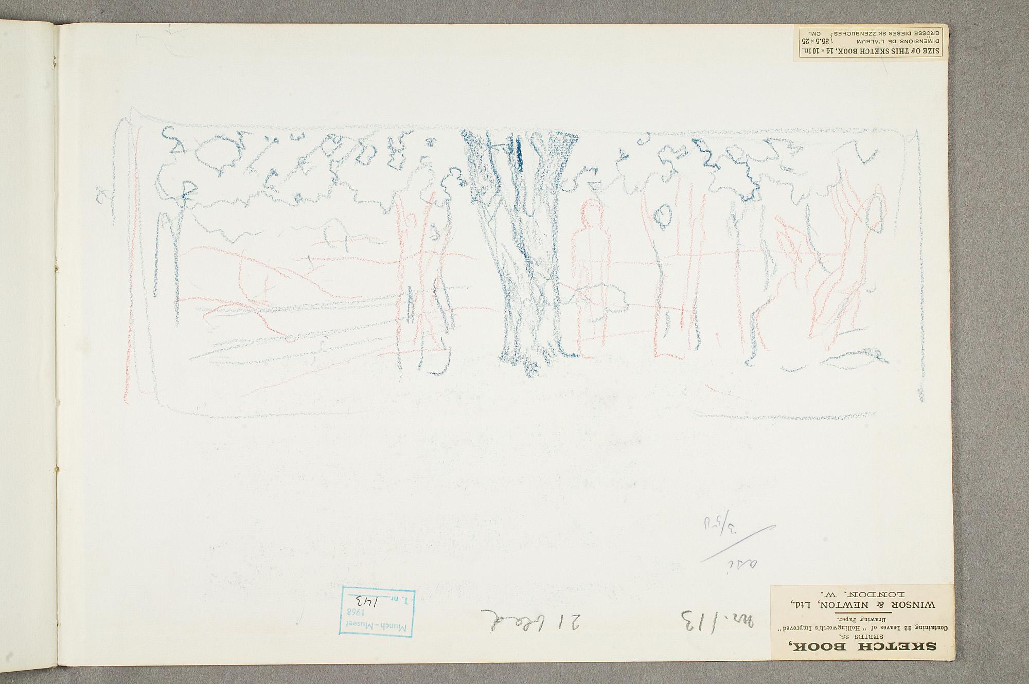 Comment:Denne typen skissebok, fra Winsor & Newton, finnes det 10 av i Munchmuseets samling, og alle er blitt brukt i Kragerø-perioden, 1909–15. Mange av tegningene i denne boken kan relateres til forskjellige utkast til auladekorasjonene. Flere av dem arbeidet Munch med våren og sommeren 1910, da han lette etter passende motiver til alle feltene. (PP)