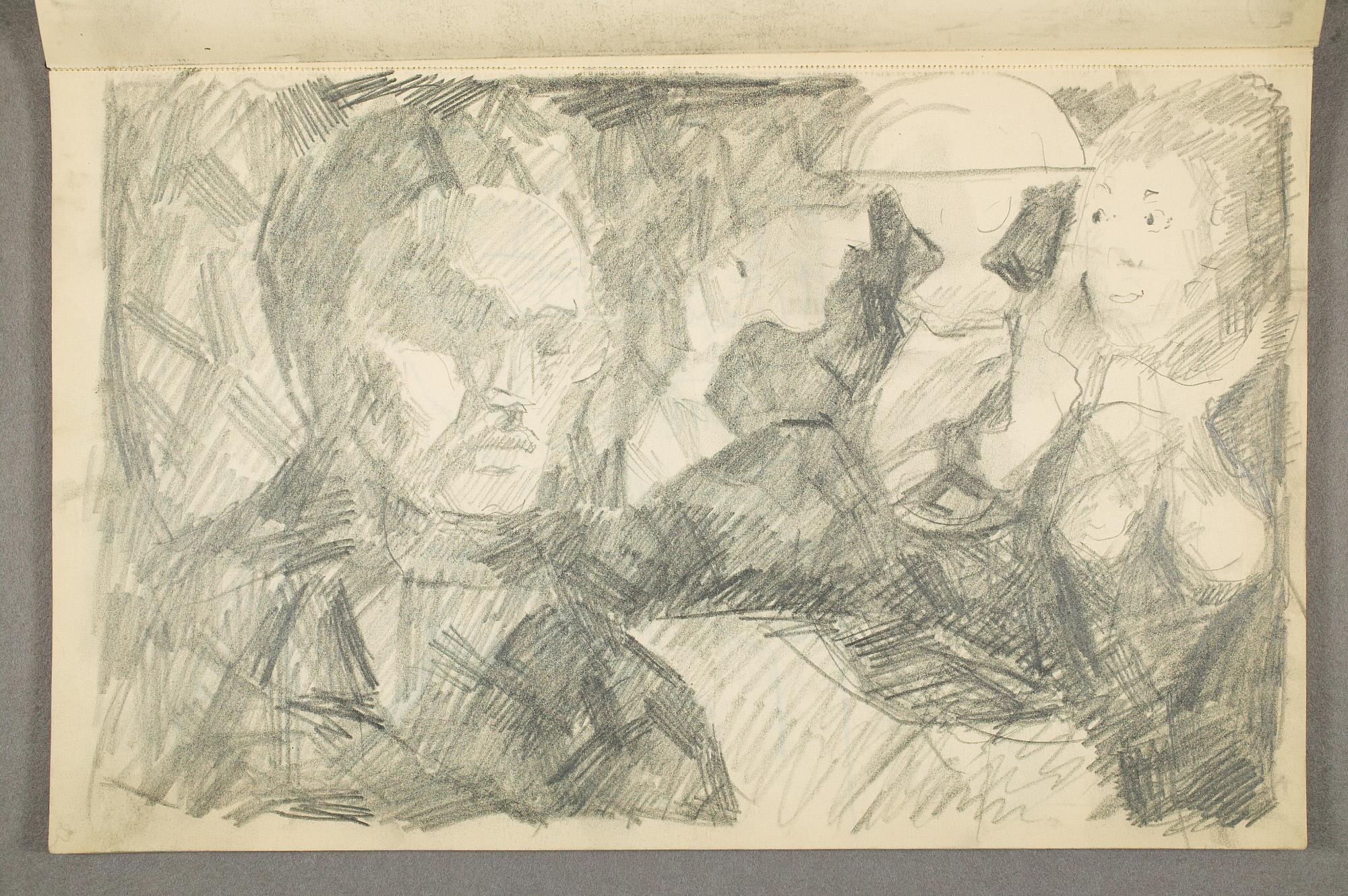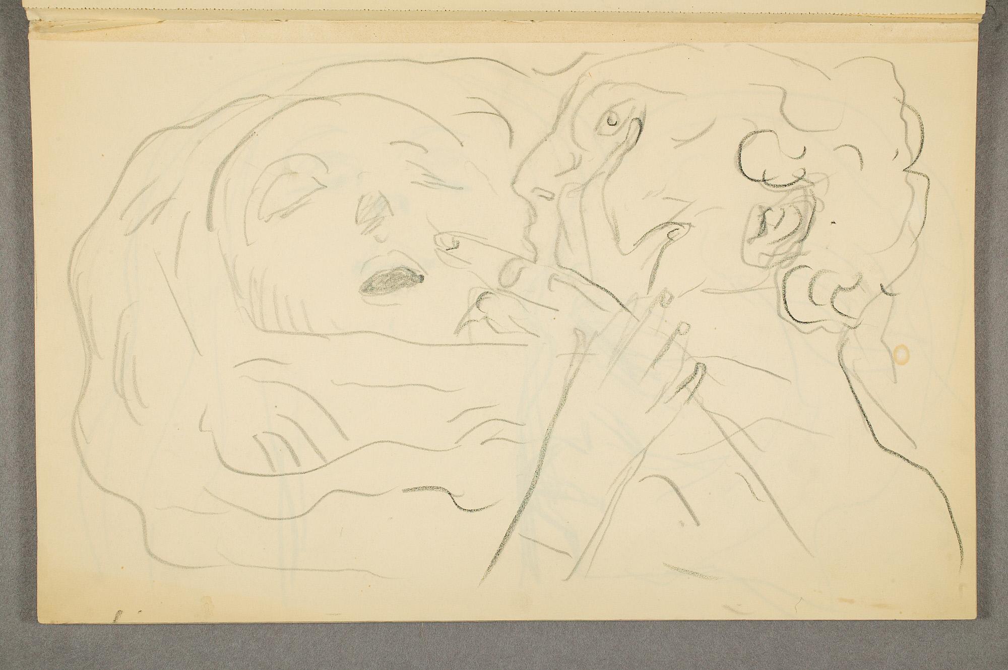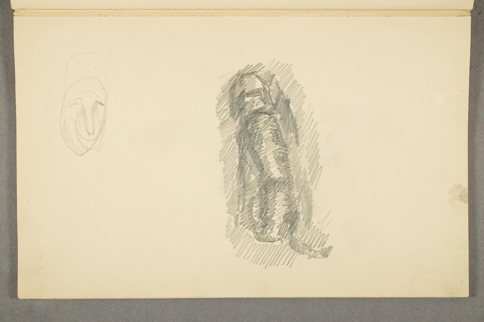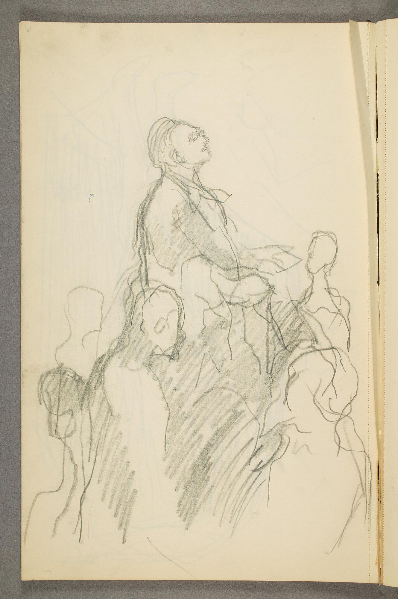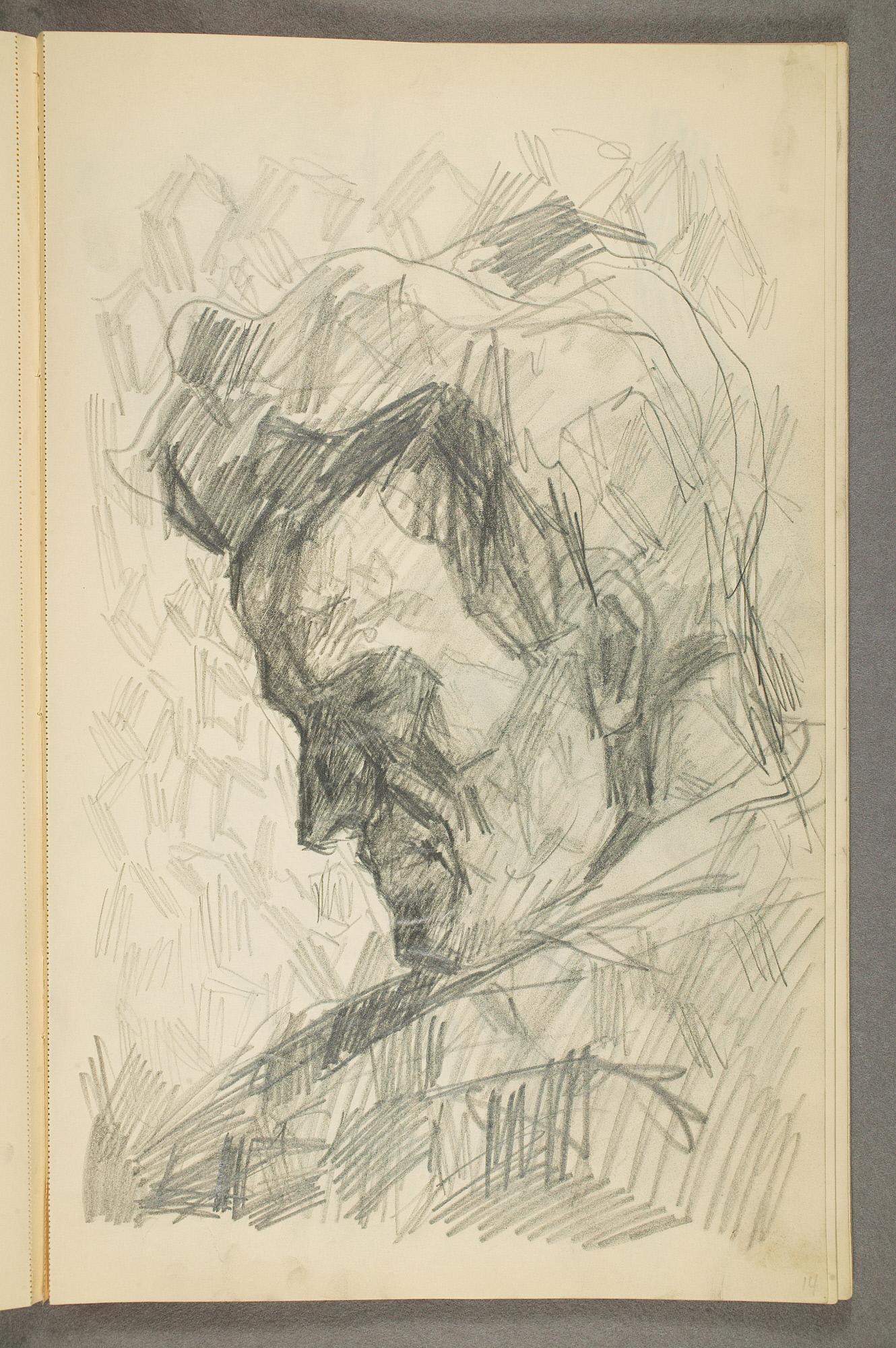 Comment:Det er stor motivvariasjon i denne skisseboken, og flere av tegningene har få eller ingen holdepunkter for datering. Mange kan likevel dateres innenfor perioden 1910–15, og alle er utført med enten blyant eller svart fargestift. Ingen av tegningene skiller seg nevneverdig ut med hensyn til stil, og det kan se ut som om alle ble utført innenfor en tidsramme på få år. En usikkerhet knyttes til tegningene med «Alma Mater. Forskerne» som er plassert helt mot slutten av skisseboken og der en sen datering kan være mulig. (PP)