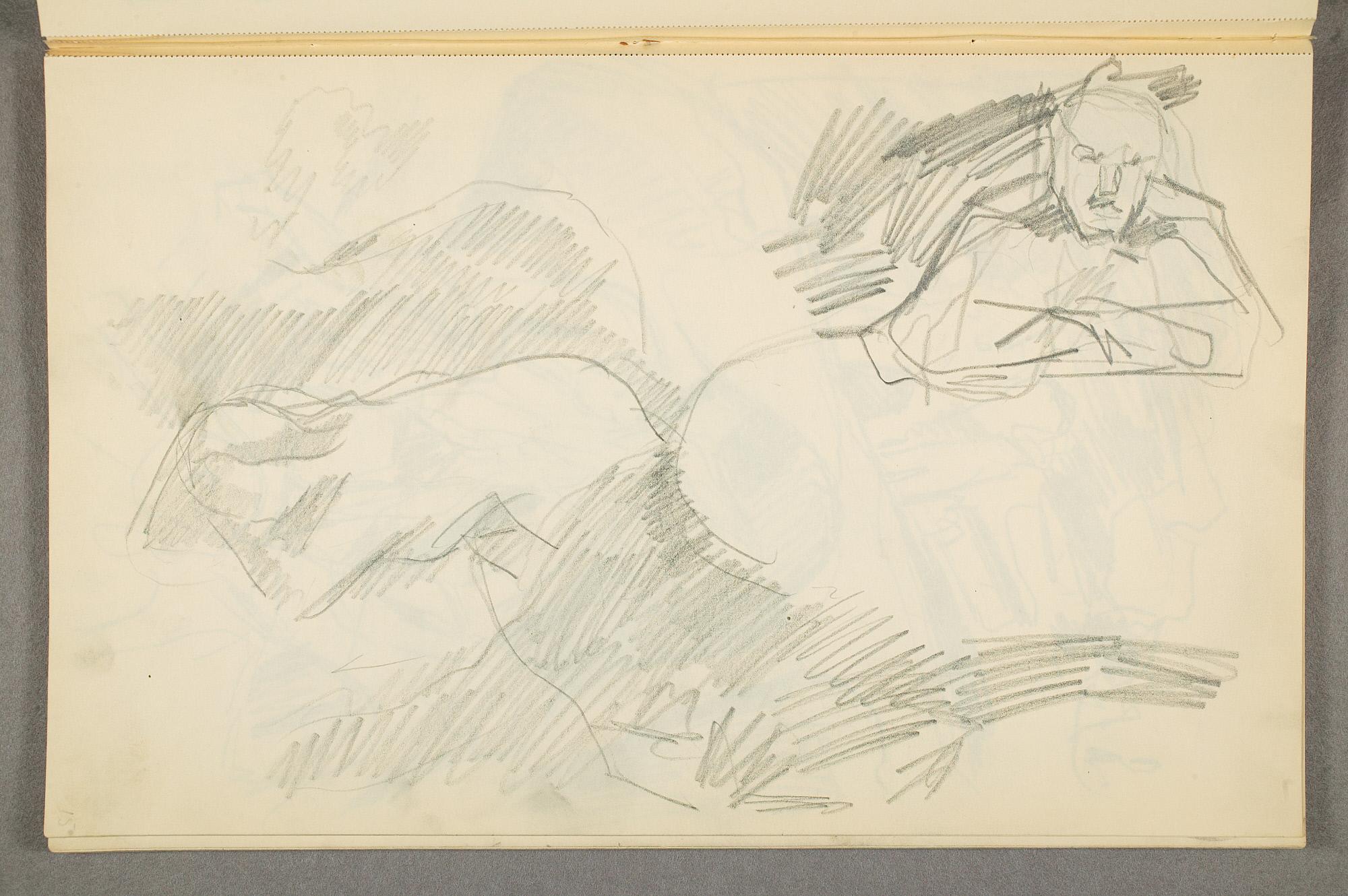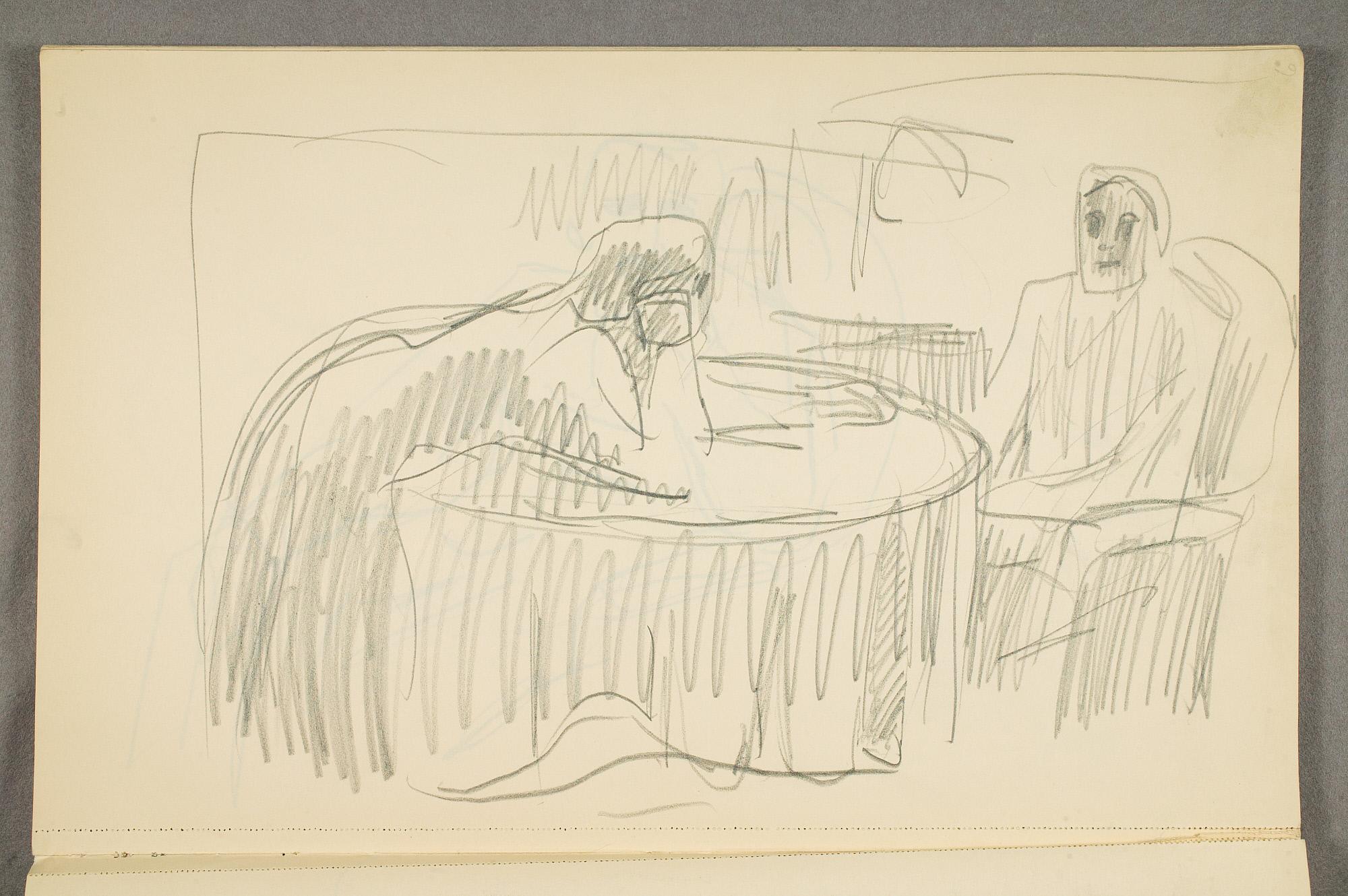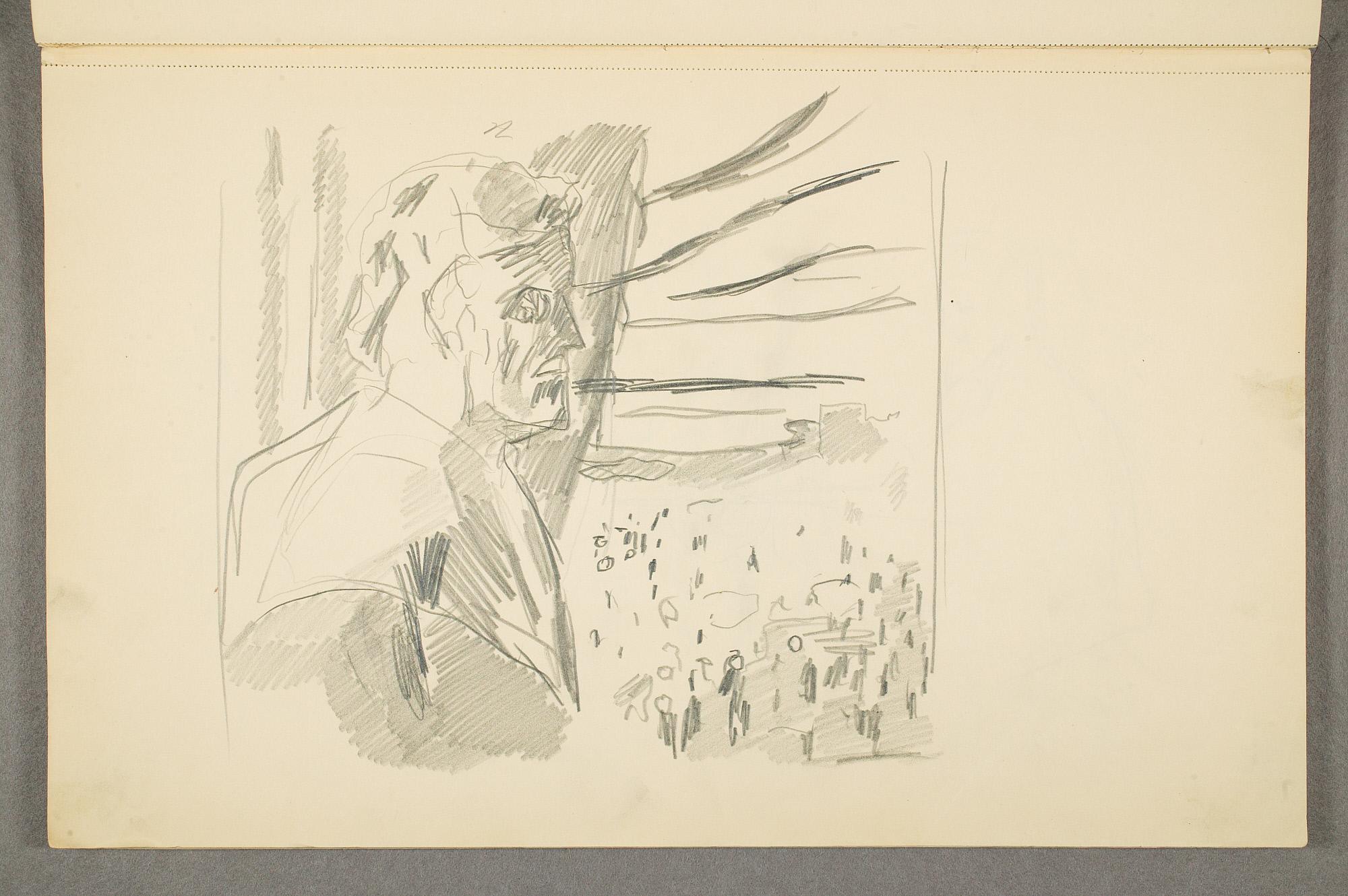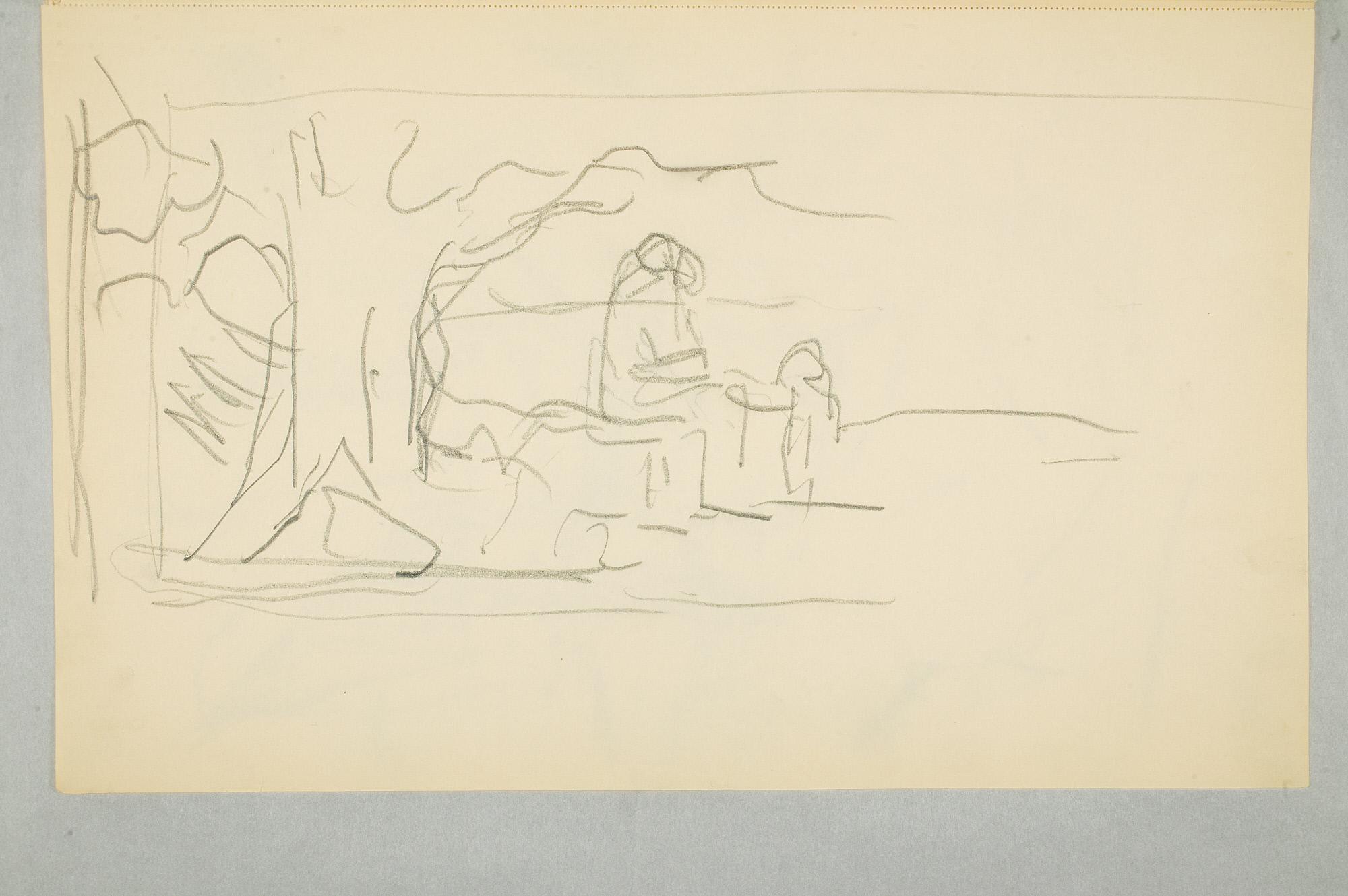 Comment:Det er stor motivvariasjon i denne skisseboken, og flere av tegningene har få eller ingen holdepunkter for datering. Mange kan likevel dateres innenfor perioden 1910–15, og alle er utført med enten blyant eller svart fargestift. Ingen av tegningene skiller seg nevneverdig ut med hensyn til stil, og det kan se ut som om alle ble utført innenfor en tidsramme på få år. En usikkerhet knyttes til tegningene med «Alma Mater. Forskerne» som er plassert helt mot slutten av skisseboken og der en sen datering kan være mulig. (PP)