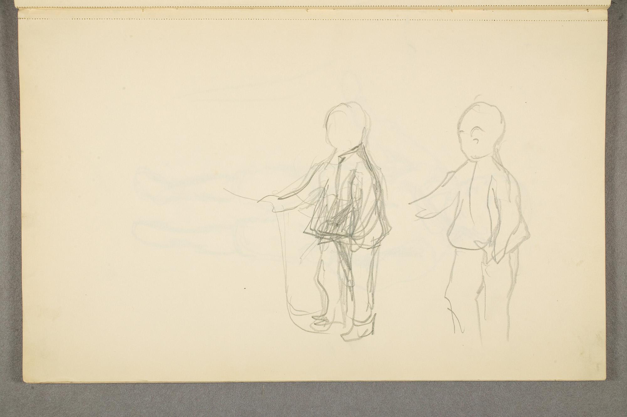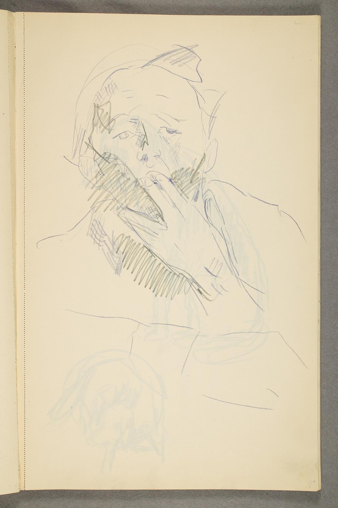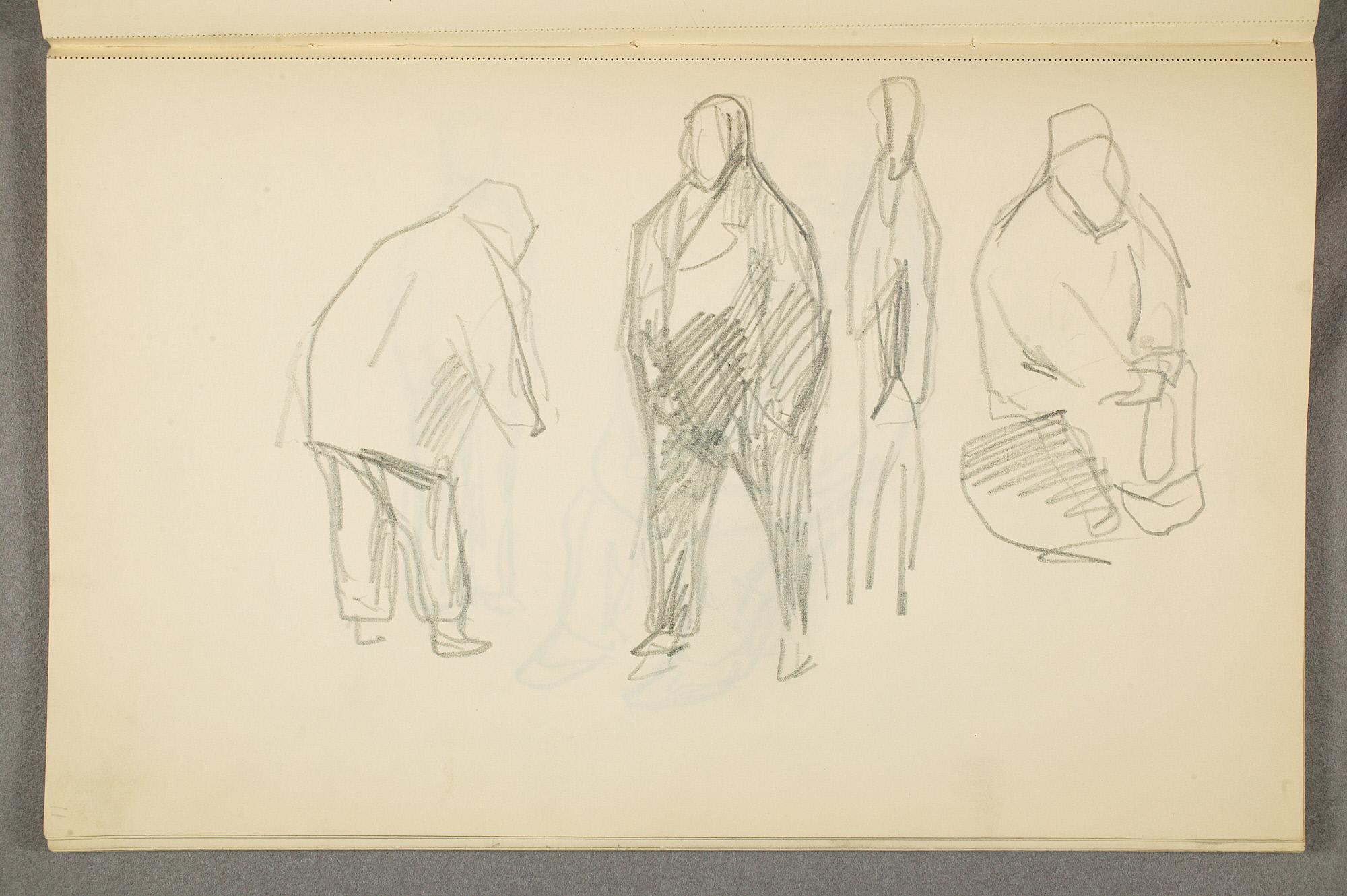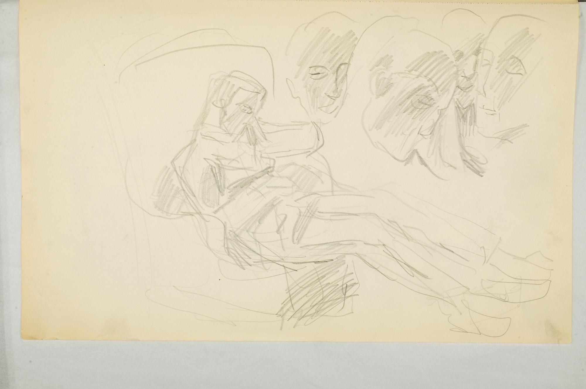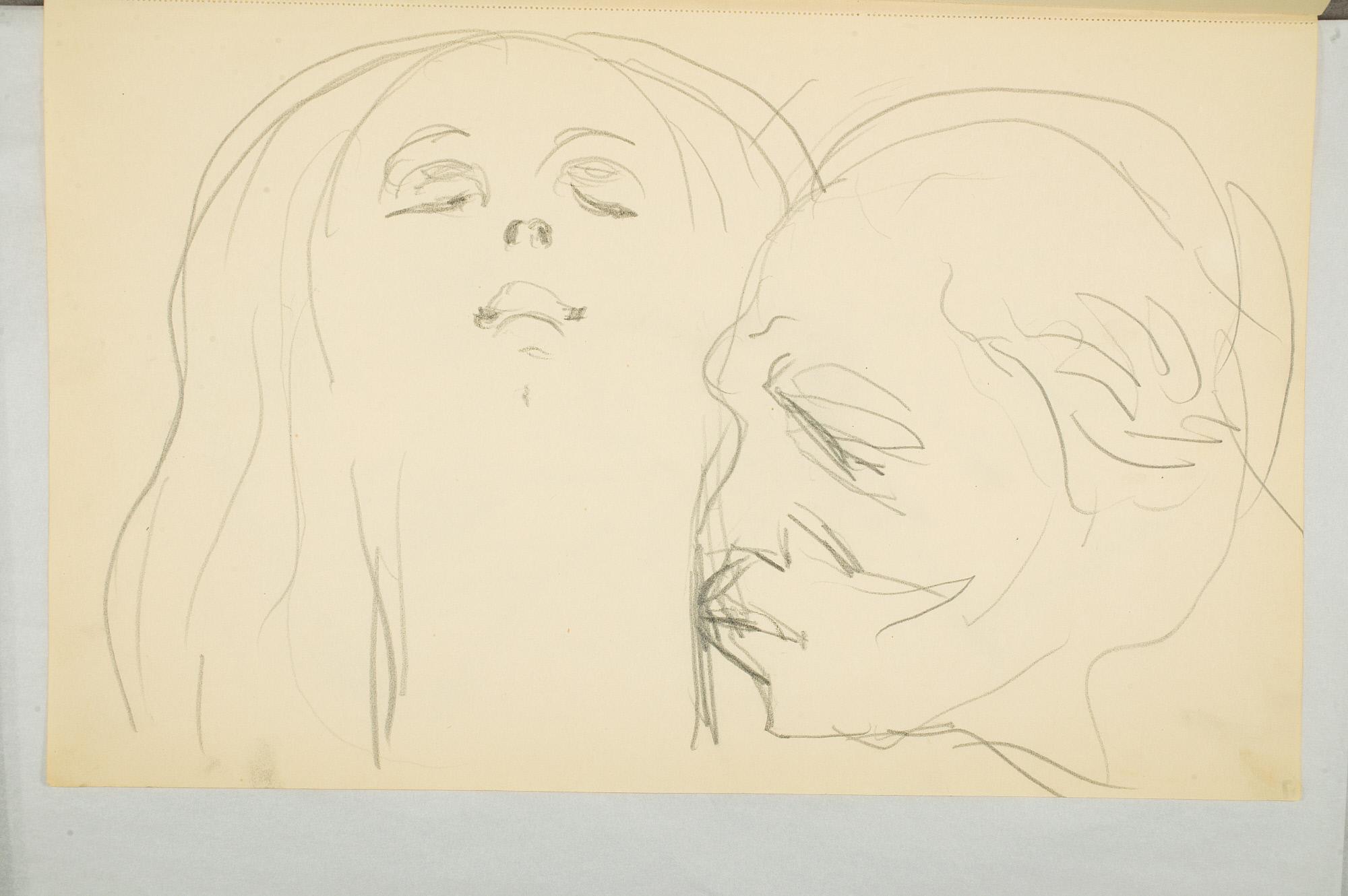 Comment:Det er stor motivvariasjon i denne skisseboken, og flere av tegningene har få eller ingen holdepunkter for datering. Mange kan likevel dateres innenfor perioden 1910–15, og alle er utført med enten blyant eller svart fargestift. Ingen av tegningene skiller seg nevneverdig ut med hensyn til stil, og det kan se ut som om alle ble utført innenfor en tidsramme på få år. En usikkerhet knyttes til tegningene med «Alma Mater. Forskerne» som er plassert helt mot slutten av skisseboken og der en sen datering kan være mulig. (PP)