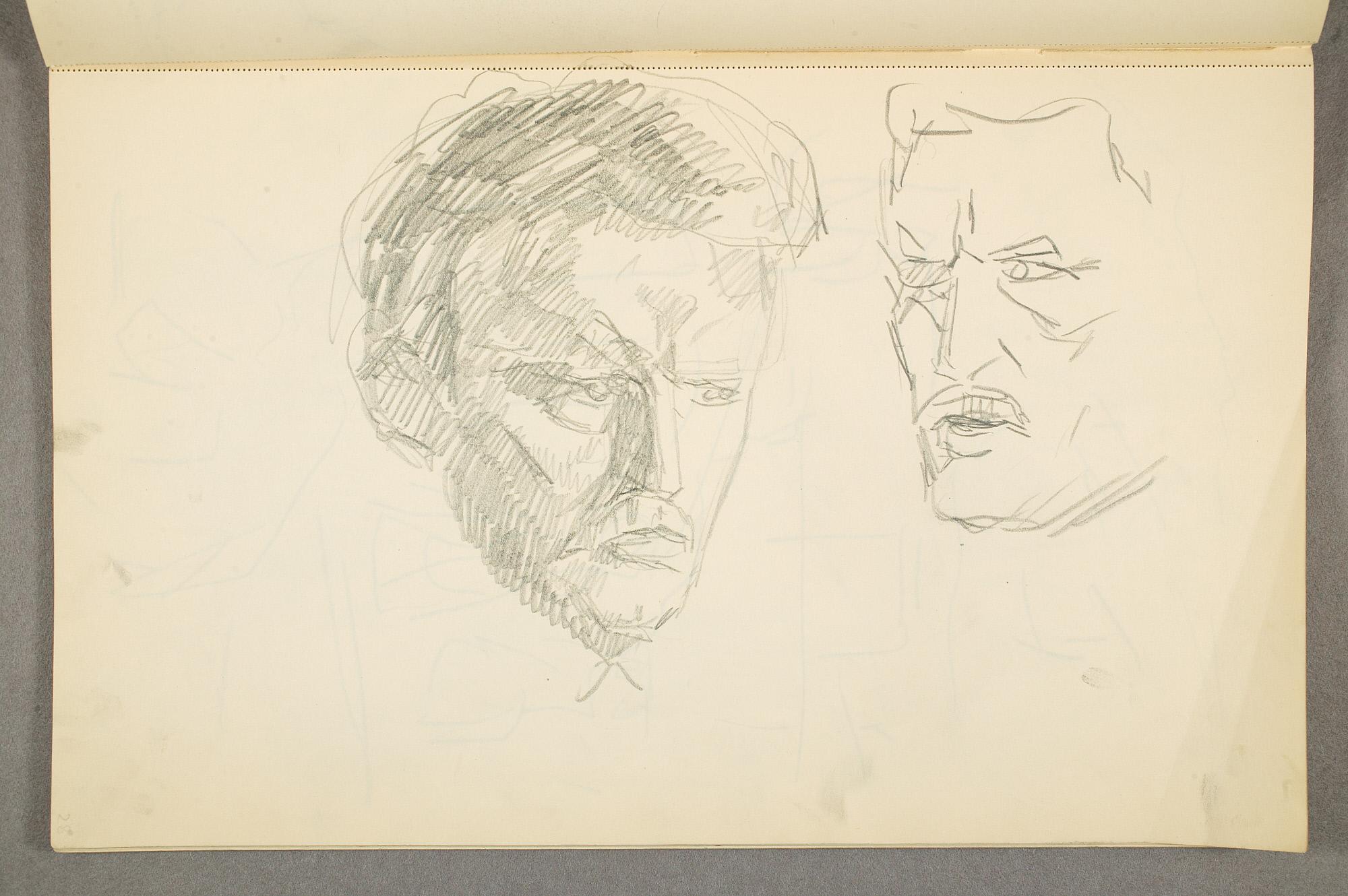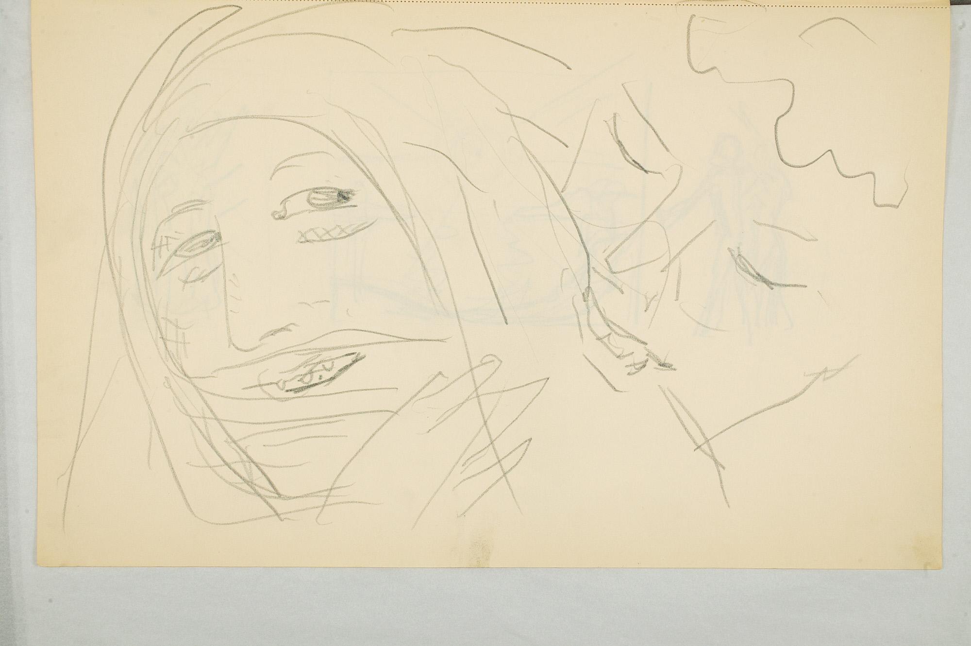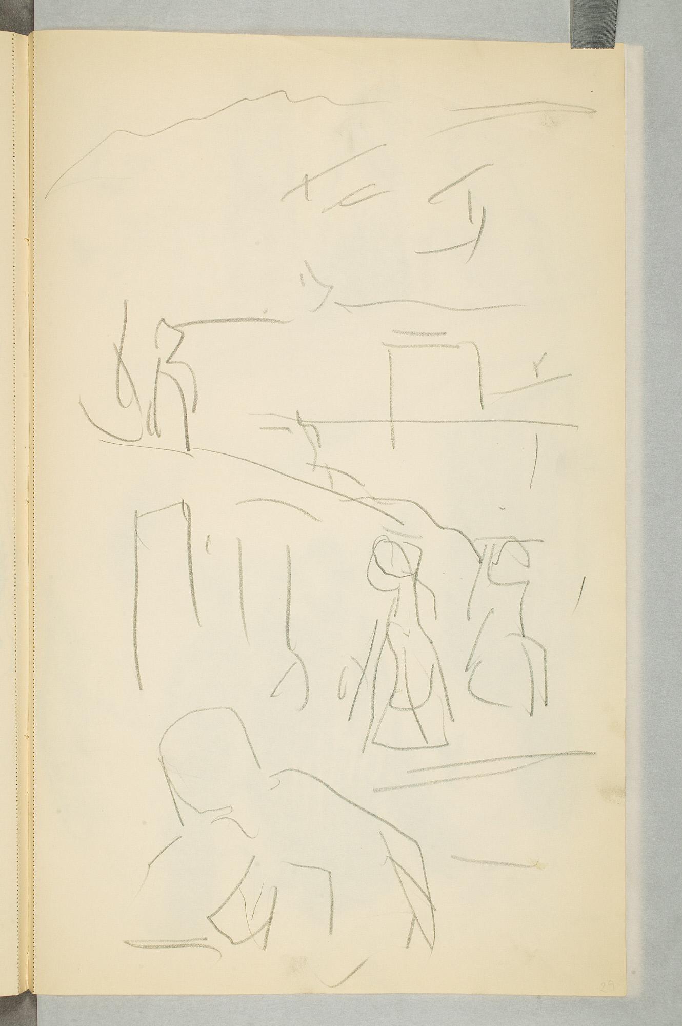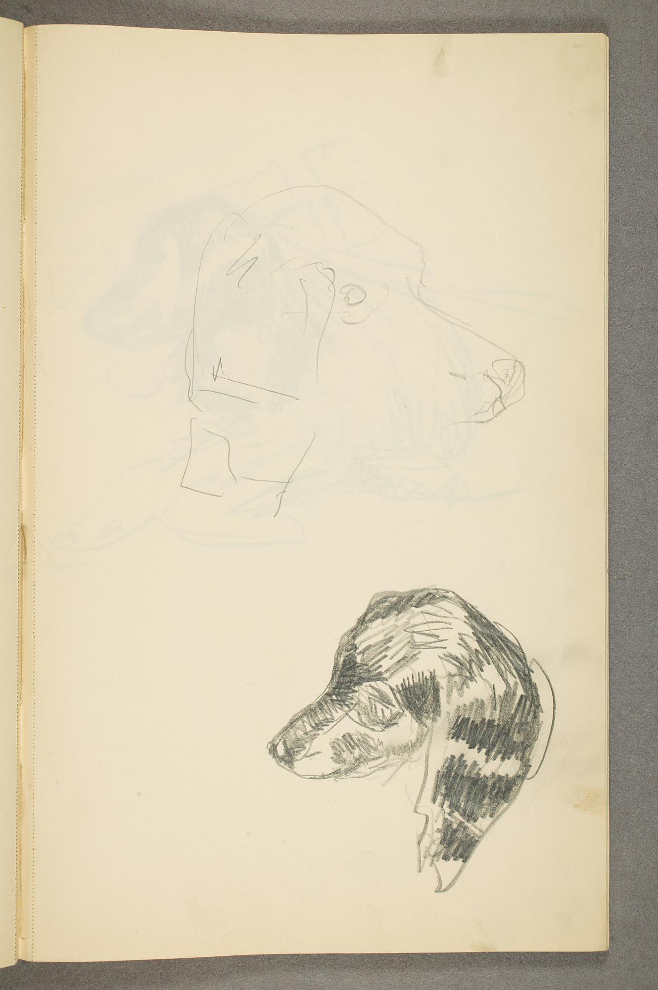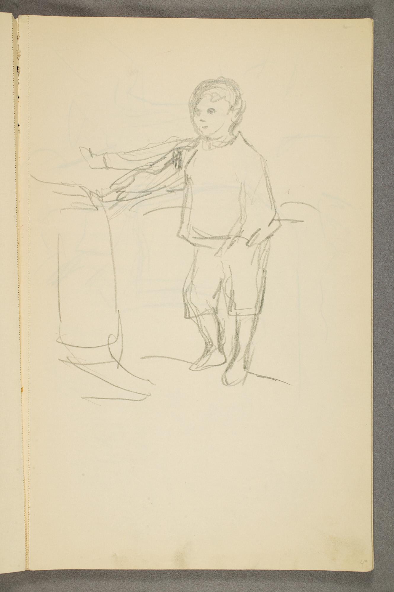 Comment:Det er stor motivvariasjon i denne skisseboken, og flere av tegningene har få eller ingen holdepunkter for datering. Mange kan likevel dateres innenfor perioden 1910–15, og alle er utført med enten blyant eller svart fargestift. Ingen av tegningene skiller seg nevneverdig ut med hensyn til stil, og det kan se ut som om alle ble utført innenfor en tidsramme på få år. En usikkerhet knyttes til tegningene med «Alma Mater. Forskerne» som er plassert helt mot slutten av skisseboken og der en sen datering kan være mulig. (PP)