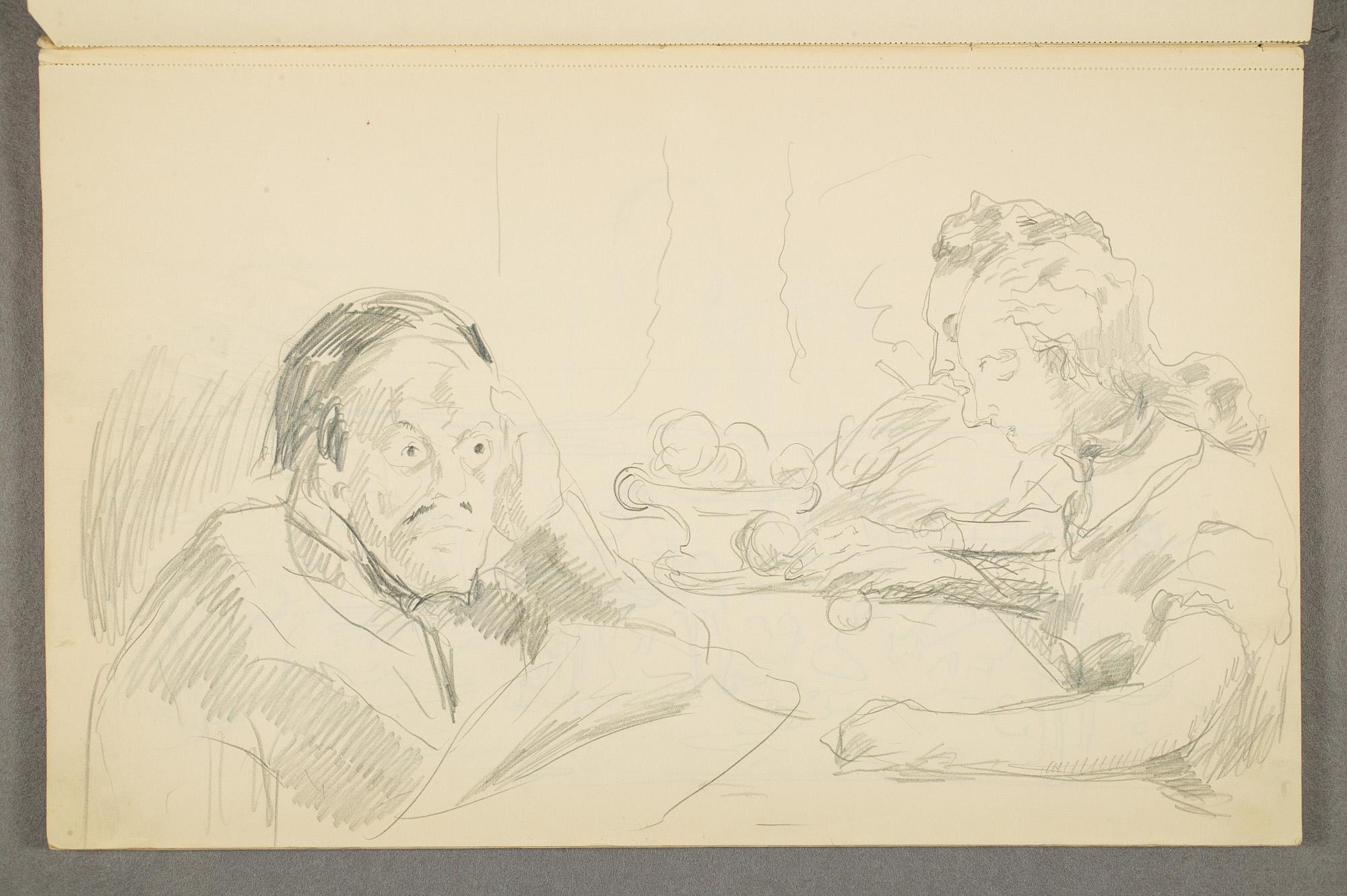 Løs opptegning av kvinne og to menn ved et bord. Bohemens bryllup?