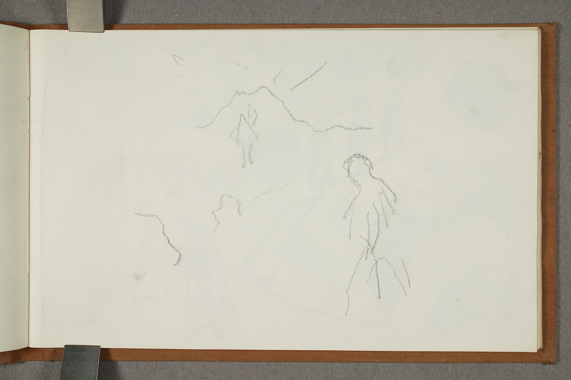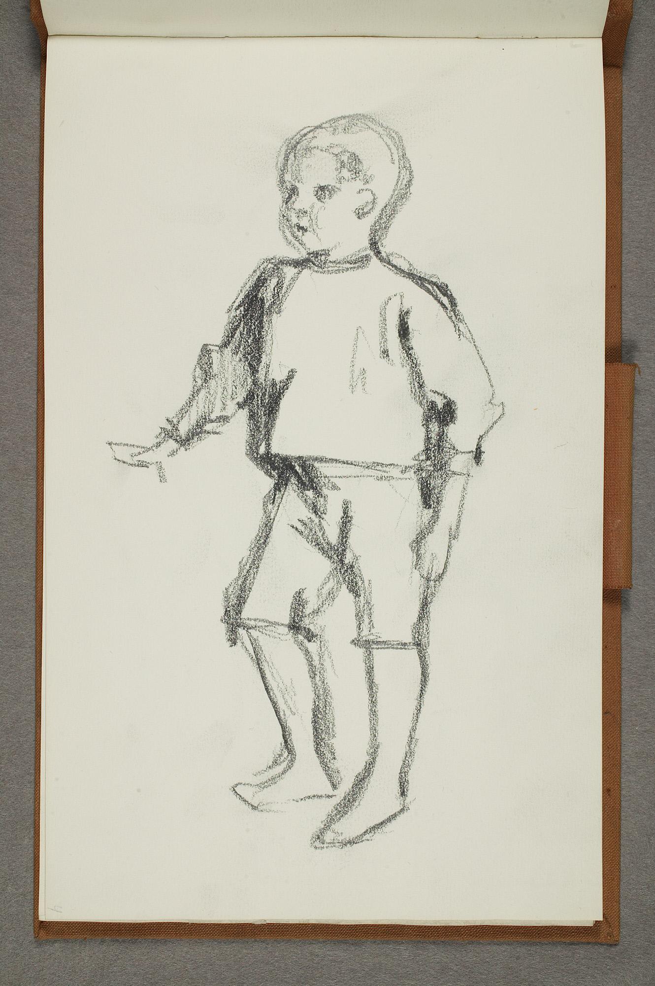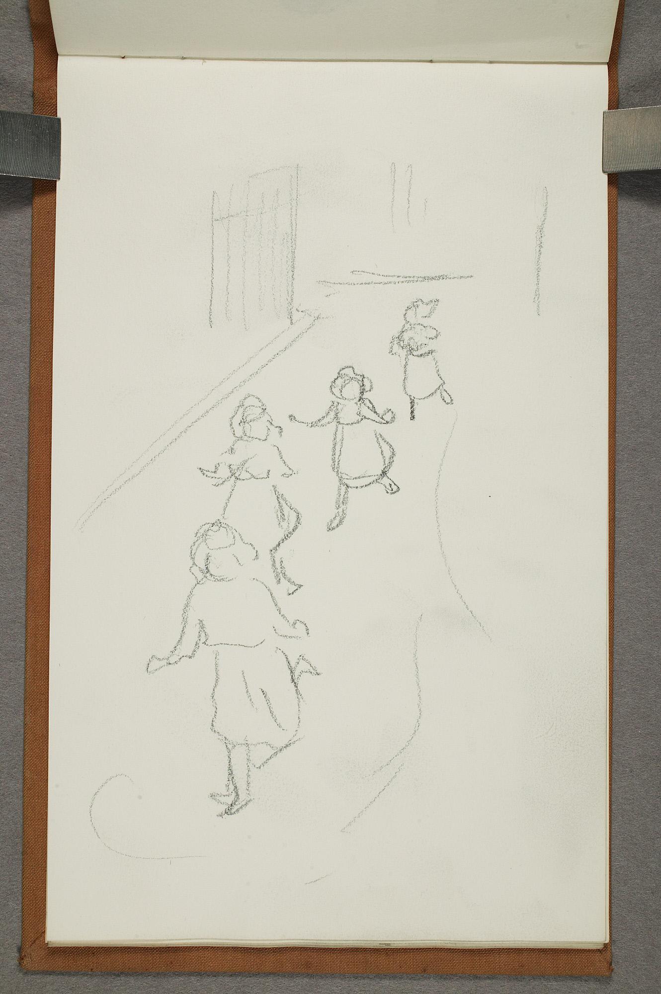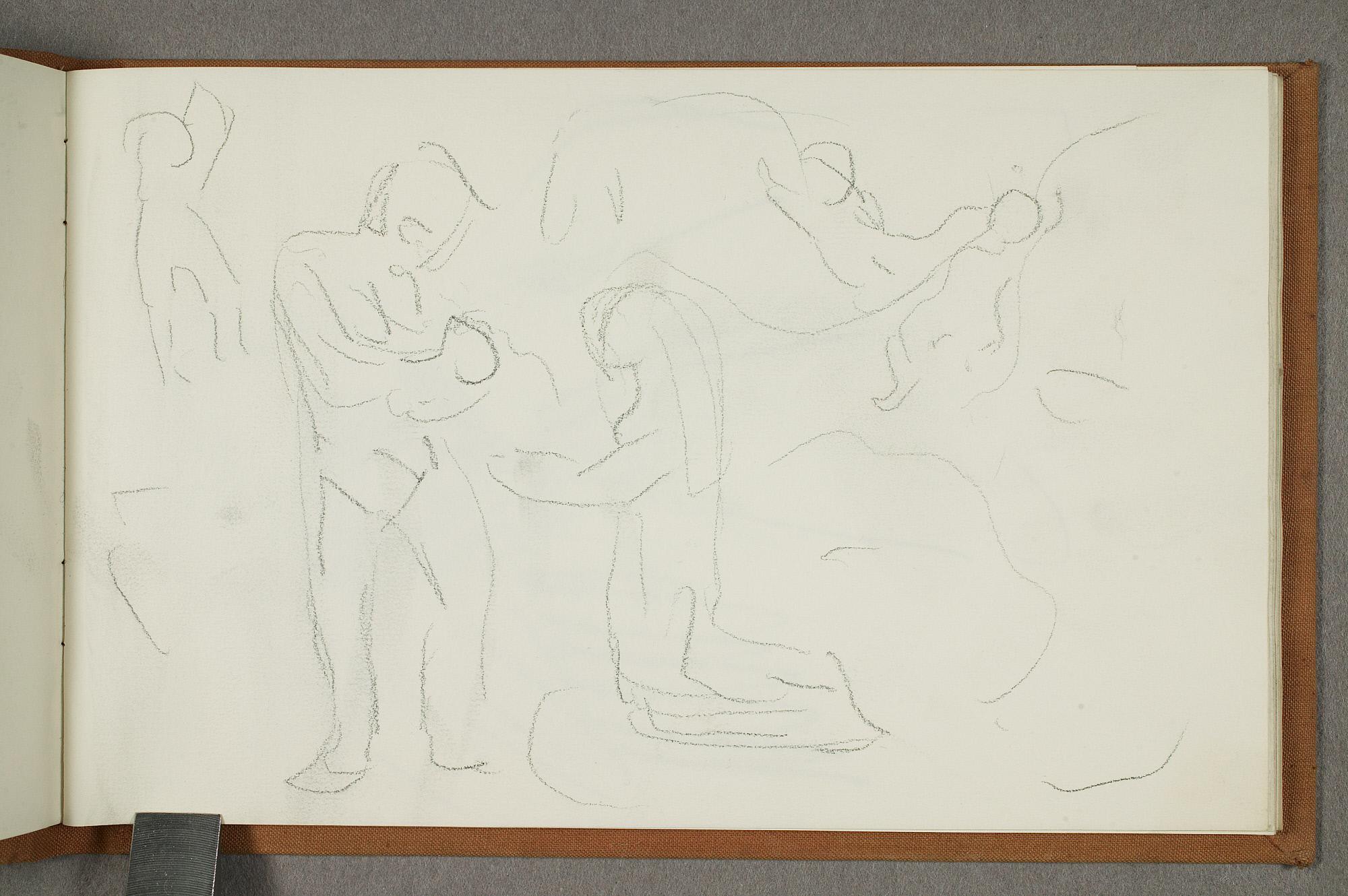 Comment:Skisser til gutten i "Historien" gir et godt utgangspunkt for tidfesting av denne skisseboken. "Historien" var ferdig utarbeidet da det ble sendt til konkurransen om aulautsmykking i august 1911, men under ferdigstillelsen av dekorasjonene i 1914–16 ble guttens positur forandret.
