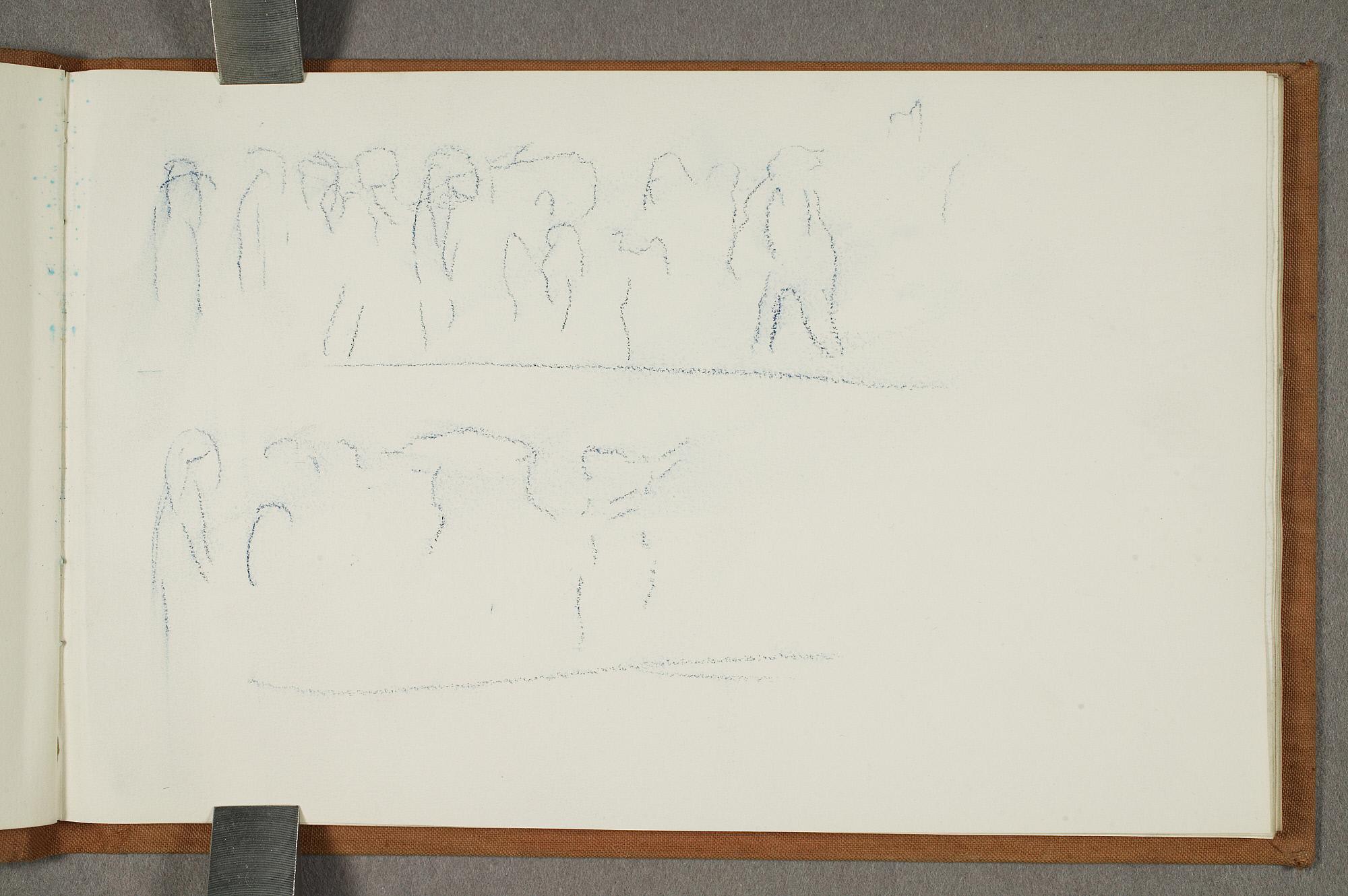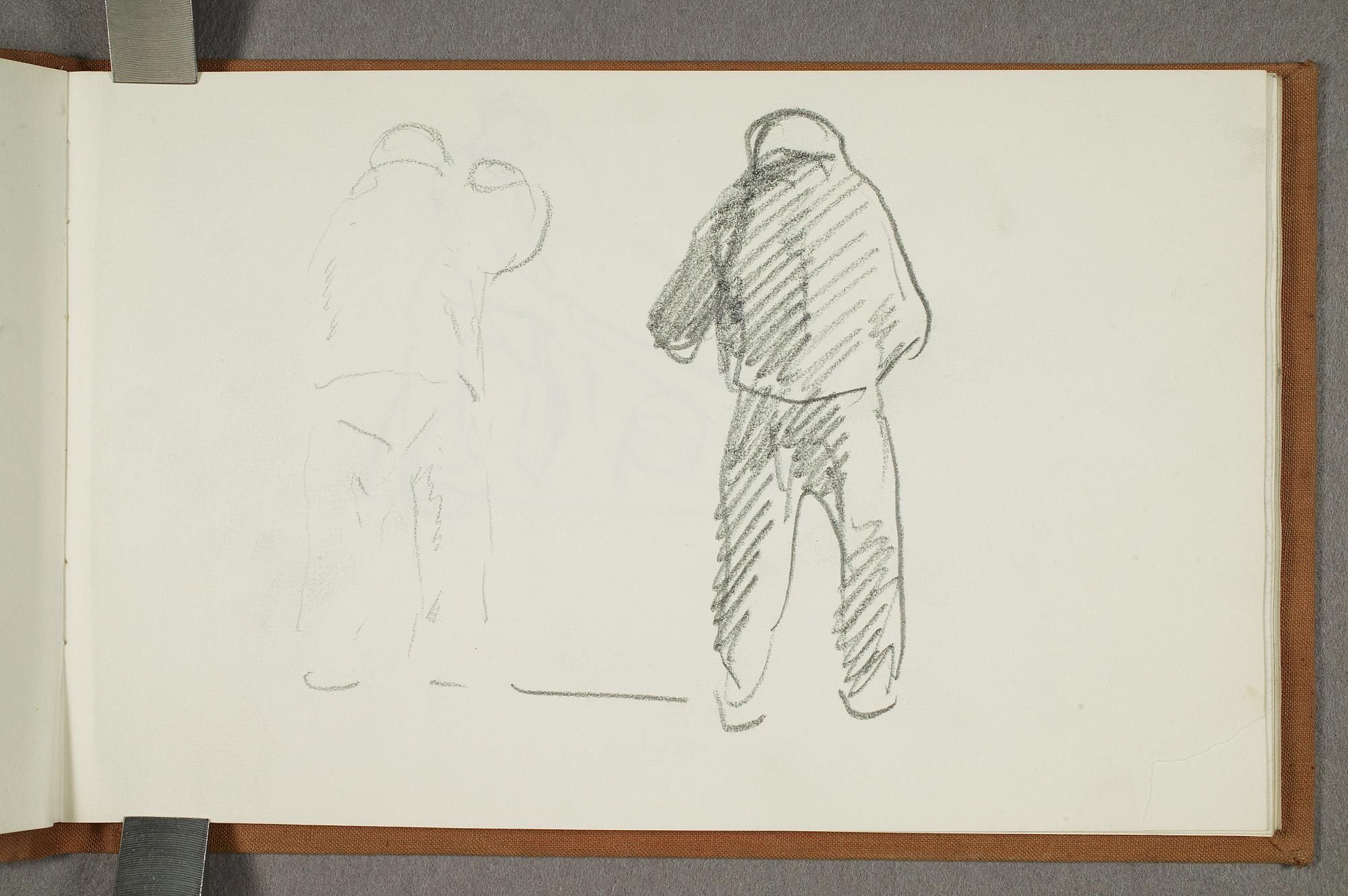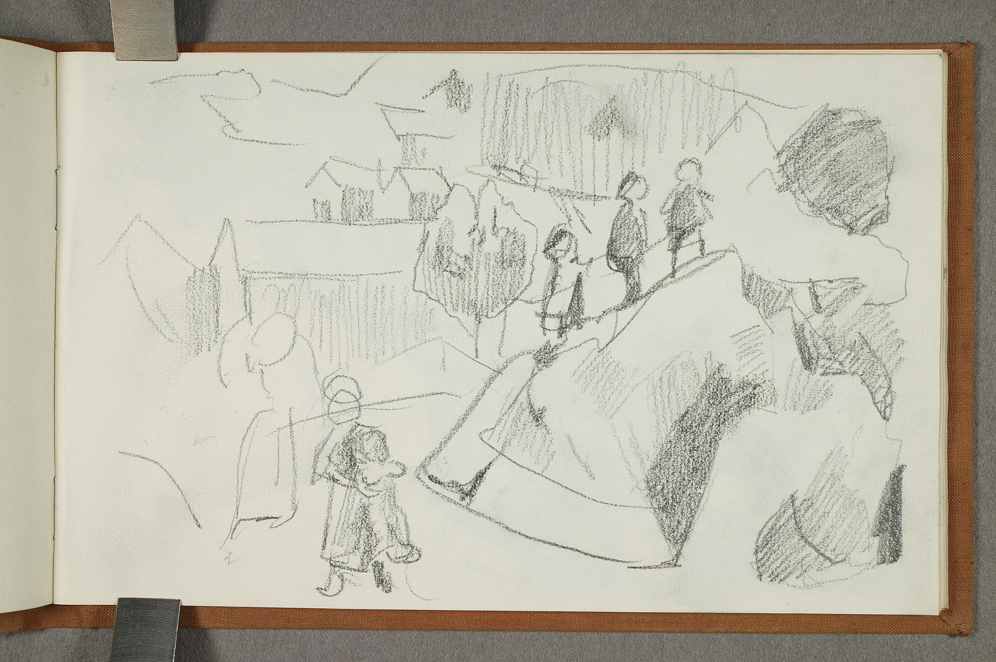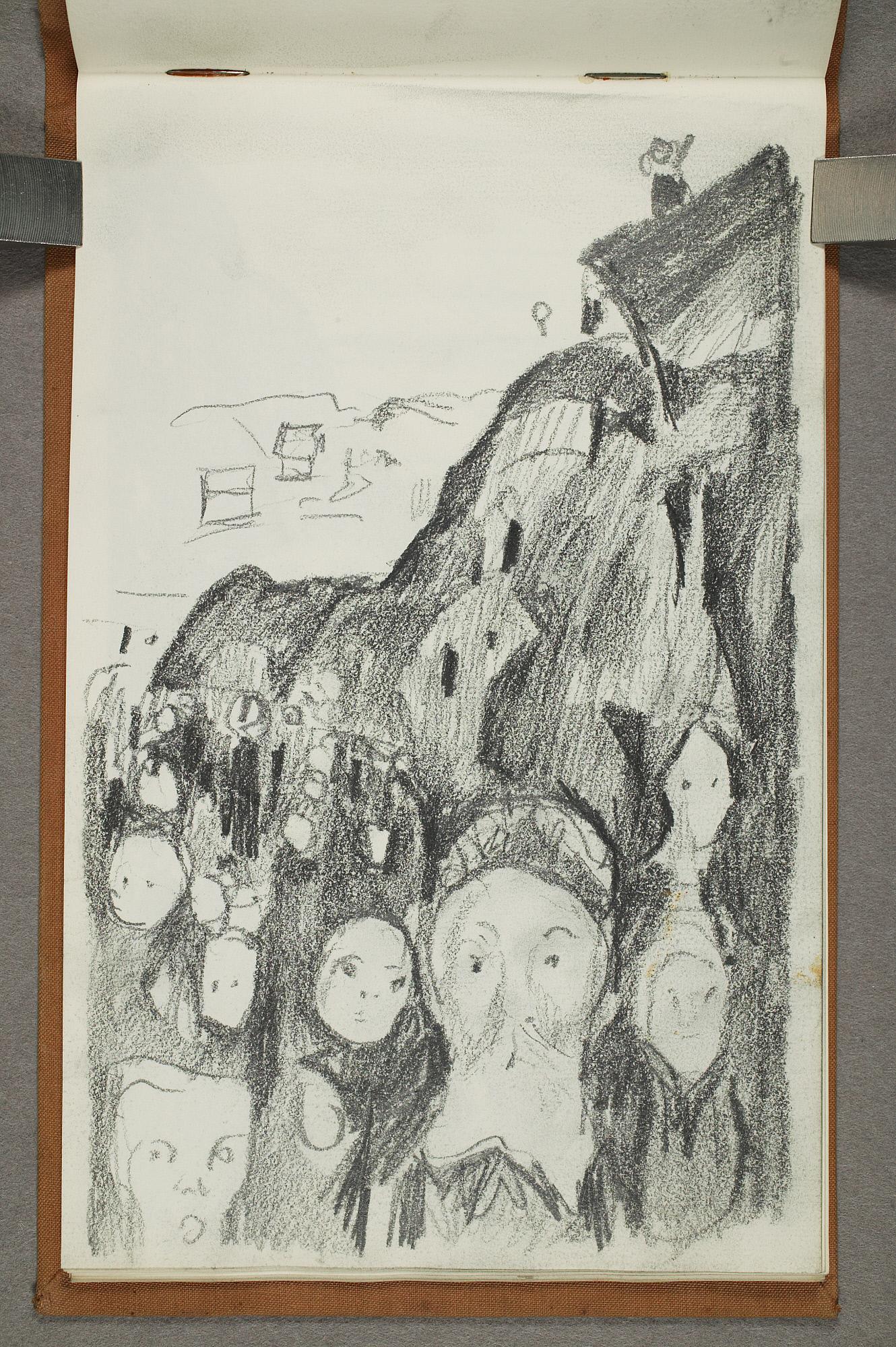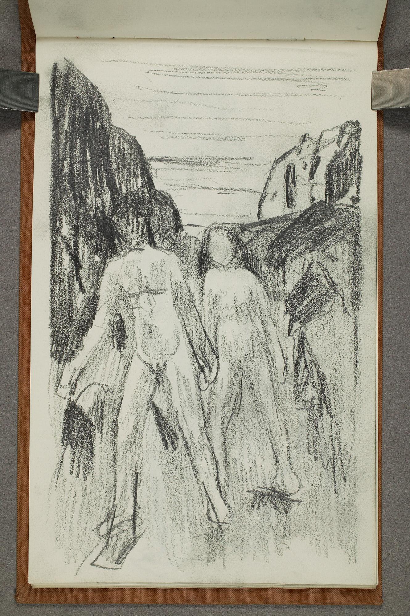 Tegningen av mennesker på flukt på side 20 kan relateres til Ragnarokk-litografiene med samme datering (MM.G.00556-560). Skissebokens datering 1914–15 er uproblematisk. (PP)