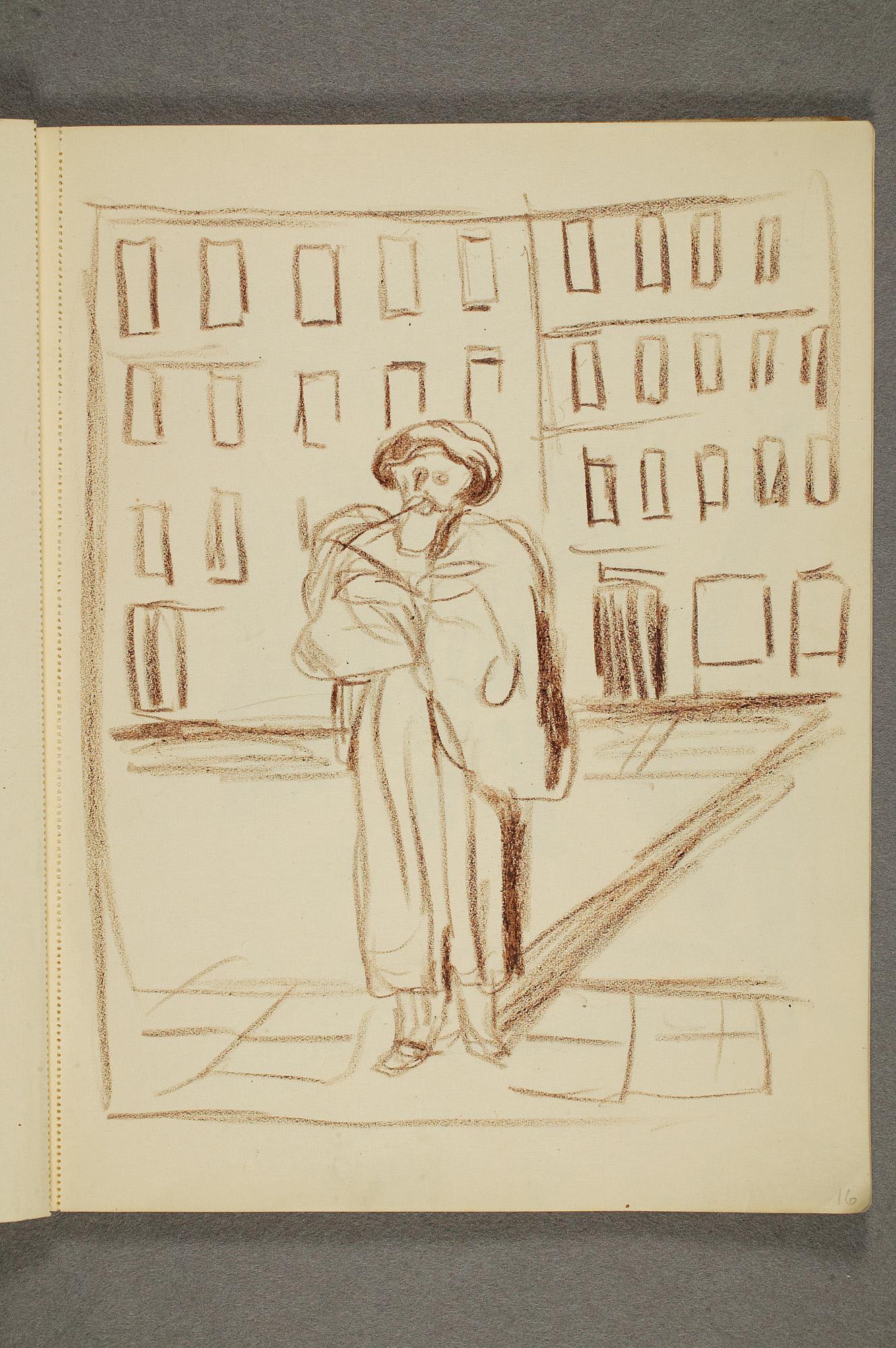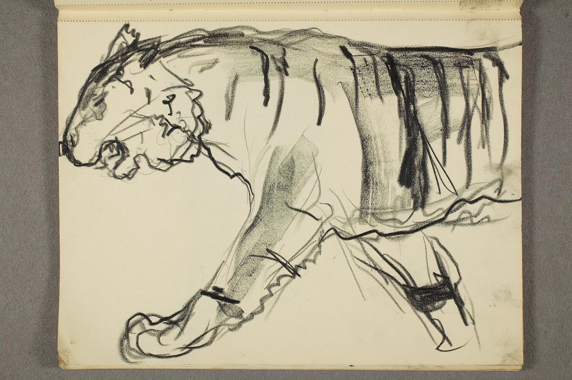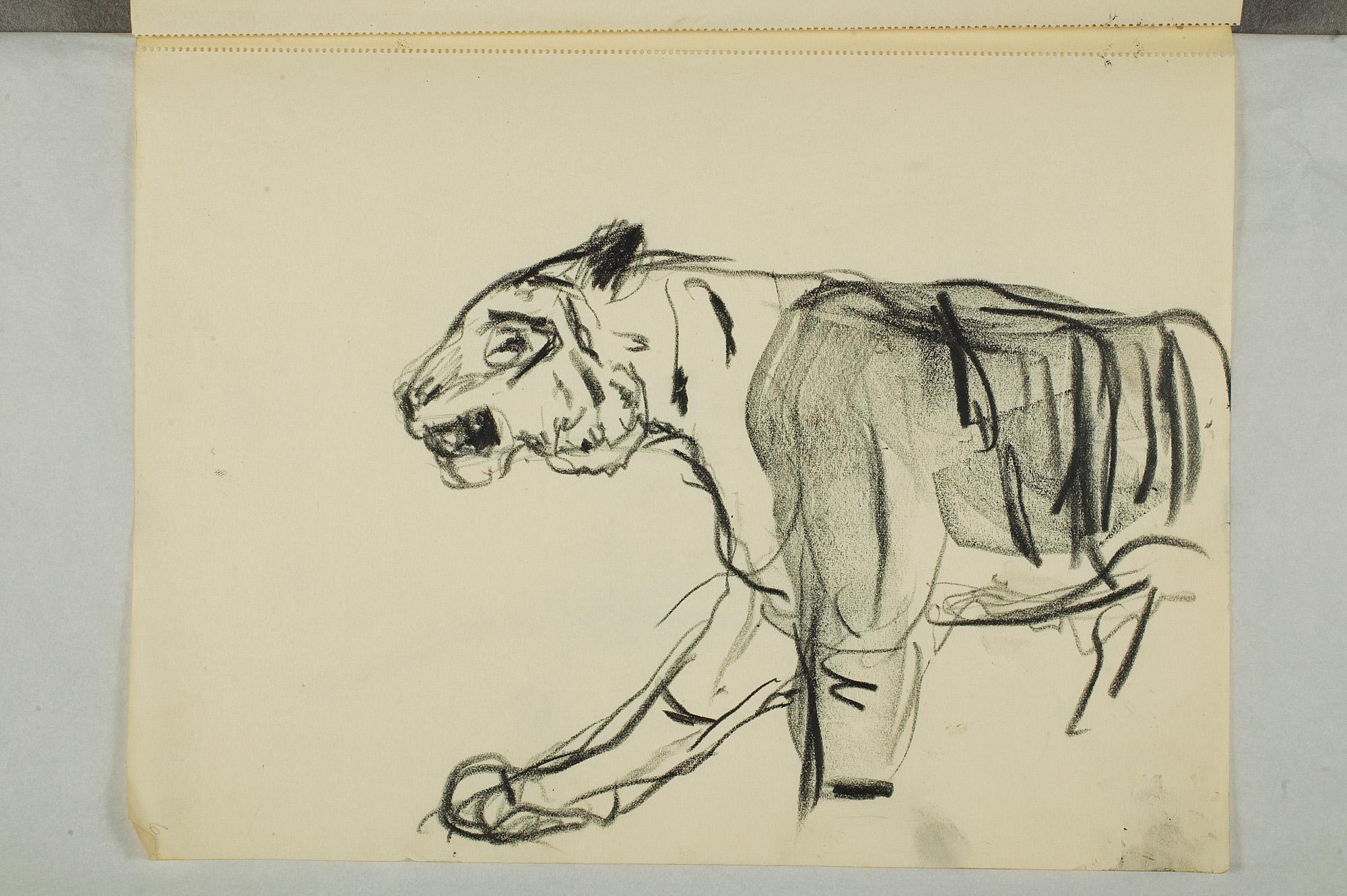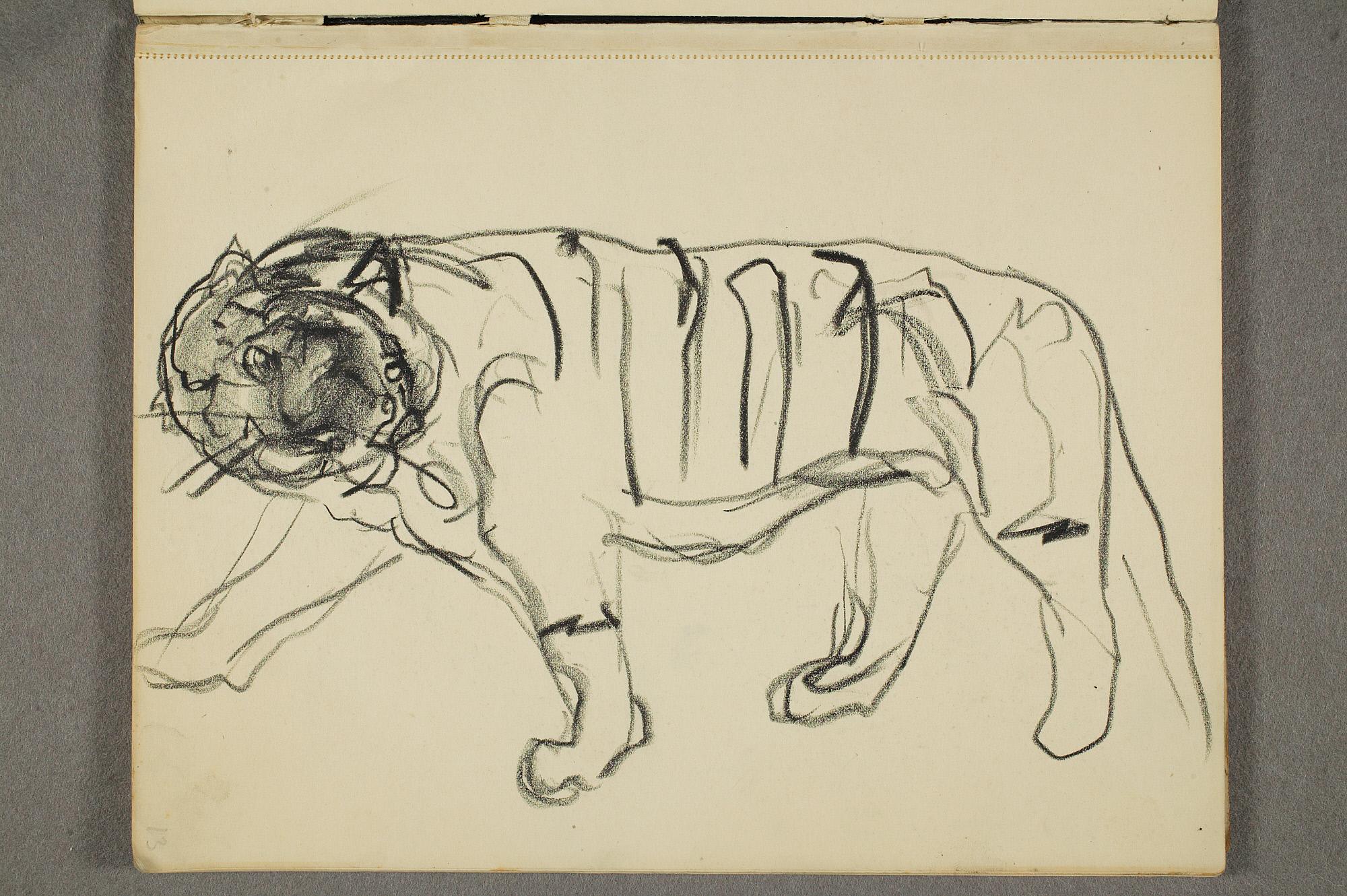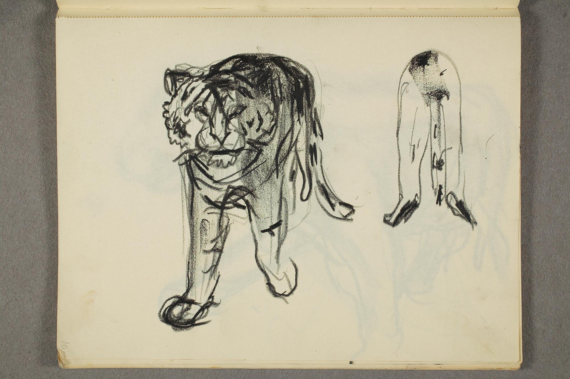 Comment:Flere tigertegninger i skisseboken stammer høyst trolig fra 1908–09. Under sitt opphold på doktor Jacobsons nerveklinikk i København besøkte Munch byens zoologiske hage og utførte studier av forskjellige dyr. Den gående tigeren på side 8 er svært lik tigeren i litografiet fra samme år (MM.G.00284). Andre tegninger avslører at skisseboken var i bruk også da Munch i 1909 flyttet til Kragerø, for eksempel «Mennesker på en trang vei» som er i slekt med maleriene av spaserende mennesker i vinterkledd kystby (MM.M.00493), eller et par skisser til «Alma Mater. Forskerne», et motiv han begynte å arbeide med i 1910. Bygningen på skissebokens første side ser utvilsomt ut som Ljan Herregård ved Hvervenbukta, oppført i ca. 1765. Gården brant ned 1913. (PP)
