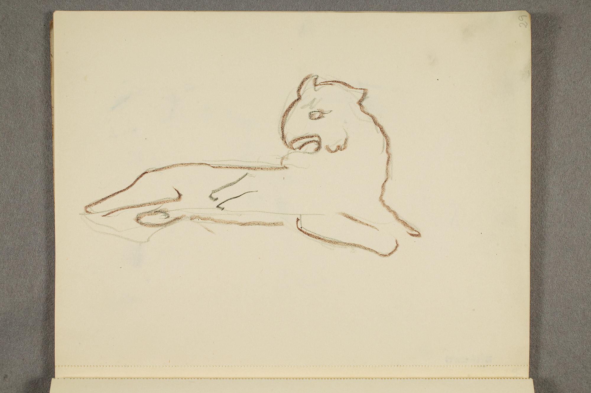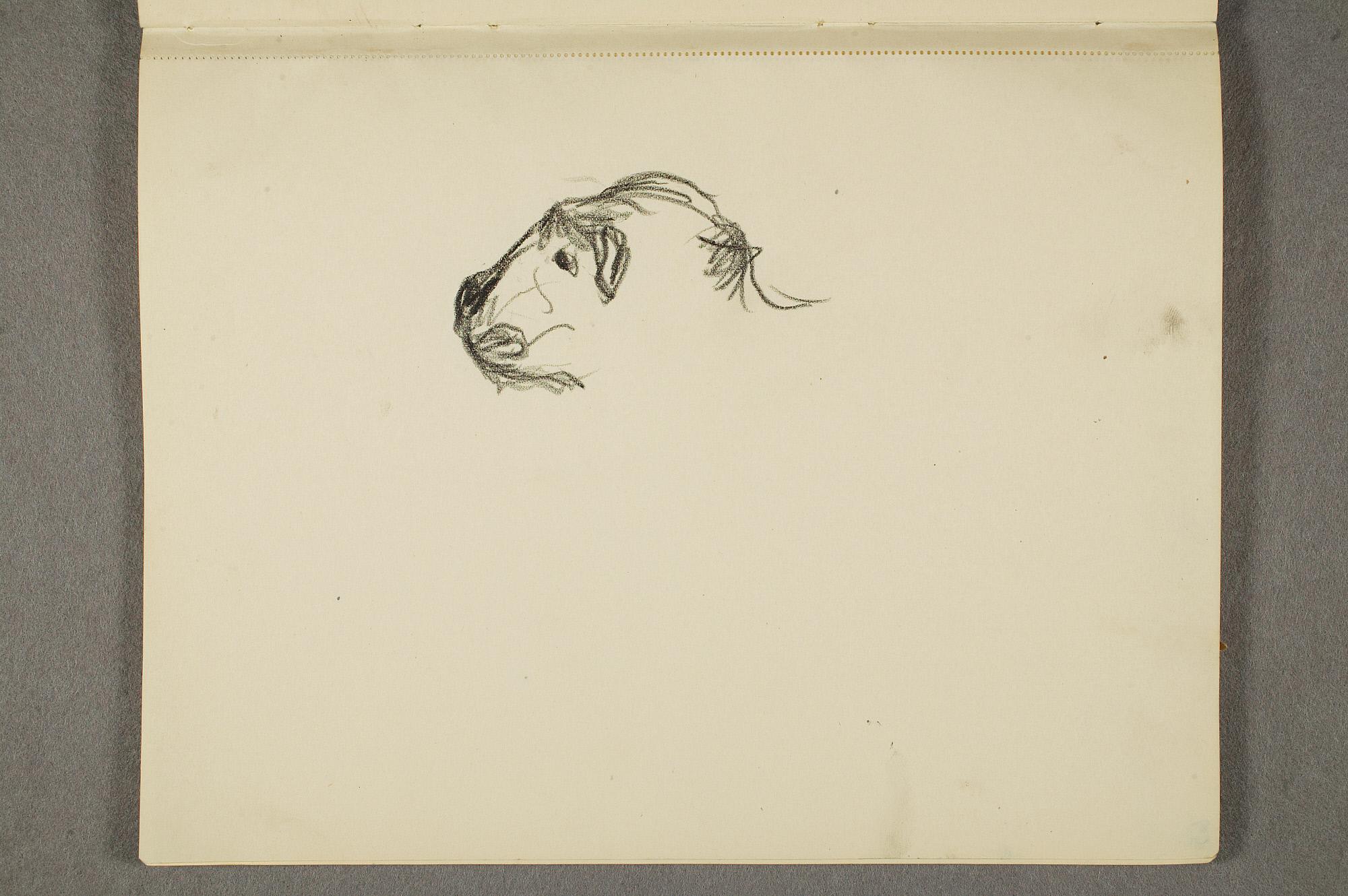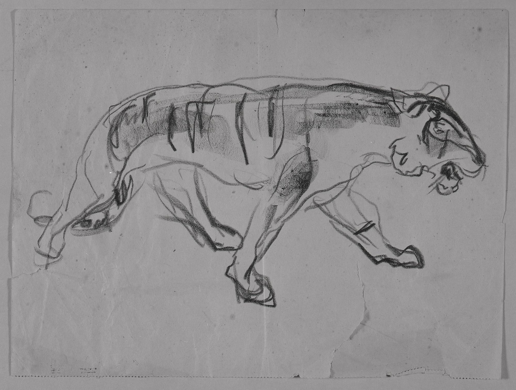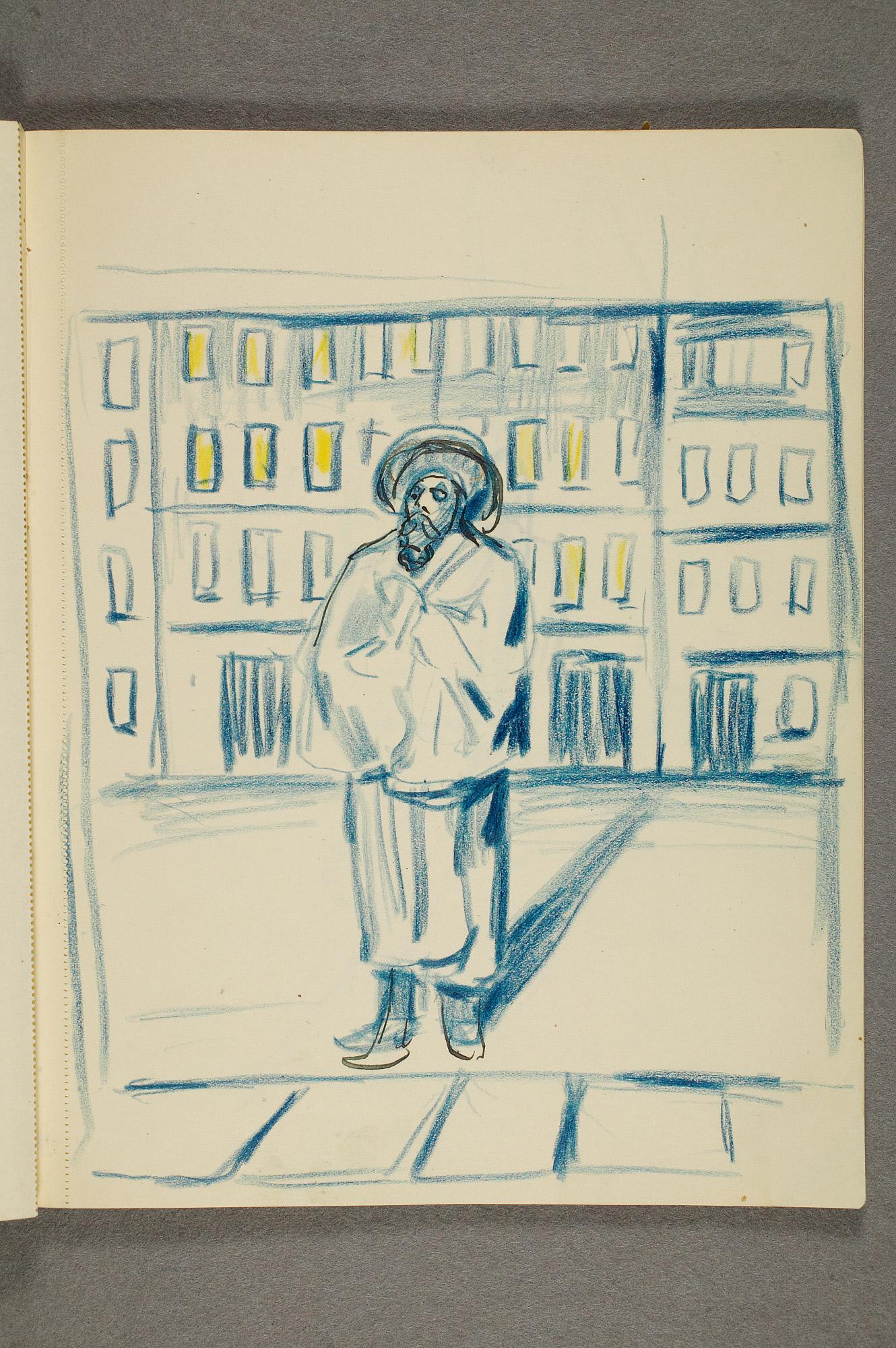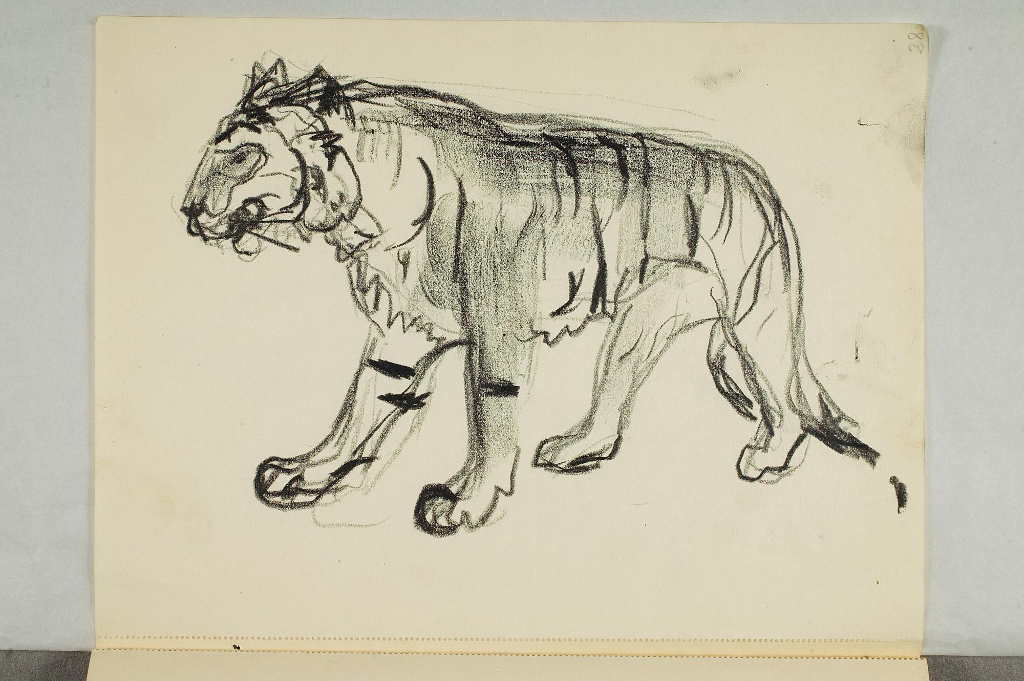 Comment:Flere tigertegninger i skisseboken stammer høyst trolig fra 1908–09. Under sitt opphold på doktor Jacobsons nerveklinikk i København besøkte Munch byens zoologiske hage og utførte studier av forskjellige dyr. Den gående tigeren på side 8 er svært lik tigeren i litografiet fra samme år (MM.G.00284). Andre tegninger avslører at skisseboken var i bruk også da Munch i 1909 flyttet til Kragerø, for eksempel «Mennesker på en trang vei» som er i slekt med maleriene av spaserende mennesker i vinterkledd kystby (MM.M.00493), eller et par skisser til «Alma Mater. Forskerne», et motiv han begynte å arbeide med i 1910. Bygningen på skissebokens første side ser utvilsomt ut som Ljan Herregård ved Hvervenbukta, oppført i ca. 1765. Gården brant ned 1913. (PP)