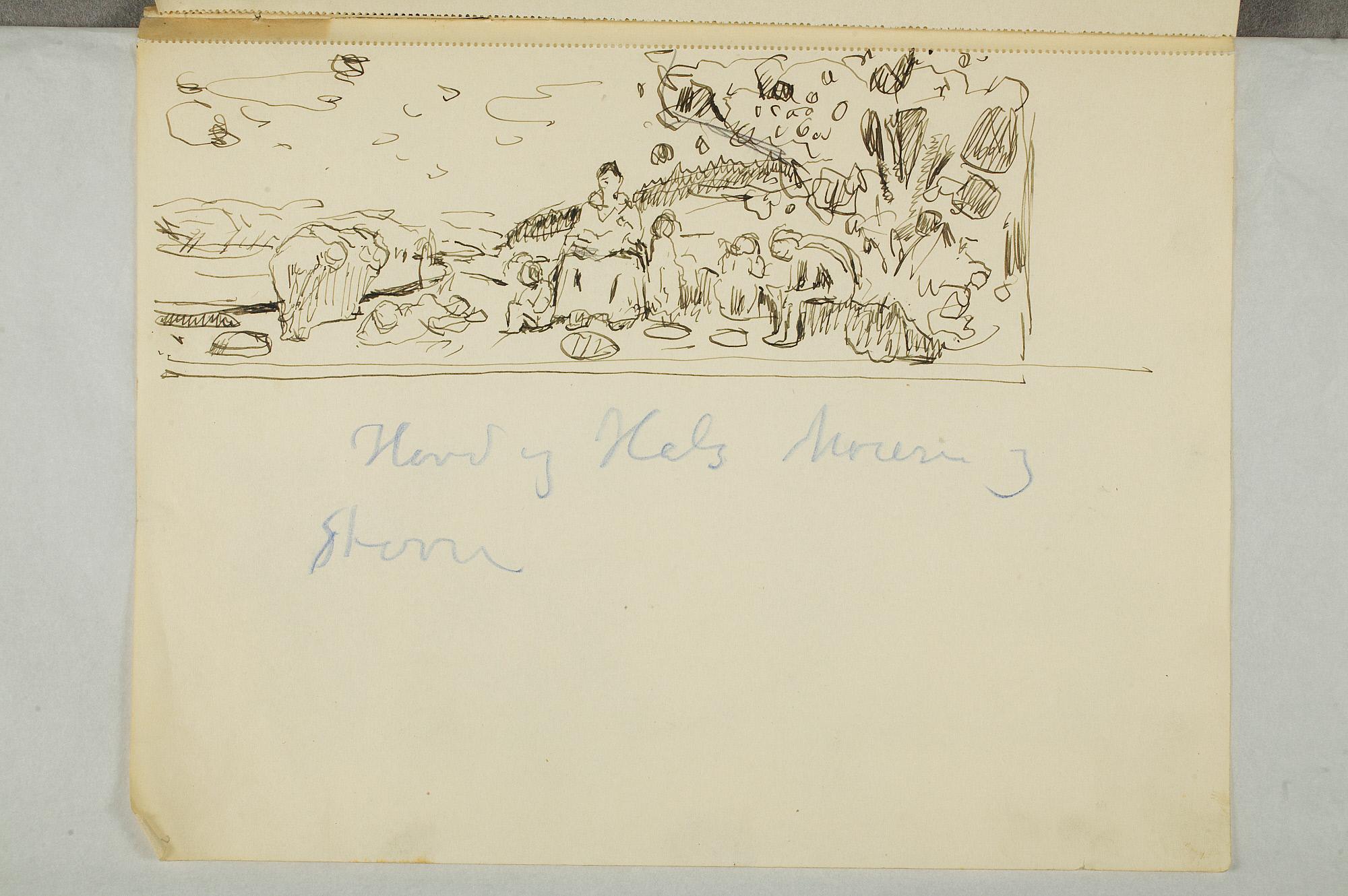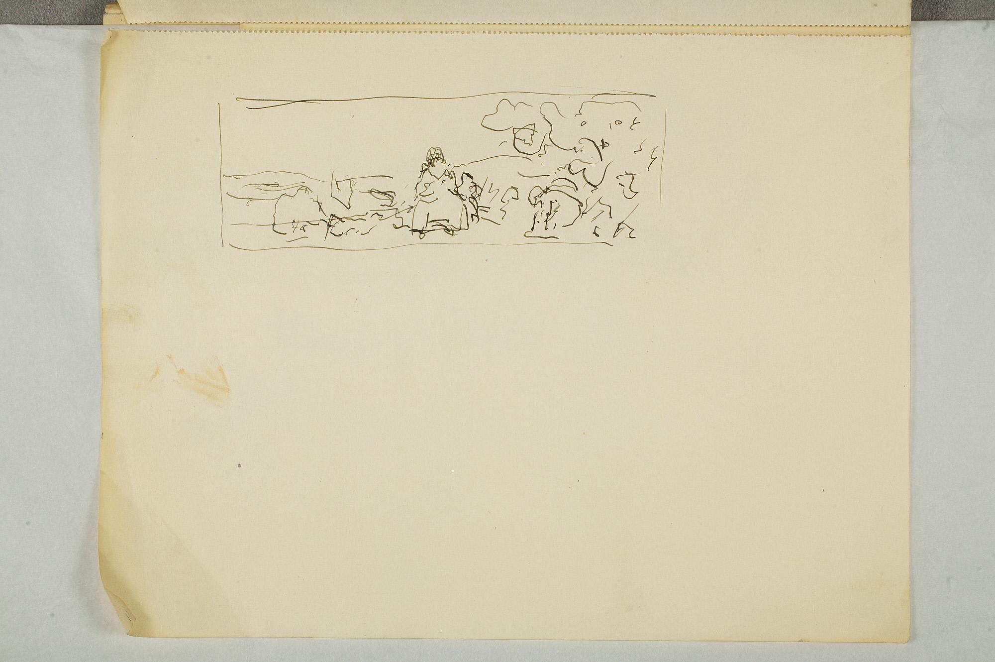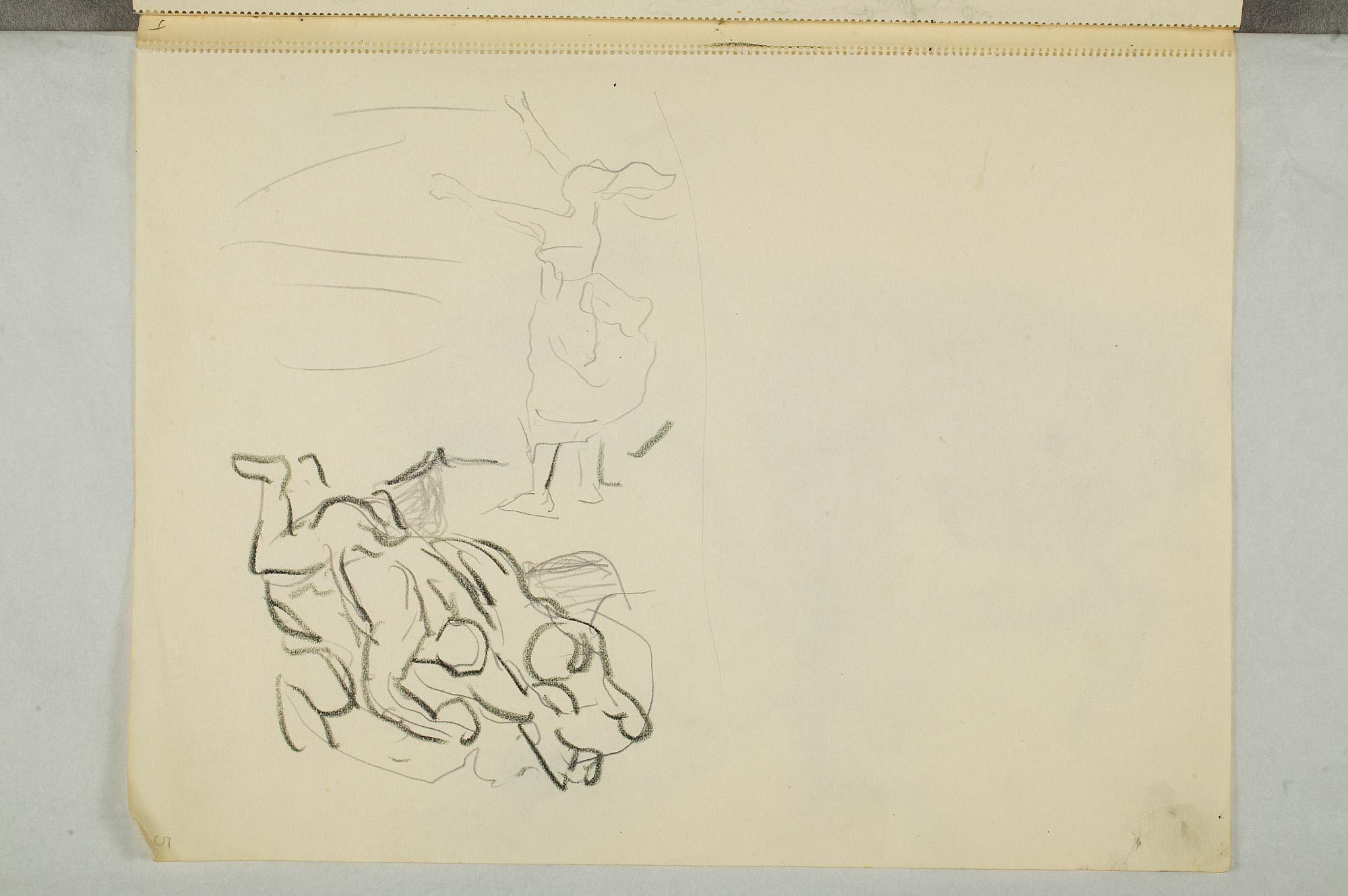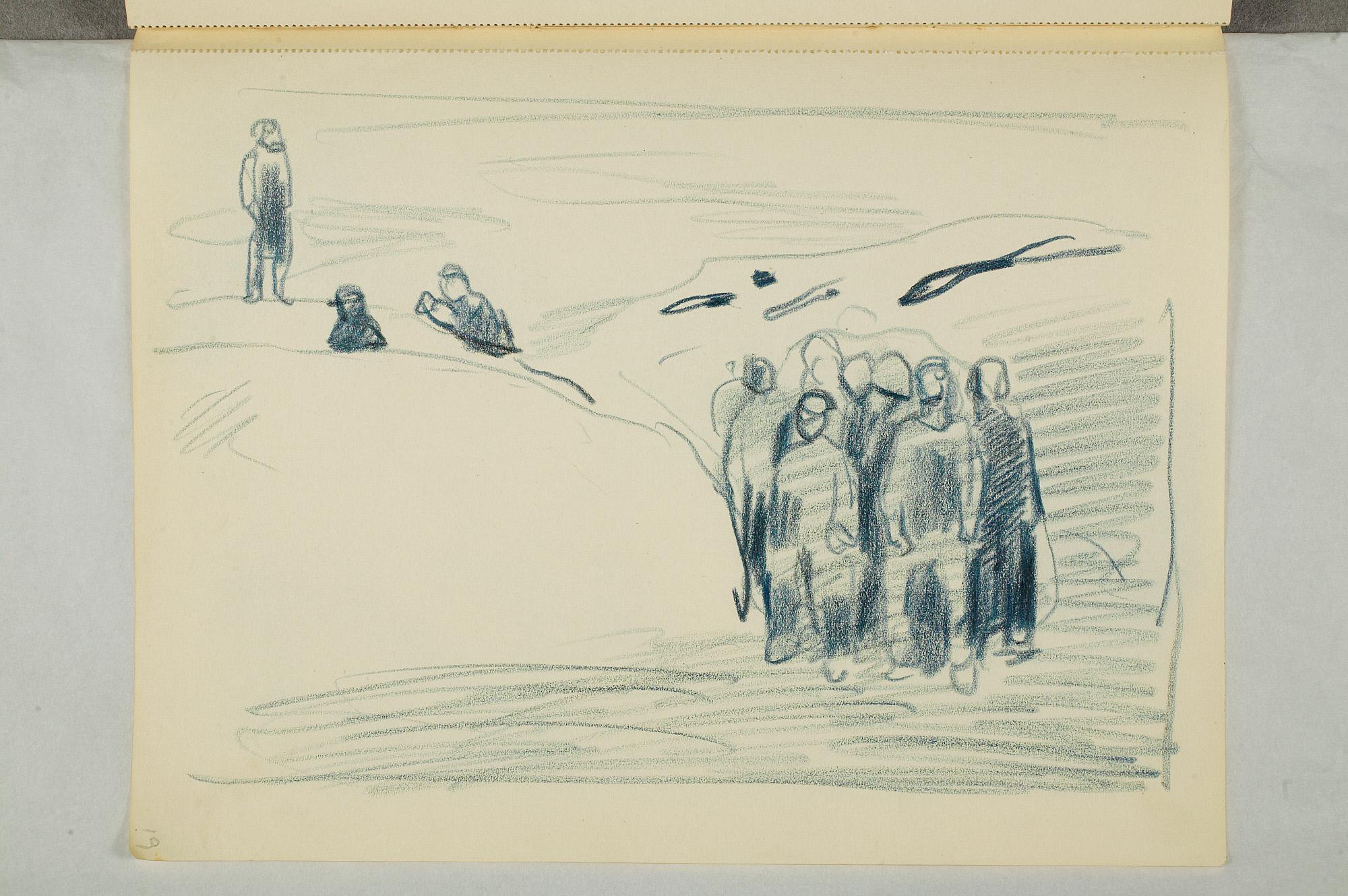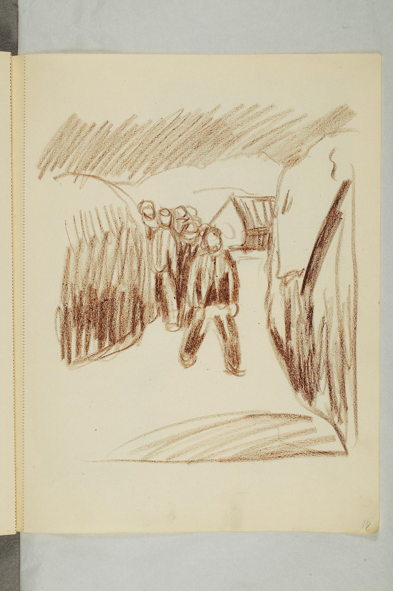 Comment:Flere tigertegninger i skisseboken stammer høyst trolig fra 1908–09. Under sitt opphold på doktor Jacobsons nerveklinikk i København besøkte Munch byens zoologiske hage og utførte studier av forskjellige dyr. Den gående tigeren på side 8 er svært lik tigeren i litografiet fra samme år (MM.G.00284). Andre tegninger avslører at skisseboken var i bruk også da Munch i 1909 flyttet til Kragerø, for eksempel «Mennesker på en trang vei» som er i slekt med maleriene av spaserende mennesker i vinterkledd kystby (MM.M.00493), eller et par skisser til «Alma Mater. Forskerne», et motiv han begynte å arbeide med i 1910. Bygningen på skissebokens første side ser utvilsomt ut som Ljan Herregård ved Hvervenbukta, oppført i ca. 1765. Gården brant ned 1913. (PP)