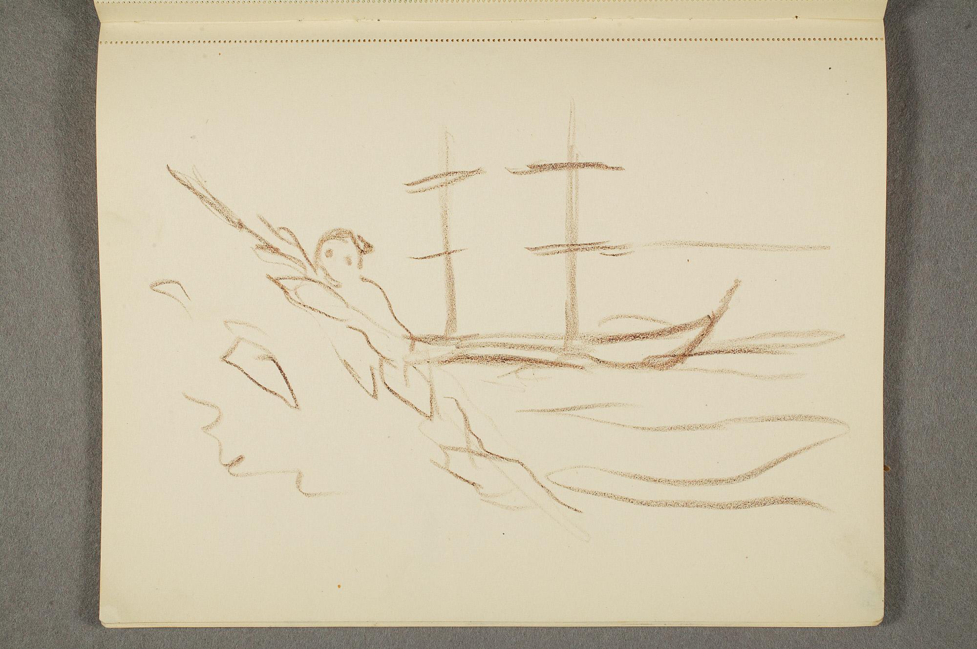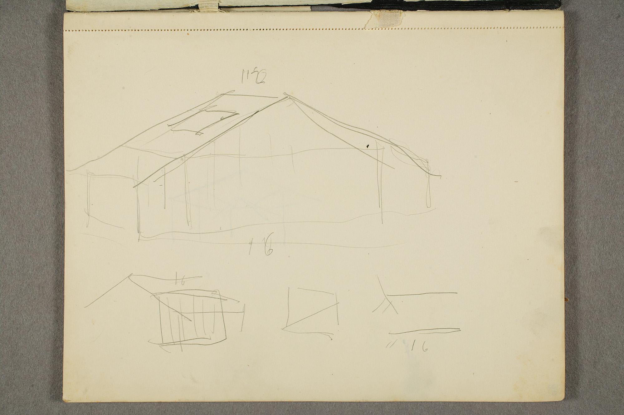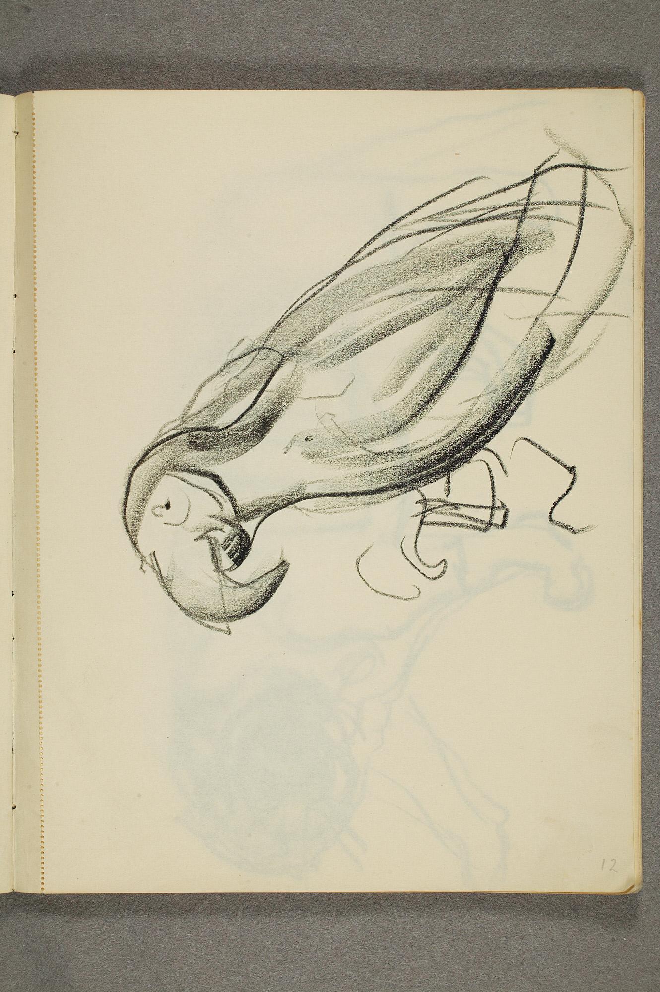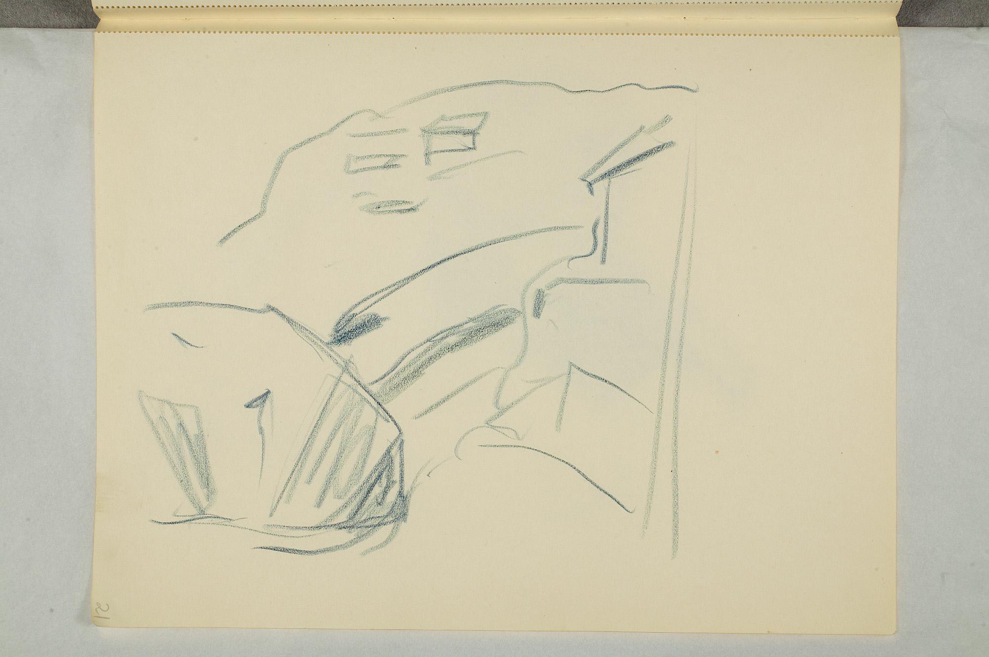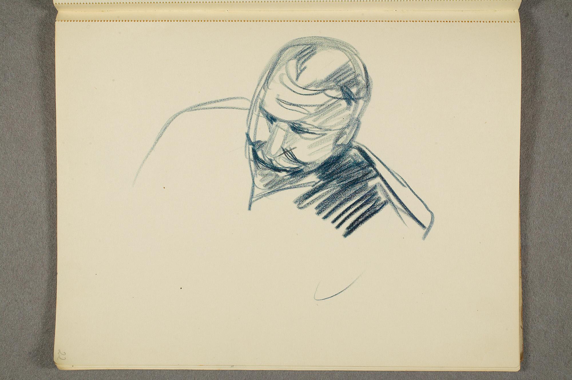 Comment:Flere tigertegninger i skisseboken stammer høyst trolig fra 1908–09. Under sitt opphold på doktor Jacobsons nerveklinikk i København besøkte Munch byens zoologiske hage og utførte studier av forskjellige dyr. Den gående tigeren på side 8 er svært lik tigeren i litografiet fra samme år (MM.G.00284). Andre tegninger avslører at skisseboken var i bruk også da Munch i 1909 flyttet til Kragerø, for eksempel «Mennesker på en trang vei» som er i slekt med maleriene av spaserende mennesker i vinterkledd kystby (MM.M.00493), eller et par skisser til «Alma Mater. Forskerne», et motiv han begynte å arbeide med i 1910. Bygningen på skissebokens første side ser utvilsomt ut som Ljan Herregård ved Hvervenbukta, oppført i ca. 1765. Gården brant ned 1913. (PP)