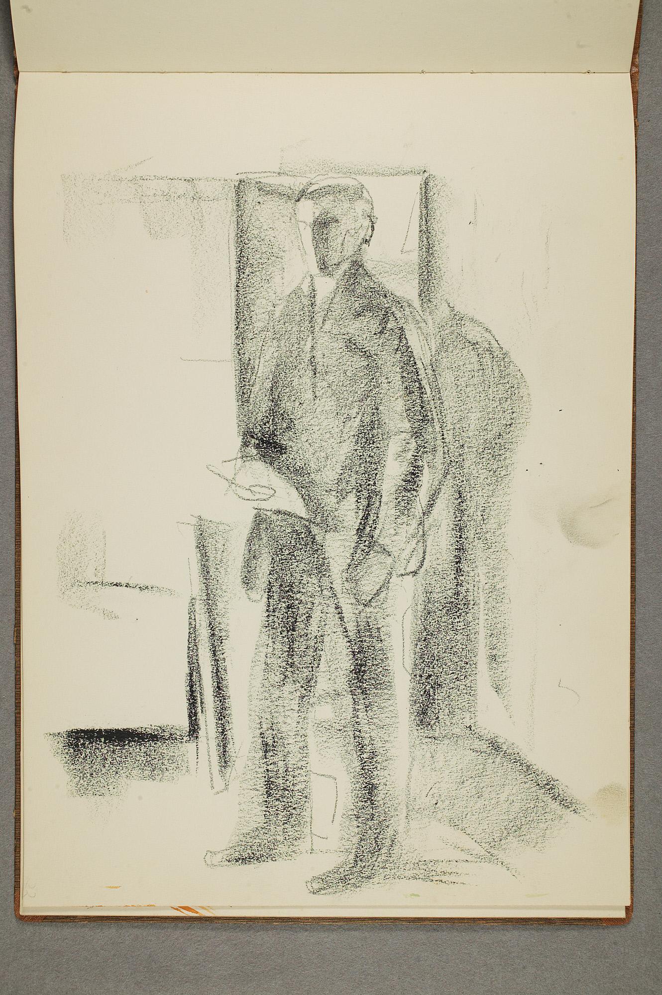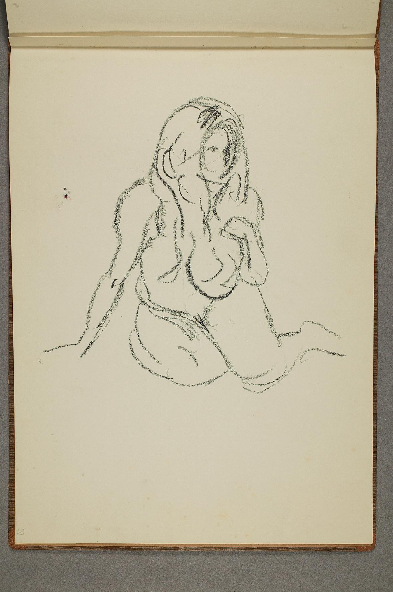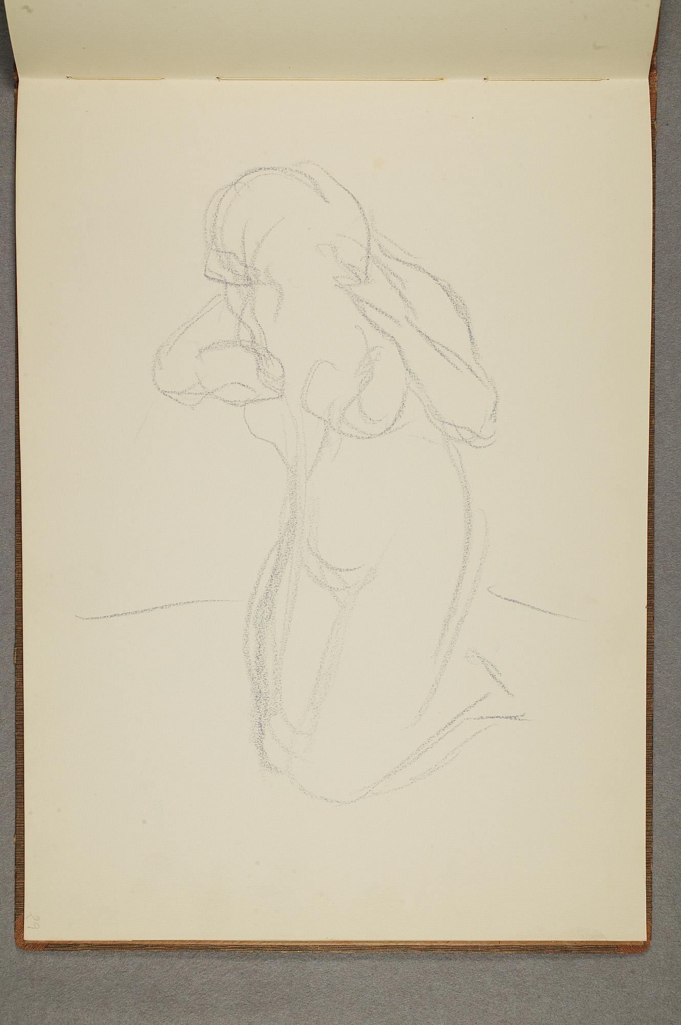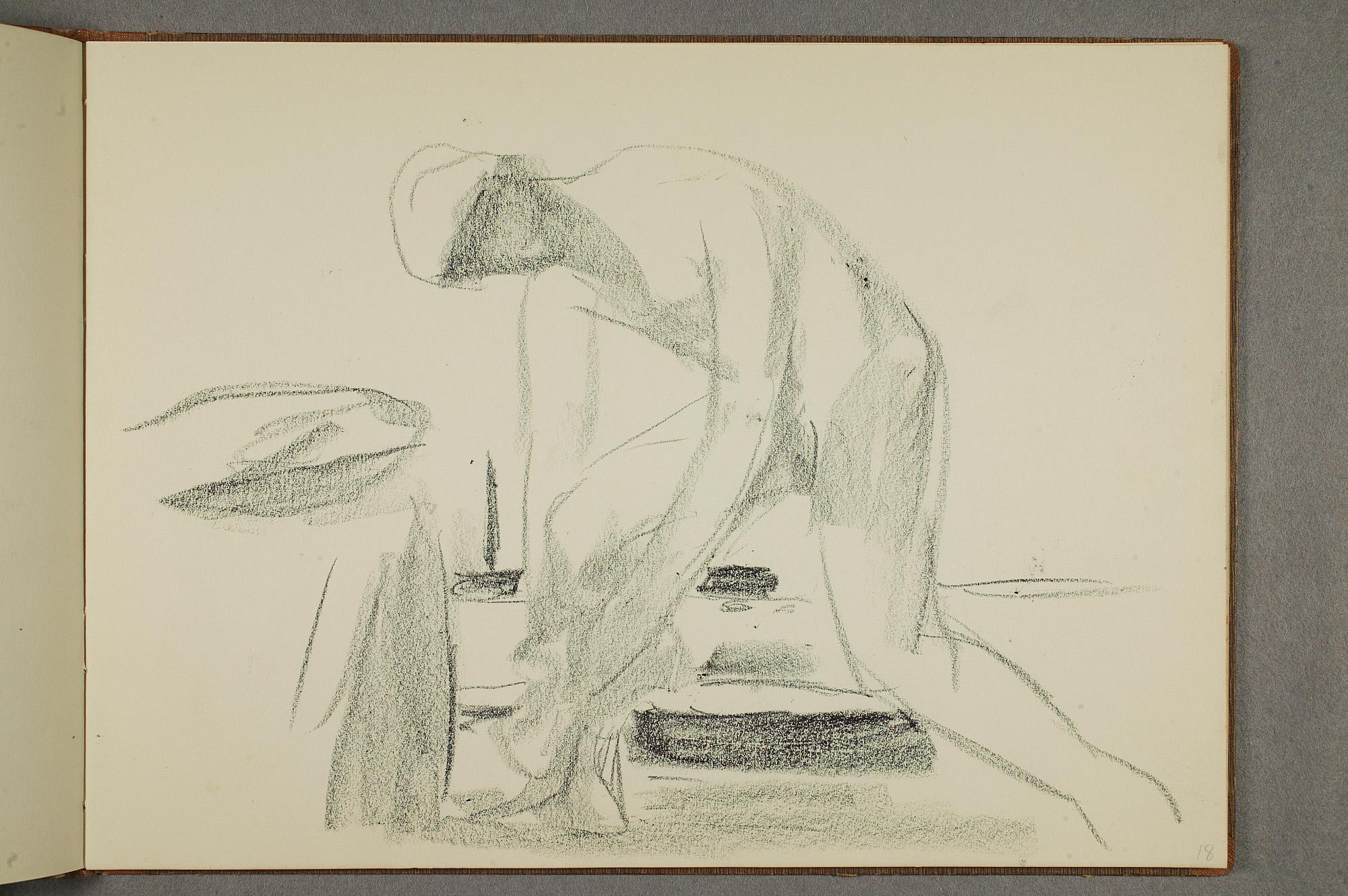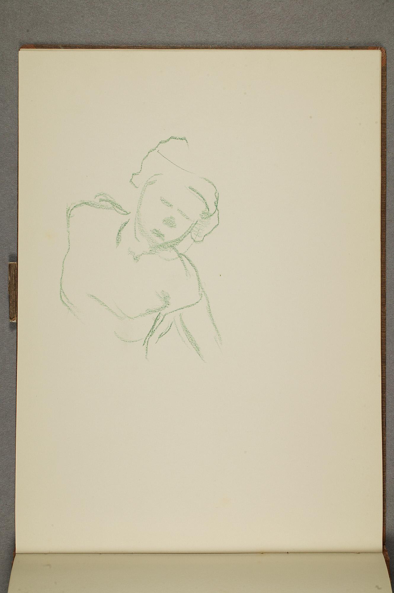 Comment:On page 5 in this sketchbook, Munch has made the following note: "Miss Robert / 16 Ullevold Road / ground floor". In 1918, 16 Ullevold Road was under construction, hence 1919 must be the first possible year. As the book ends with a drawing from the fire at Grønland in 1919, we choose 1919 as a plausible dating for the entire book. (MB)