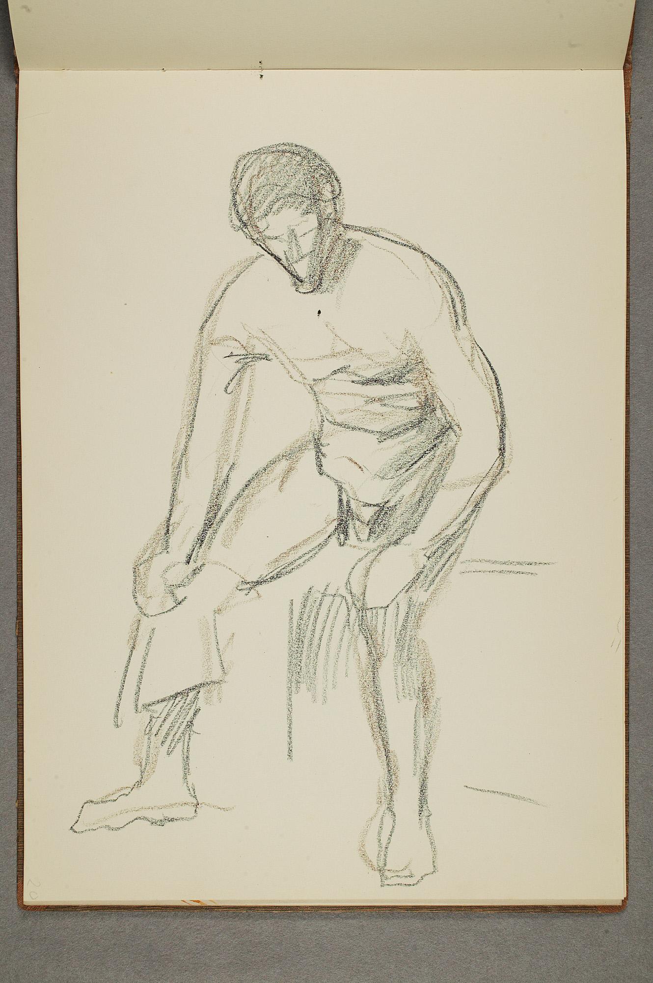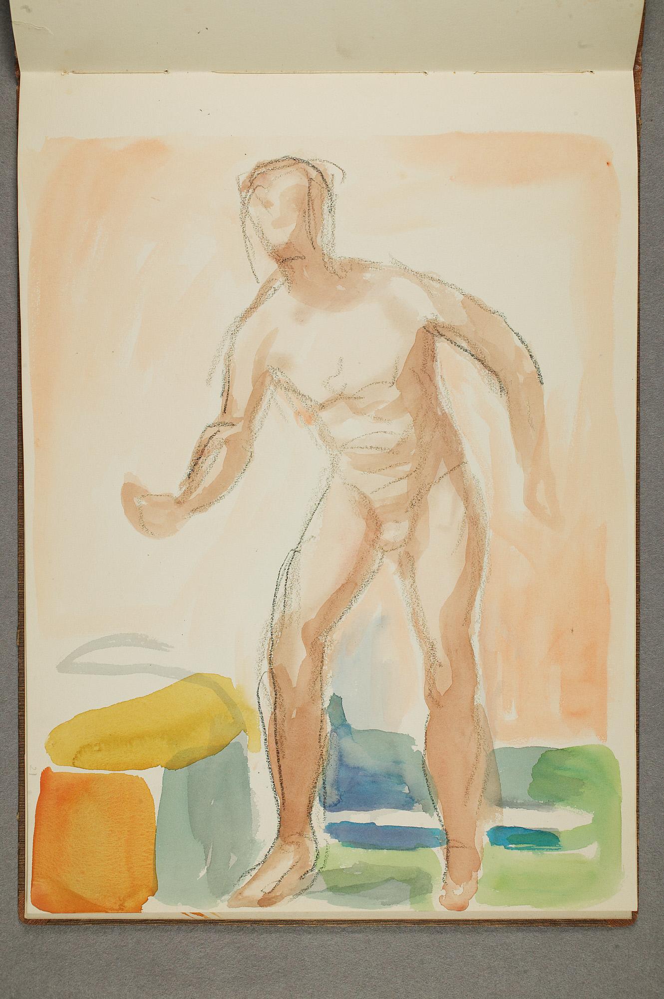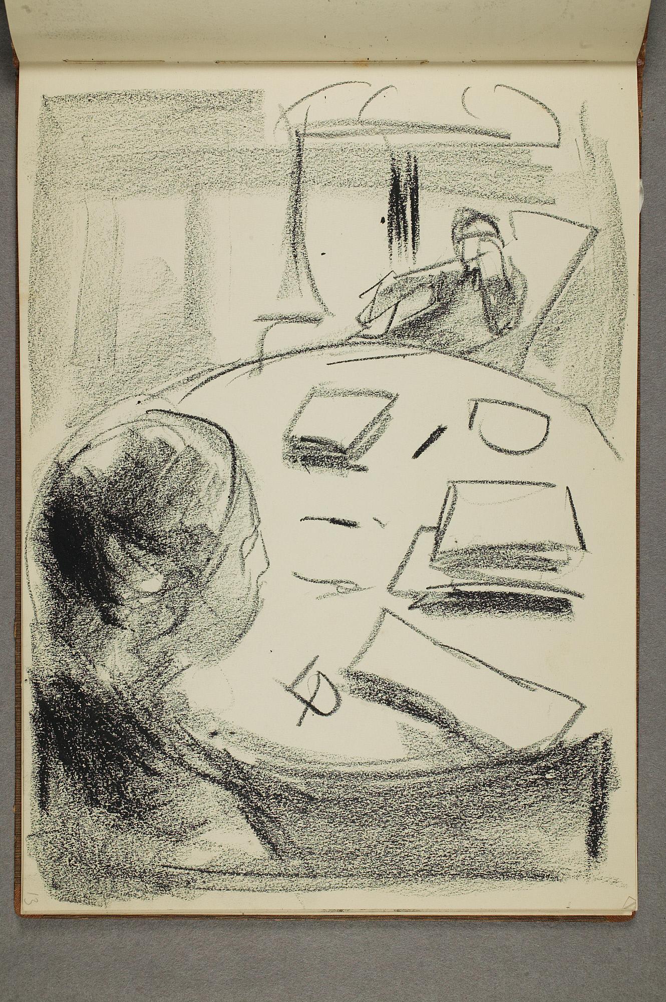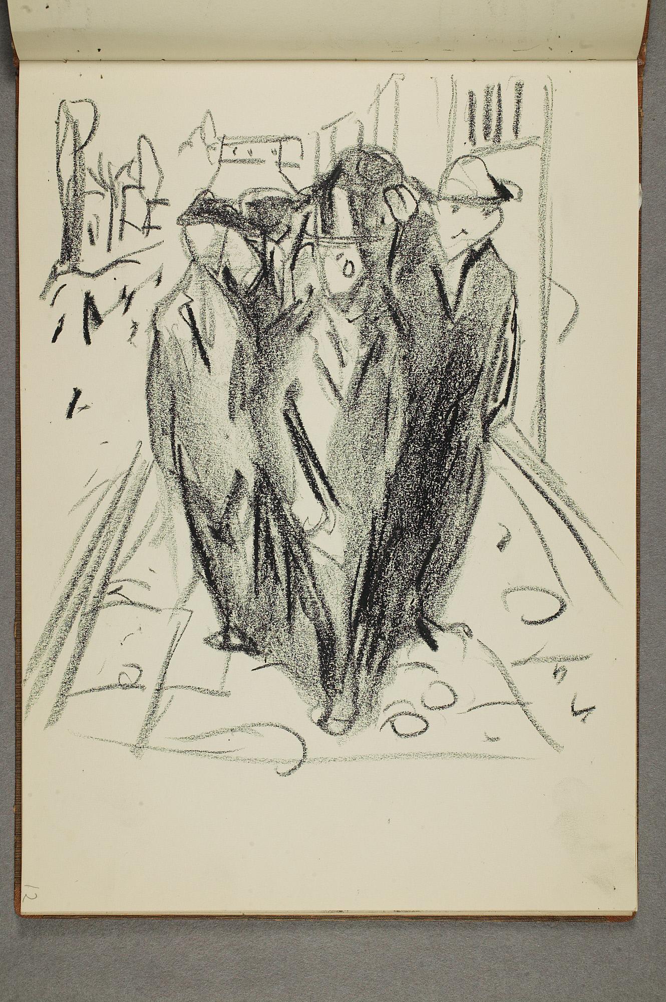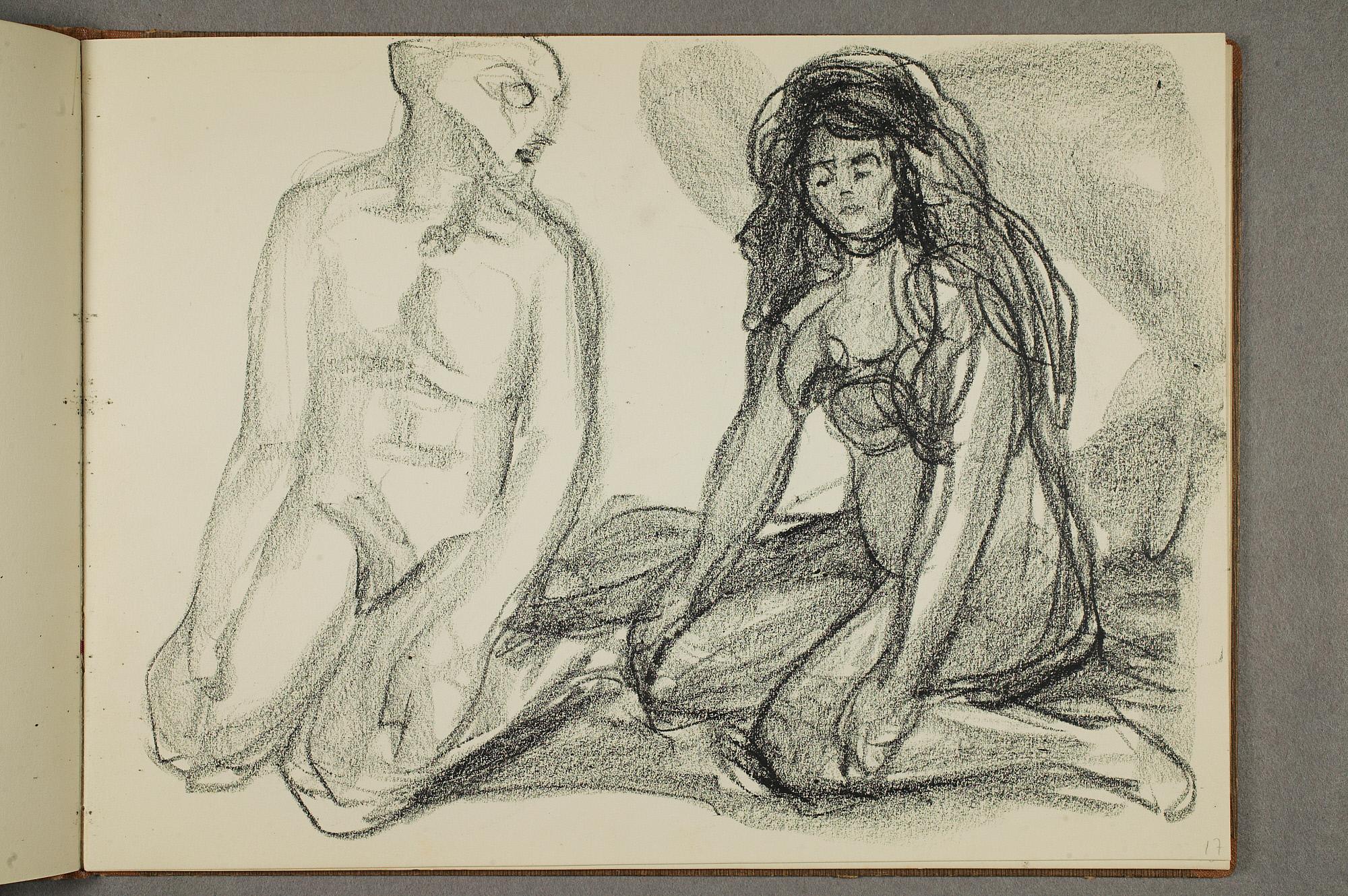 Comment:On page 5 in this sketchbook, Munch has made the following note: "Miss Robert / 16 Ullevold Road / ground floor". In 1918, 16 Ullevold Road was under construction, hence 1919 must be the first possible year. As the book ends with a drawing from the fire at Grønland in 1919, we choose 1919 as a plausible dating for the entire book. (MB)