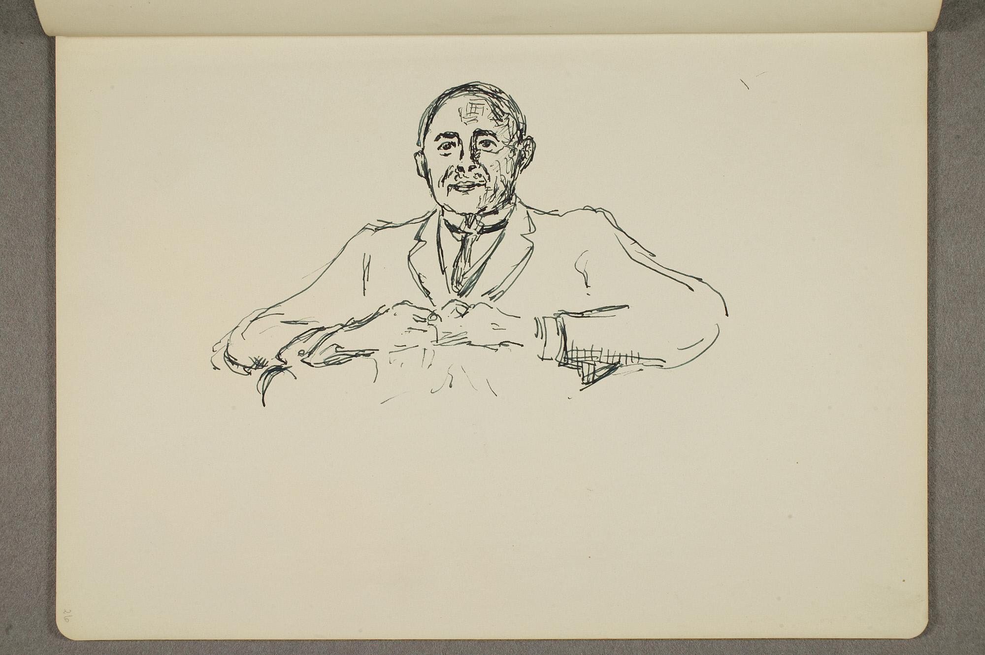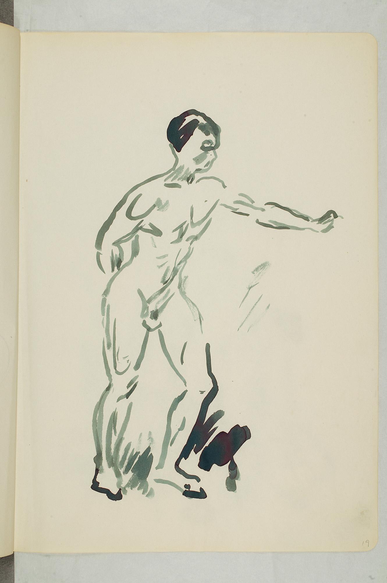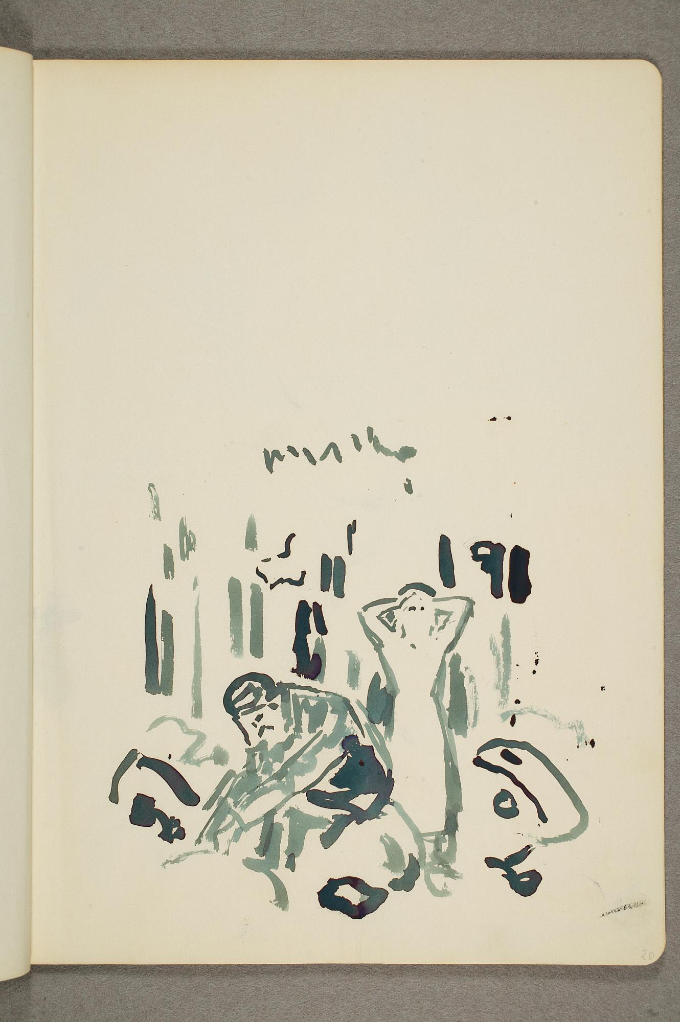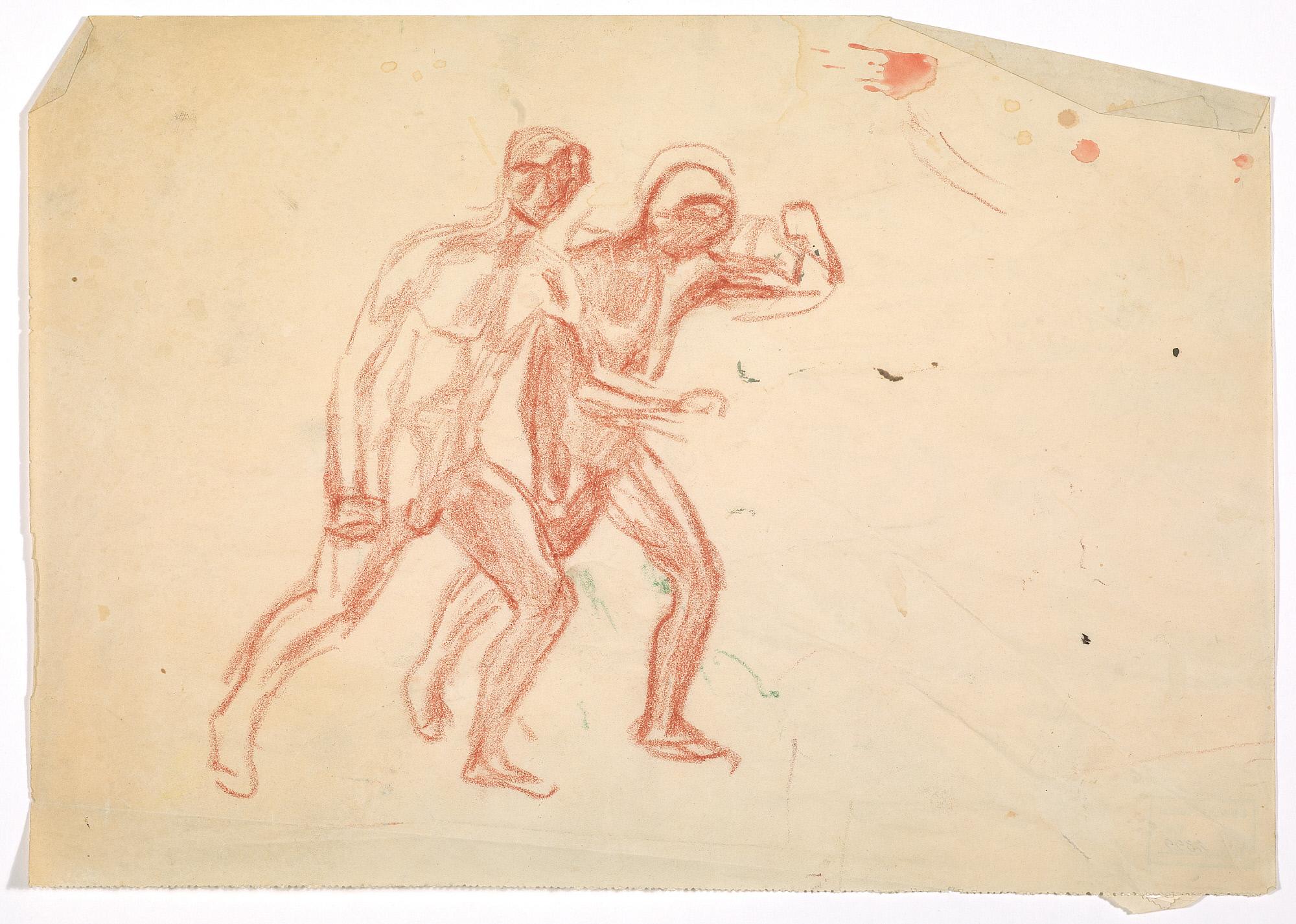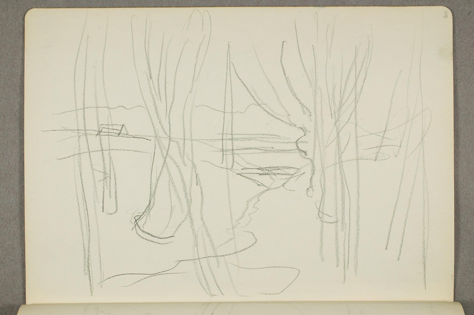 Comment:Flere studietegninger til blant annet "Krigen/Stormen" fra annen halvdel av 1920-tallet har tilhørt denne skisseboken, bl.a. MM.T.01178 og MM.T.2399. Se også maleriene med samme motiv: MM.M.00955, MM.M.00910, MM.M.00805, PE.M.02016. Landskapet med trær på side 60 er tegnet ved den røde låven på Ekely, og relateres til flere malerier fra ca 1926 (MM.M.00529, PE.M.00517, PE.M.00518, PE.M.00519, PE.M.00520). (PP)