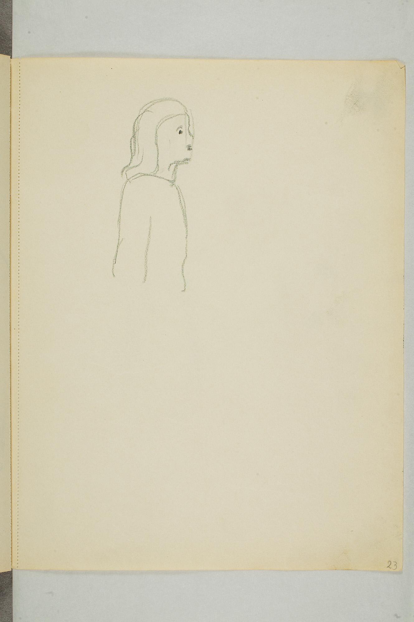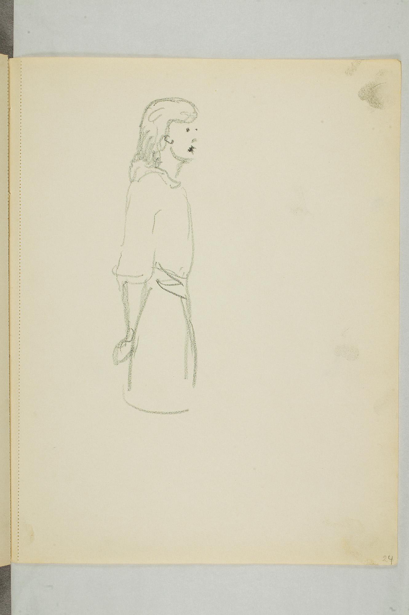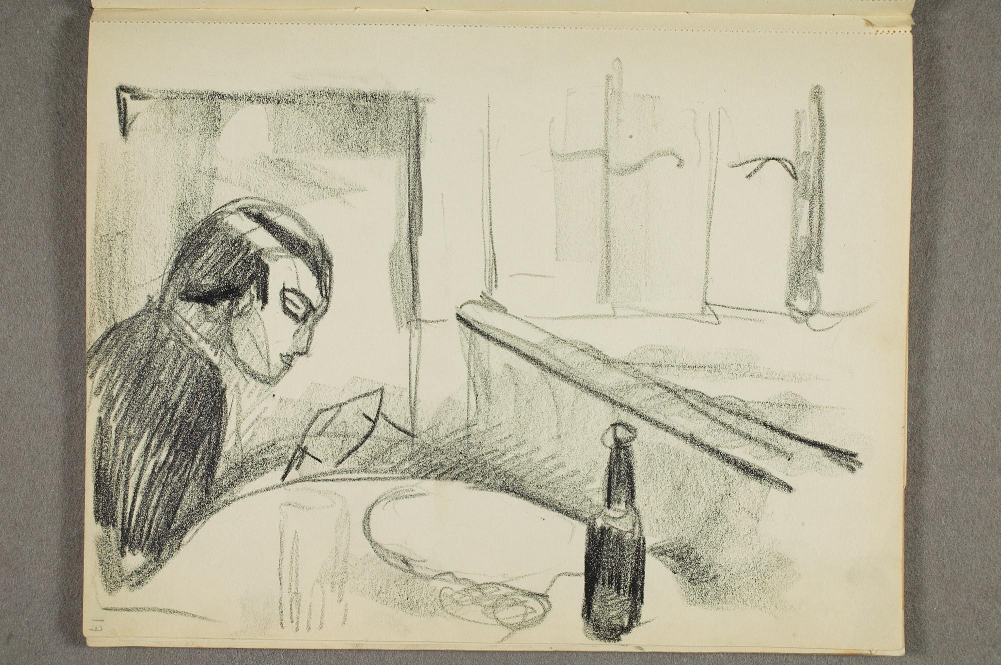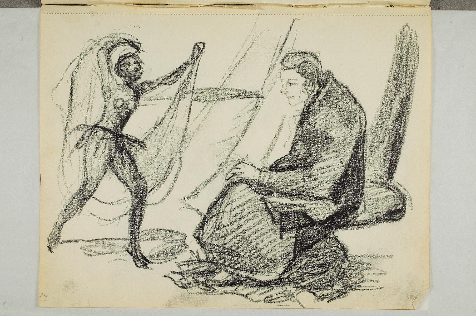 Comment:Skisseboken er av samme type (blå kartong, sort lerretsrygg) og samme mål som MM.T.00198 (1916–20). Flere av tegningene kretser til dels om samme tematikk, som kvinne og mann-motiver, Peer Gynt, eller kabaret. Skissene av den stående kvinnefiguren på side 23 og 24 er lik skissen på side 20 i MM.T.00198–20.