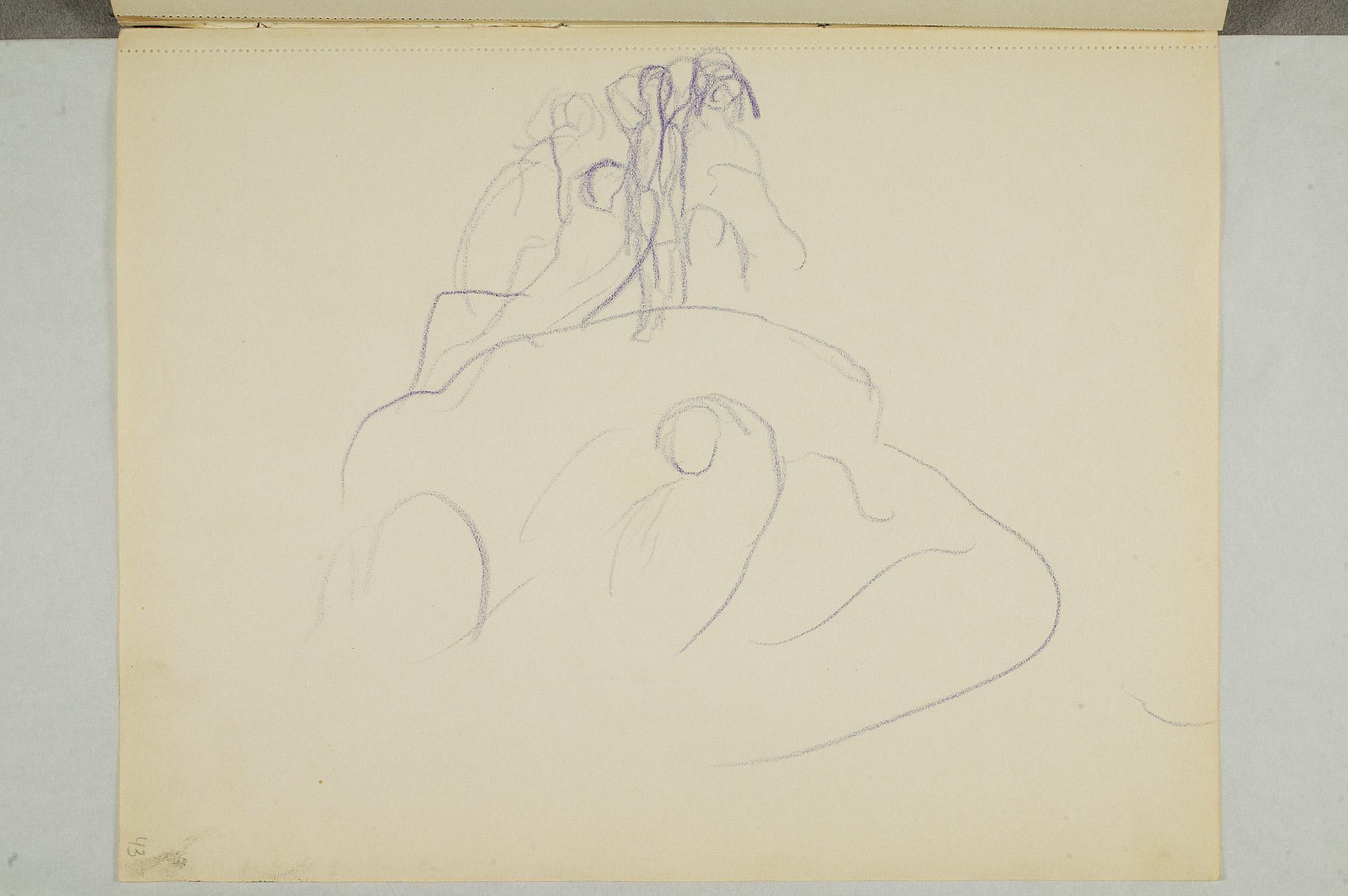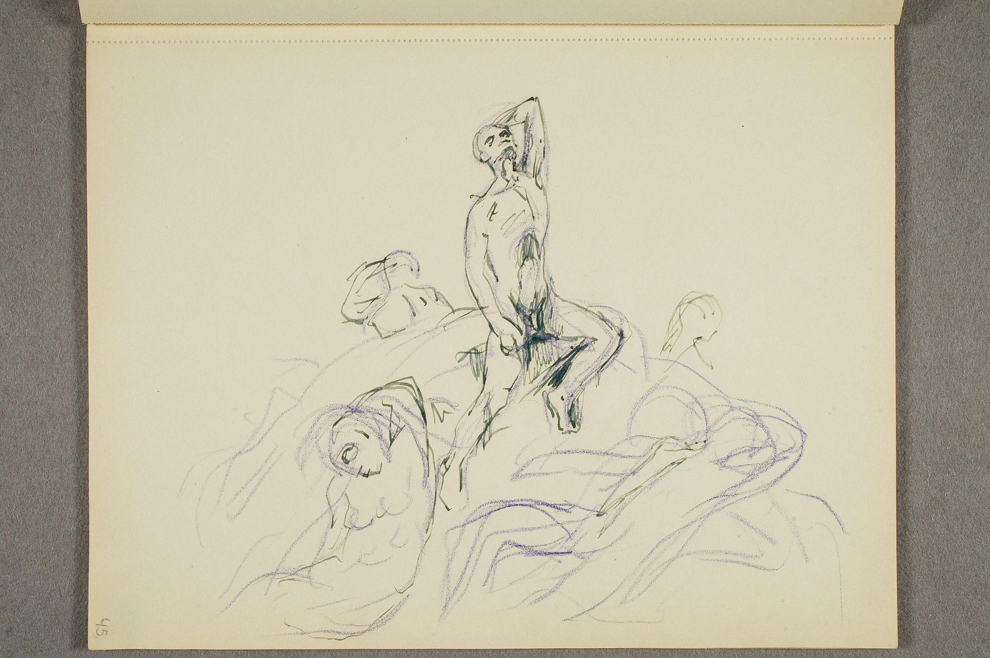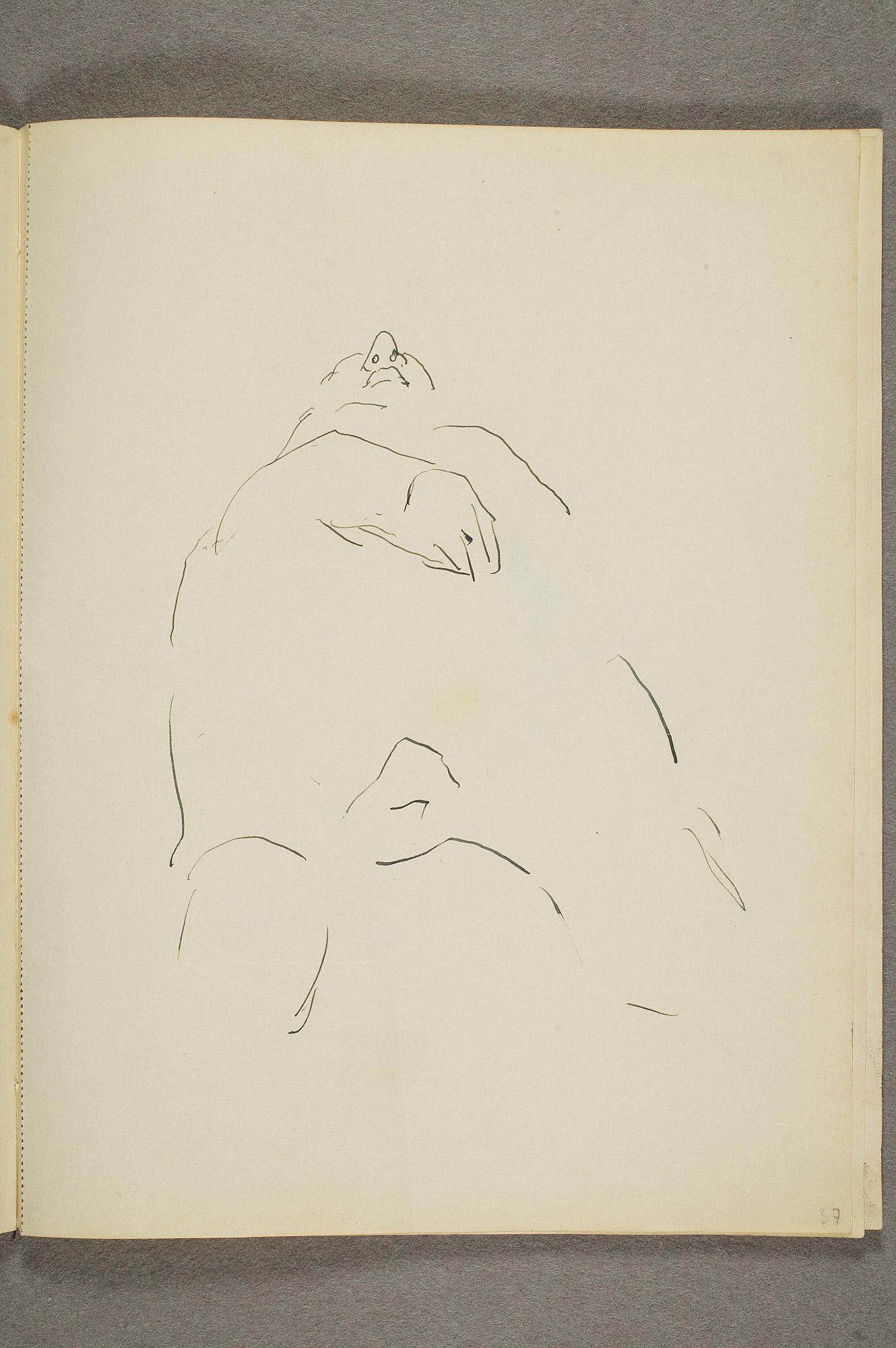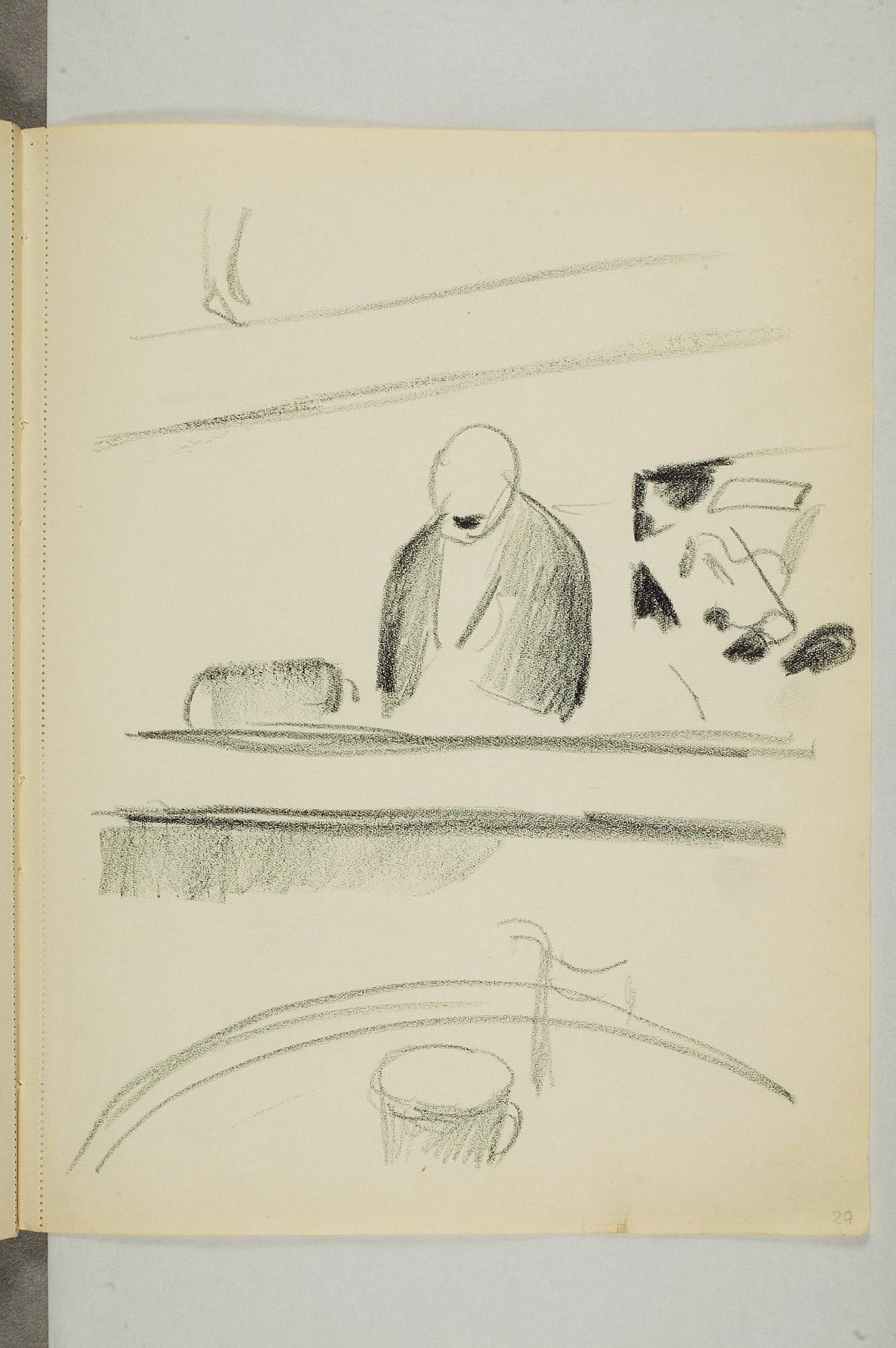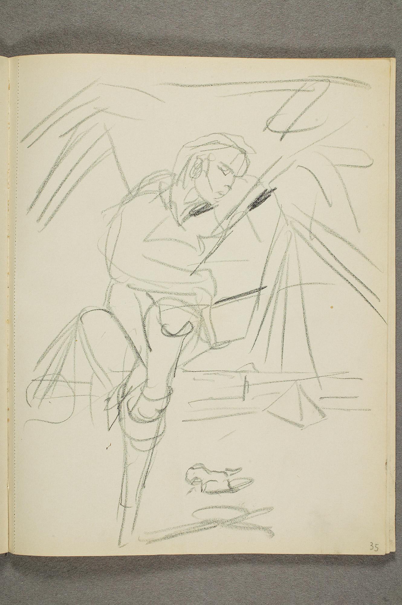 Tegningen av en liggende mann på side 37 minner om skikkelser fra litografiet "I krigen" (MM.G.00502) som er datert 1929, og det kan ikke helt utelukkes at den ble tilføyet senere, men litografiet kan også være basert på skisser gjort under krigen 1914–18. Skisseboken får dateringen 1914–1920. (PP)