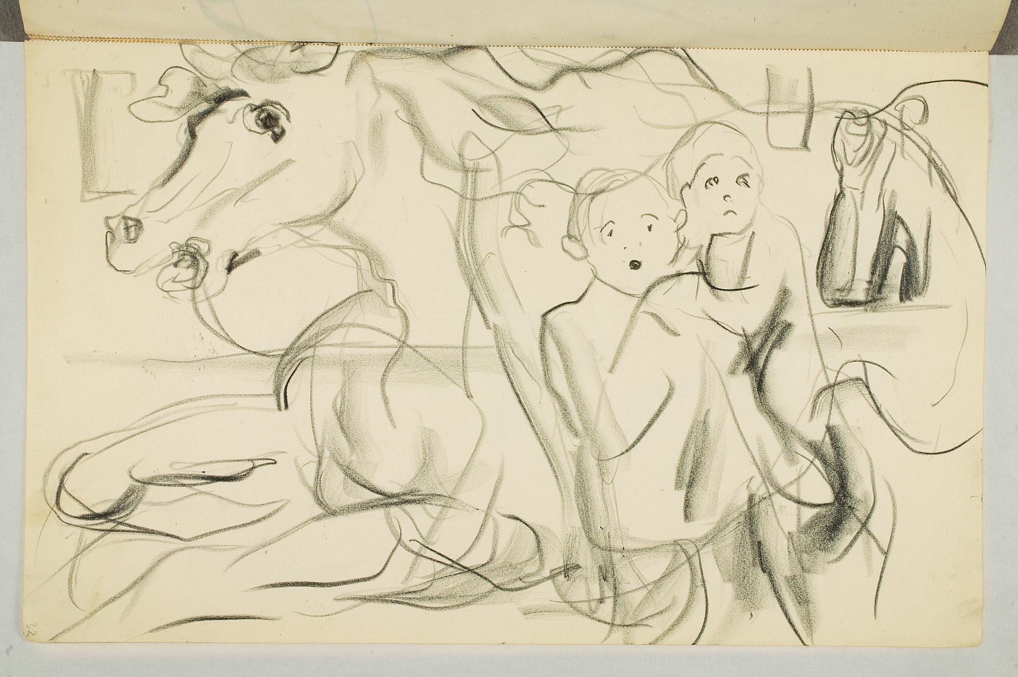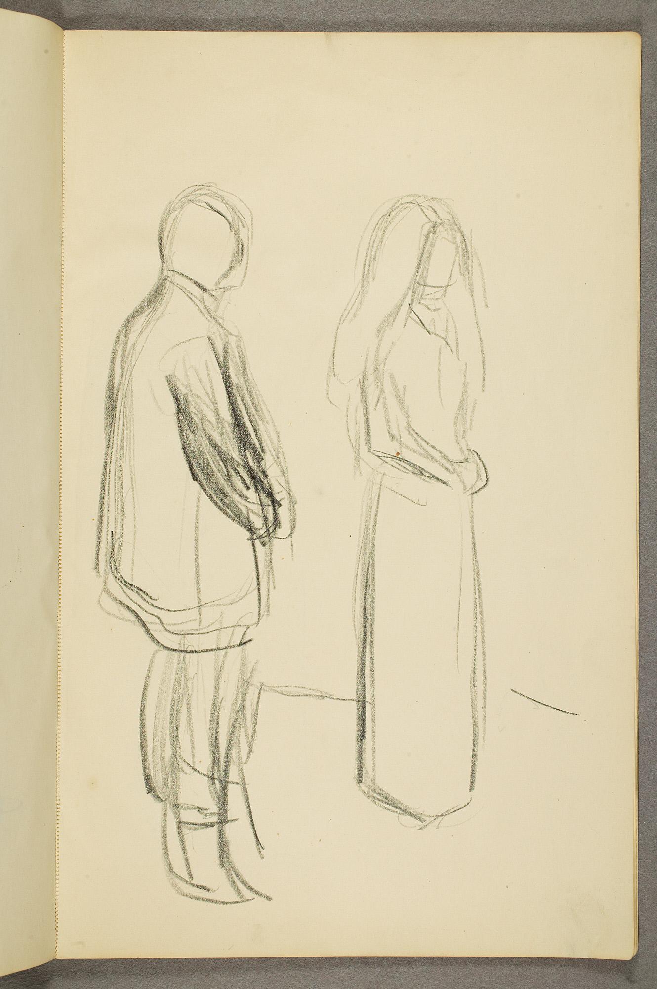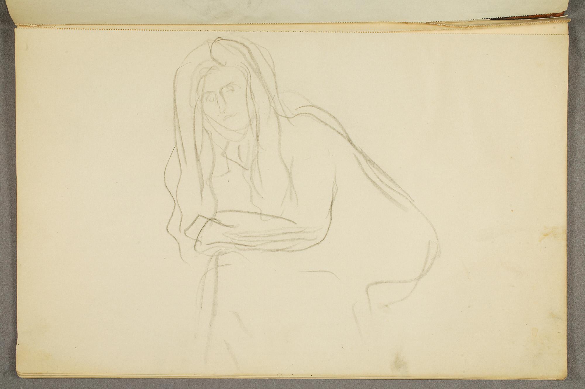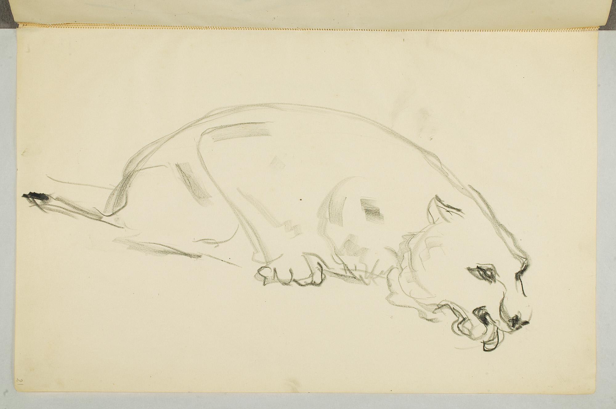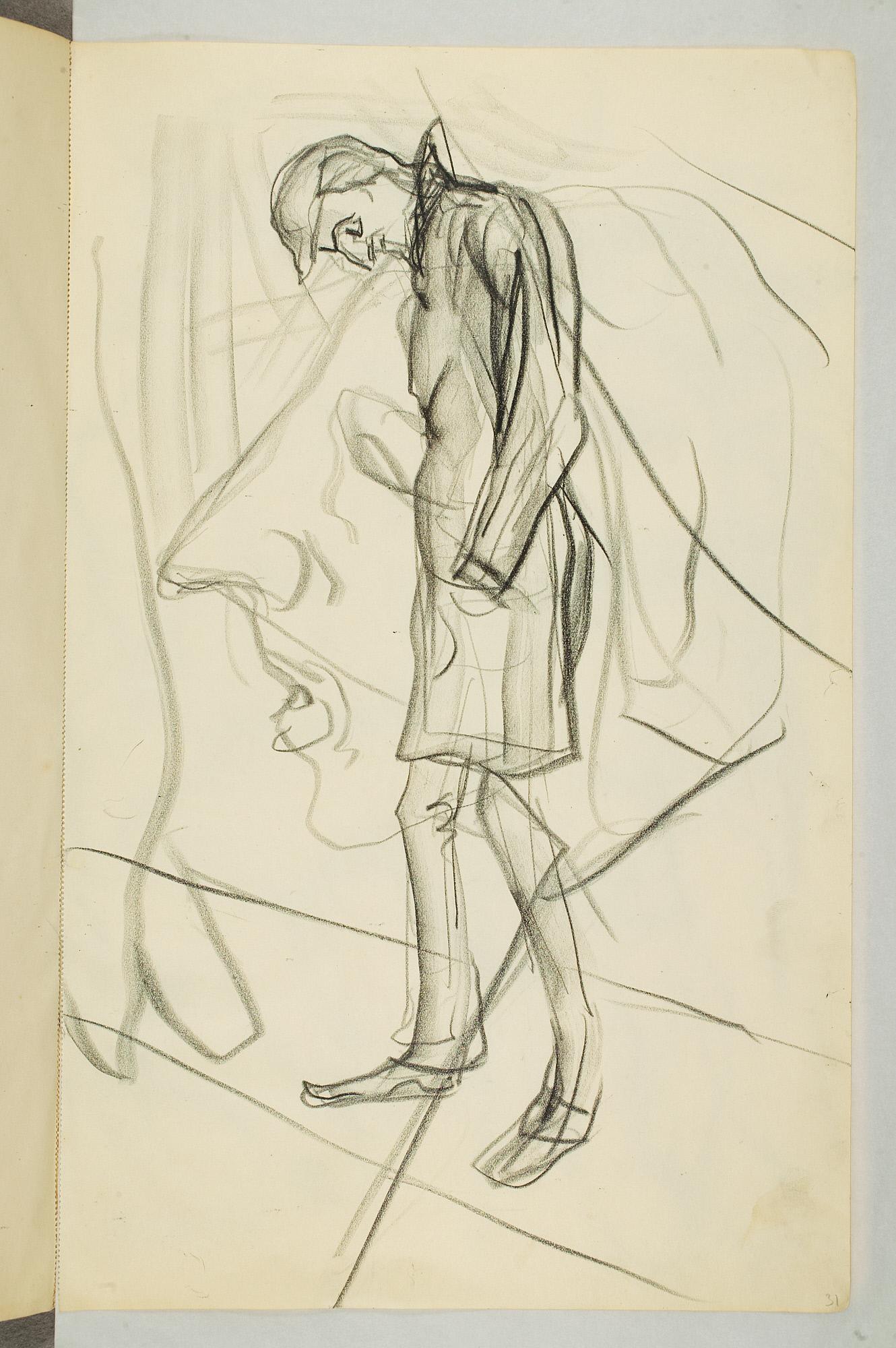 Comment:Påskriften "Regent Place / Zoological / Garden" på siste innside av permen til denne skisseboken viser at den ble brukt i London. Det eneste kjente oppholdet Munch hadde her var i 1913. Selv om bare dyretegningene på side 18 og 21 med stor sikkerhet er utført i London, er det ingen av de andre tegningene som nødvendiggjør en annen datering, og skisseboken som helhet gis 1913 som sannsynlig datering. (MB)