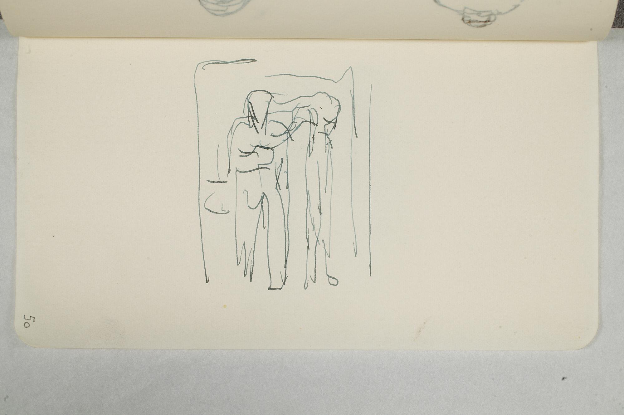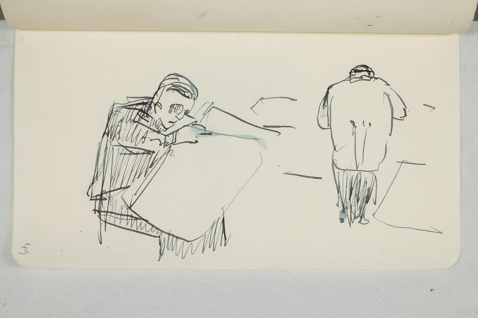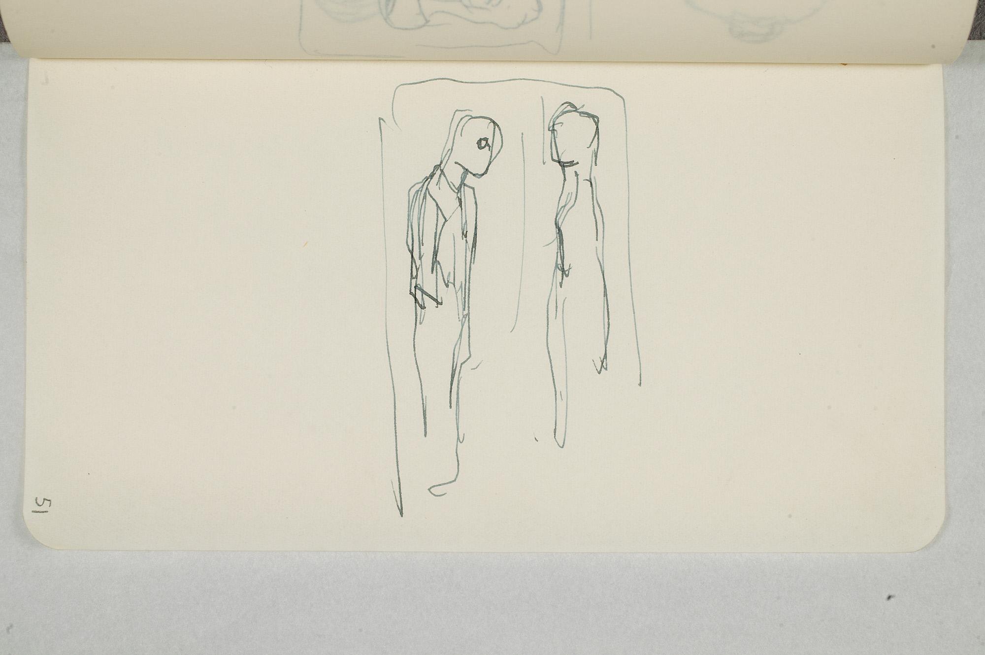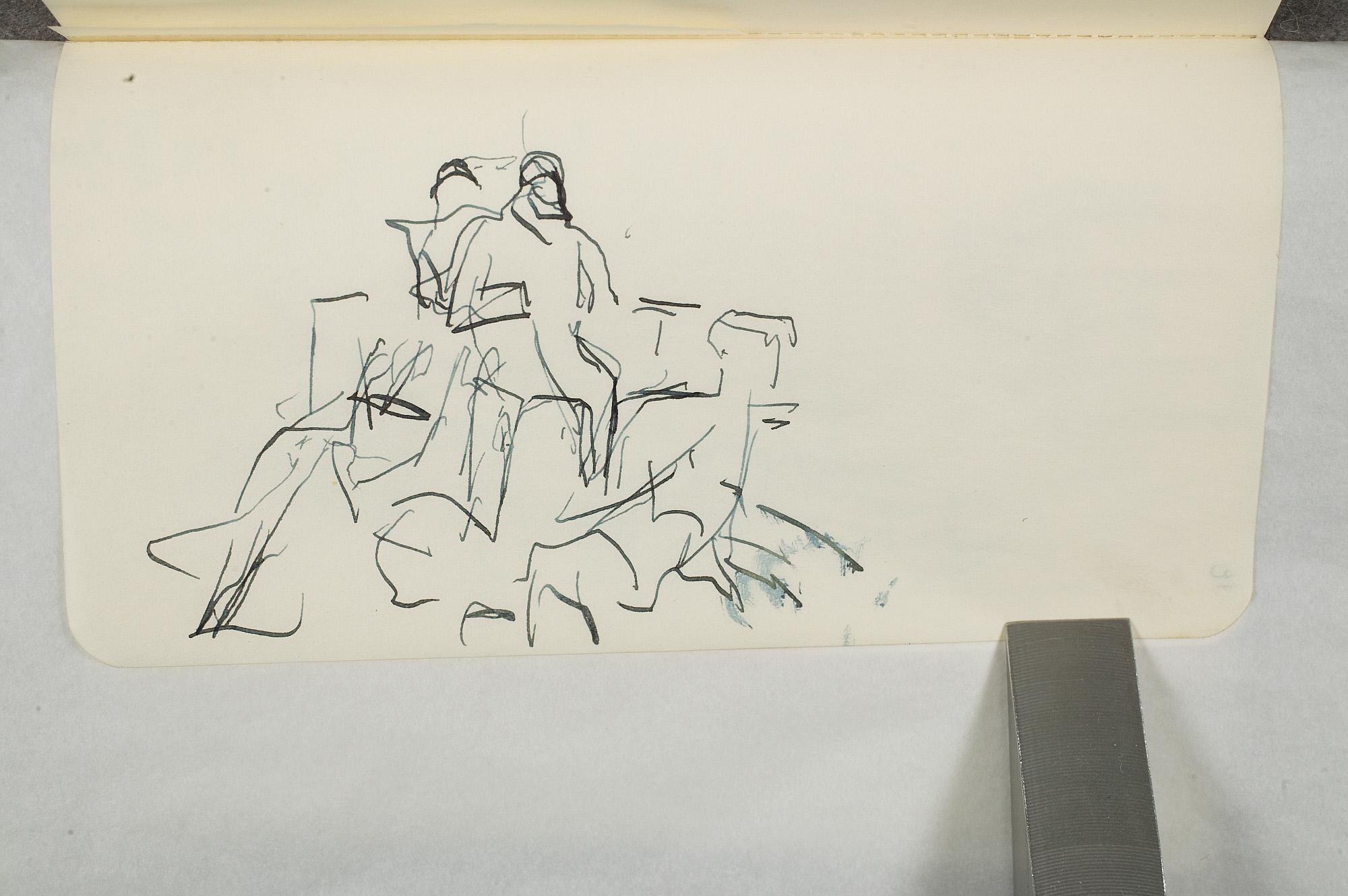 Påbegynt tegning av sittende mann og stående kvinne